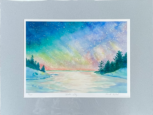 "Winter Sky" – Lake Huron Northern Lights Matted Watercolor Print