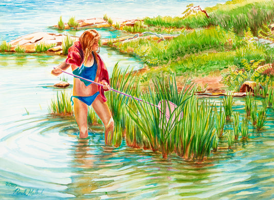 "Frogging", Girl with Pink Minnow Net Watercolor Print | Georgian Bay