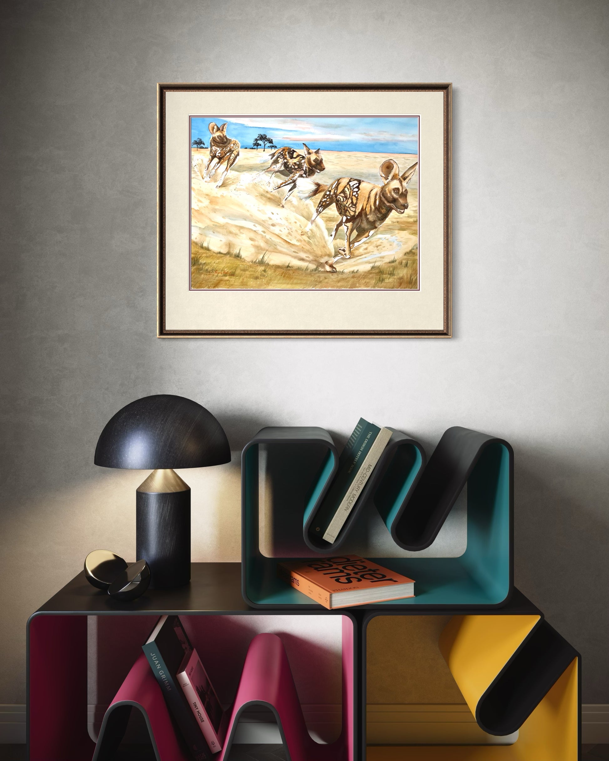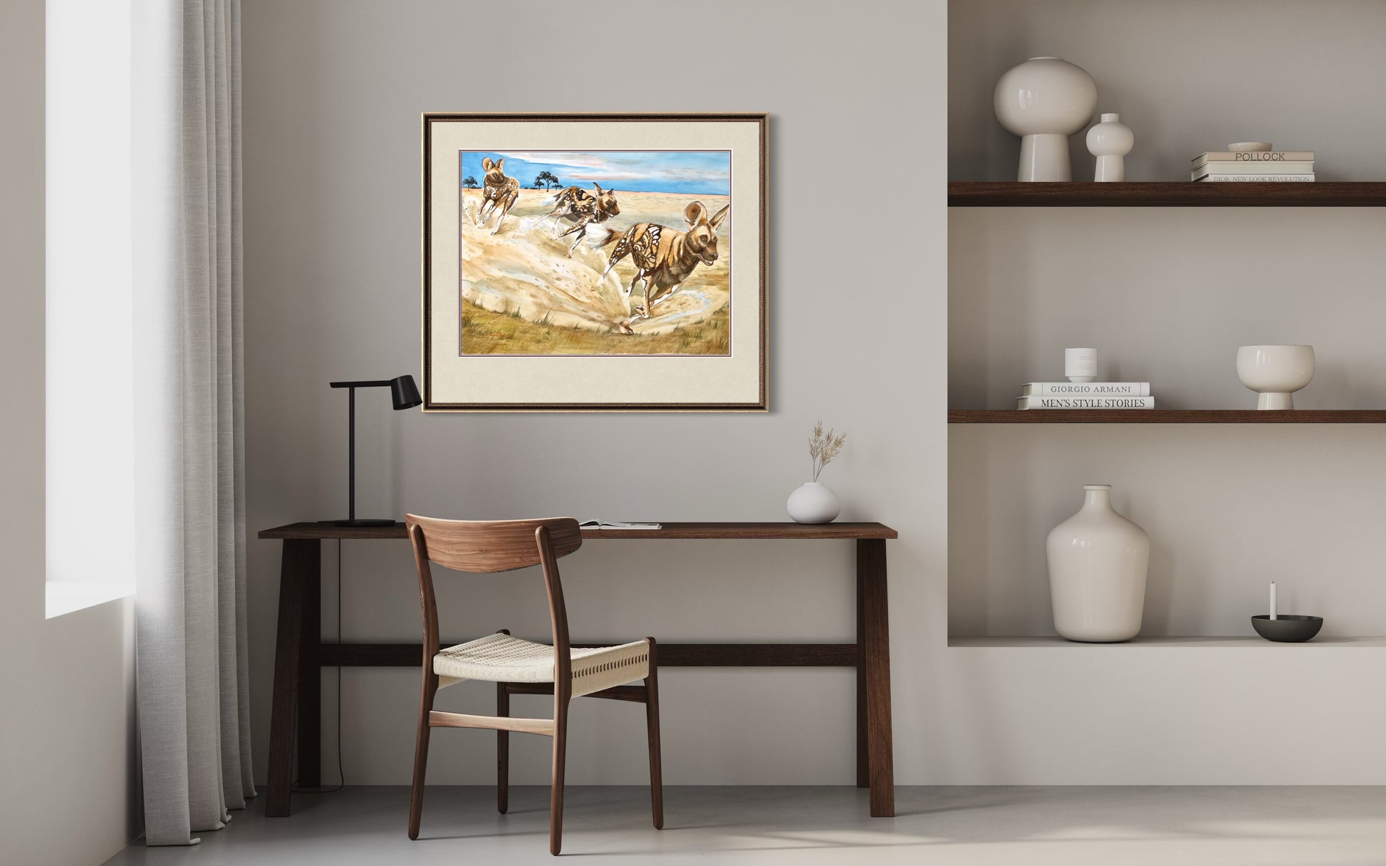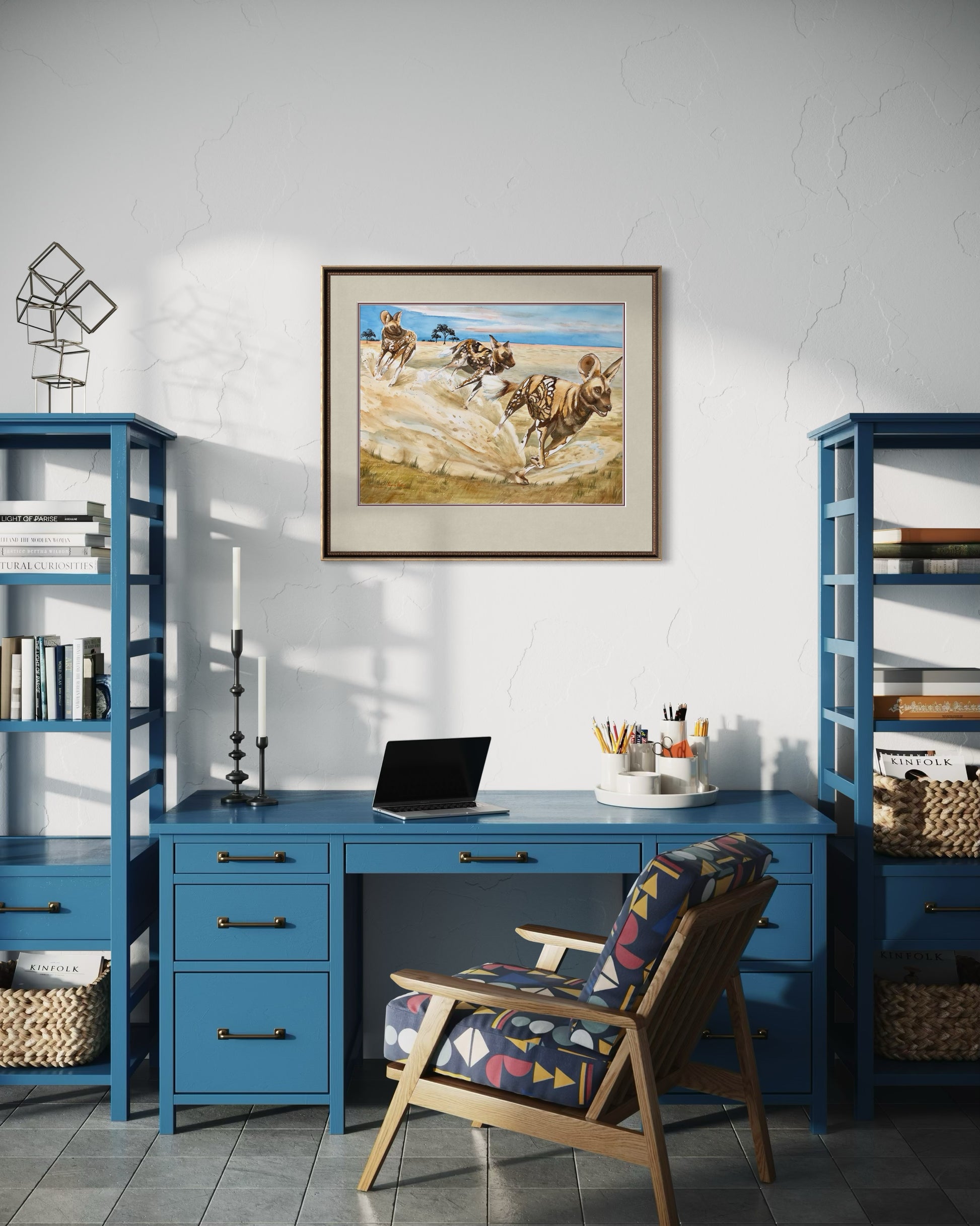 Dynamic and bold, African Painted Dogs celebrates the spirit of one of Africa’s most fascinating animals. Known for their striking calico coats of sable, cocoa, sienna, black, and white, these wild dogs are a feast for the eyes.