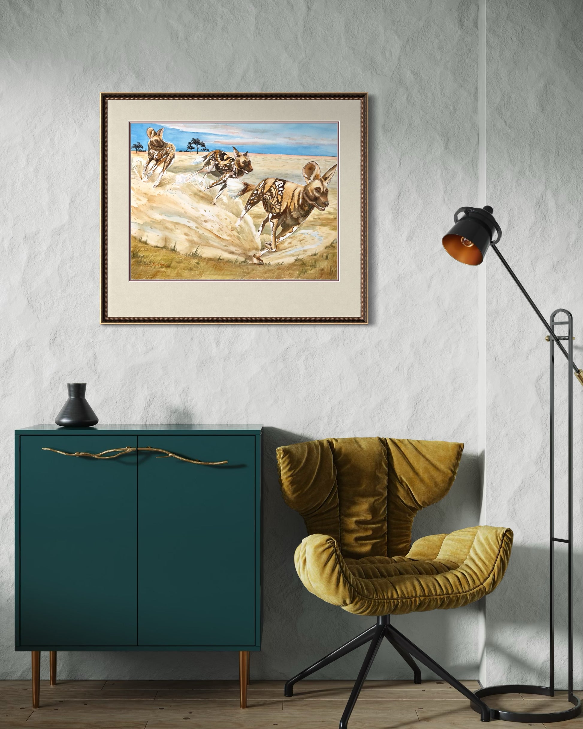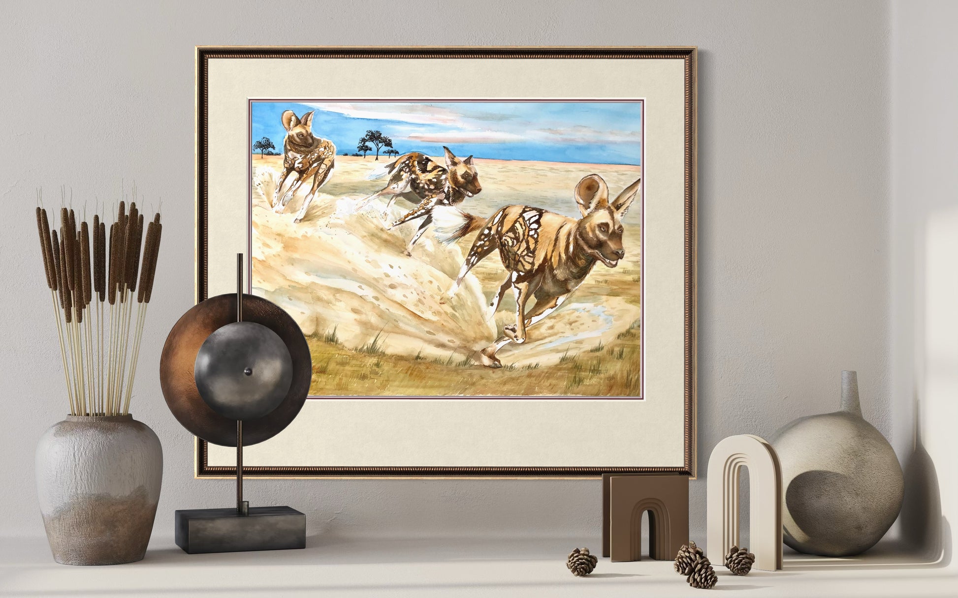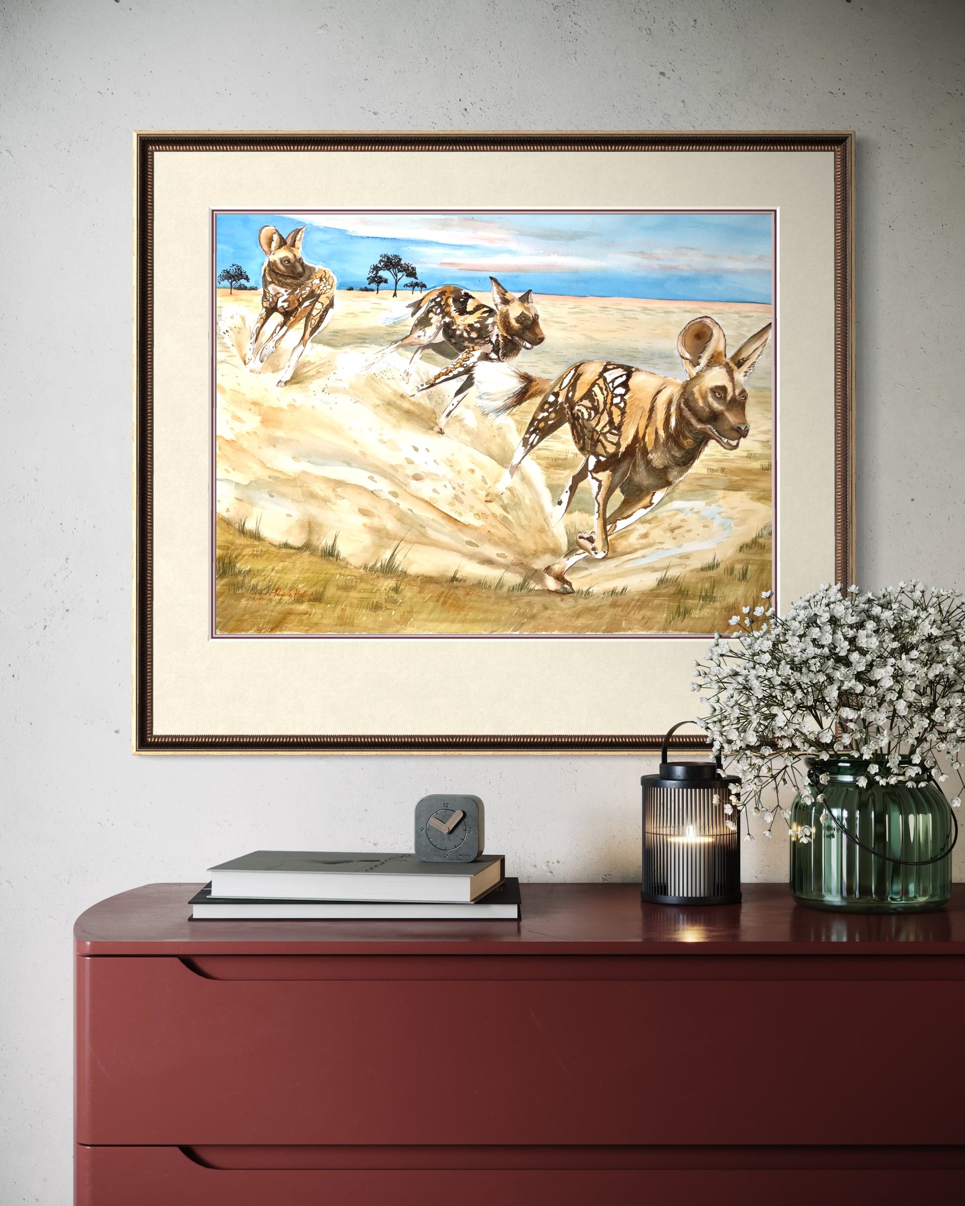 In this artwork, the pack runs together with energy and grace, showcasing their incredible unity, teamwork, and social bonds. Their movement reflects both strength and joy, capturing the beauty of community and the power of survival in the wild. This piece is perfect for lovers of wildlife art, African animal prints, or collectors of big game fine art.