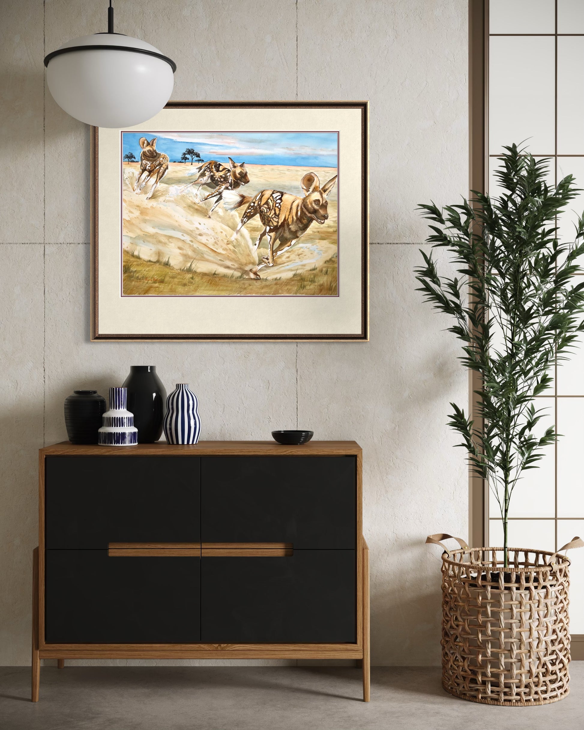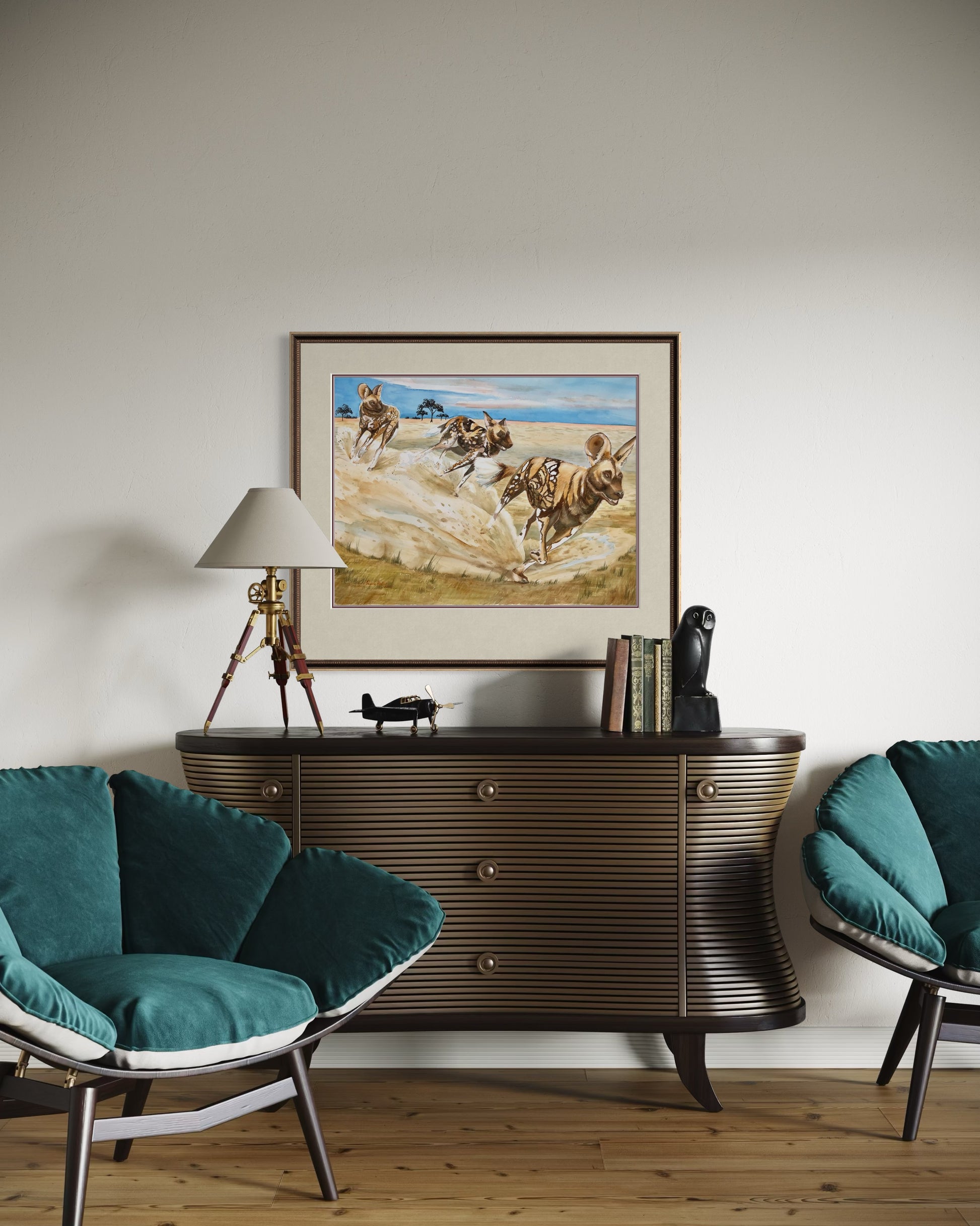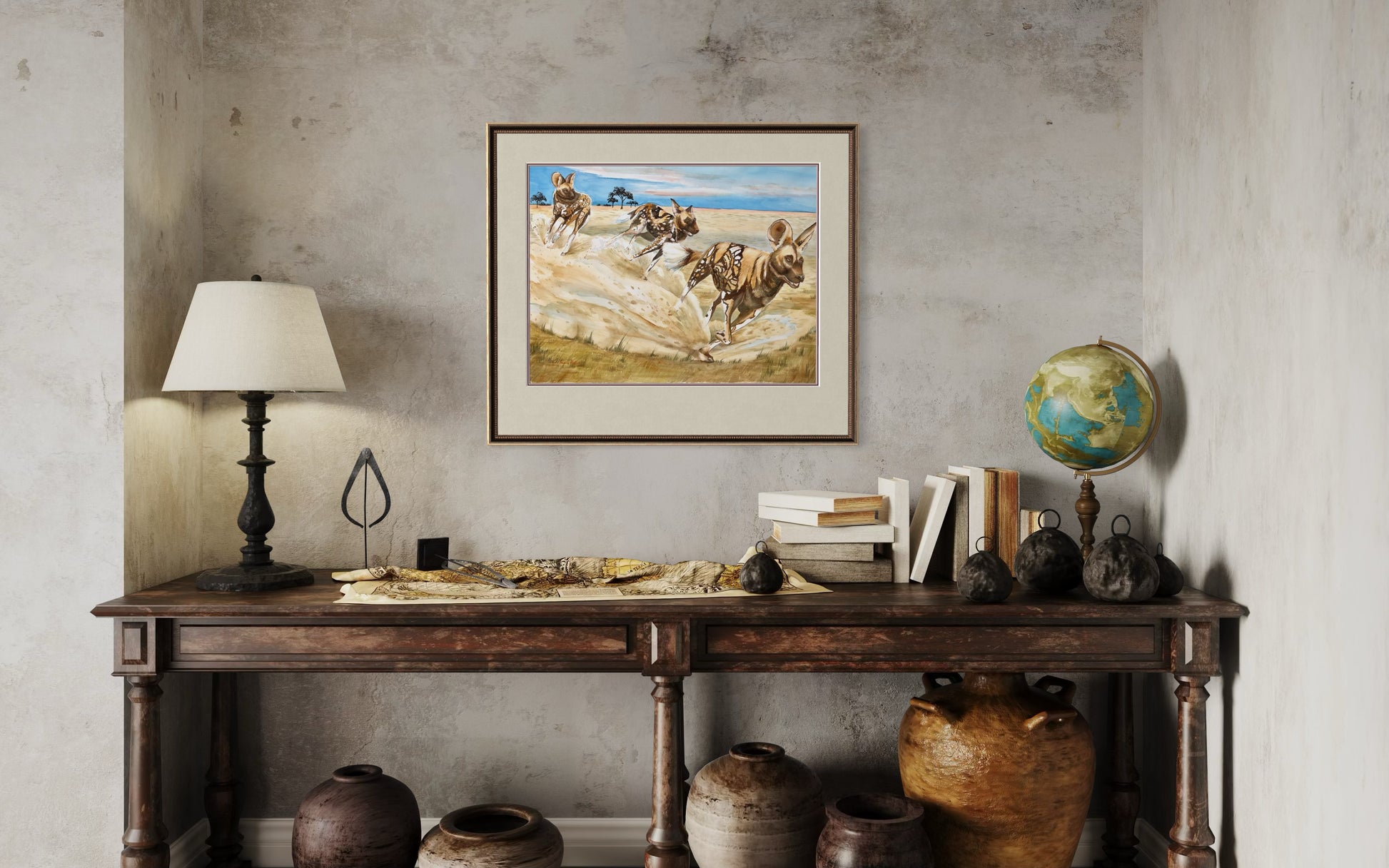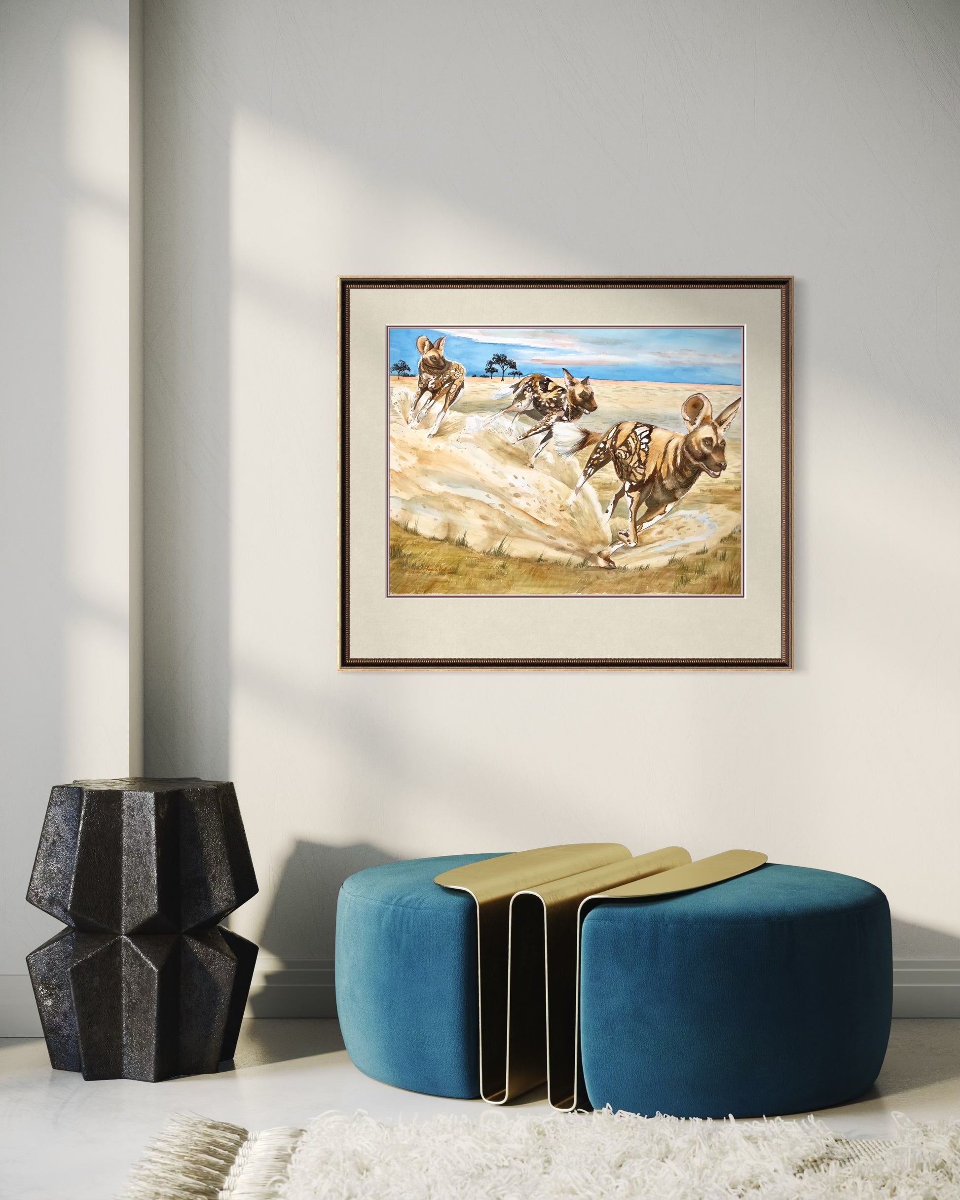 In this artwork, the pack runs together with energy and grace, showcasing their incredible unity, teamwork, and social bonds. Their movement reflects both strength and joy, capturing the beauty of community and the power of survival in the wild. This piece is perfect for lovers of wildlife art, African animal prints, or collectors of big game fine art.