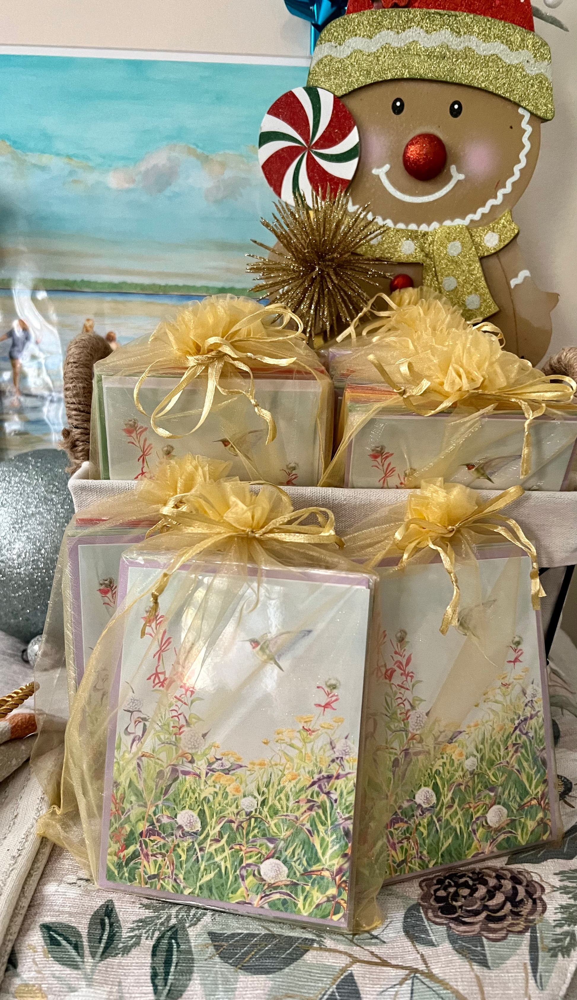 Your note card set is thoughtfully wrapped in a festive sheer gold organza gift bag, ready for gifting or personal use.