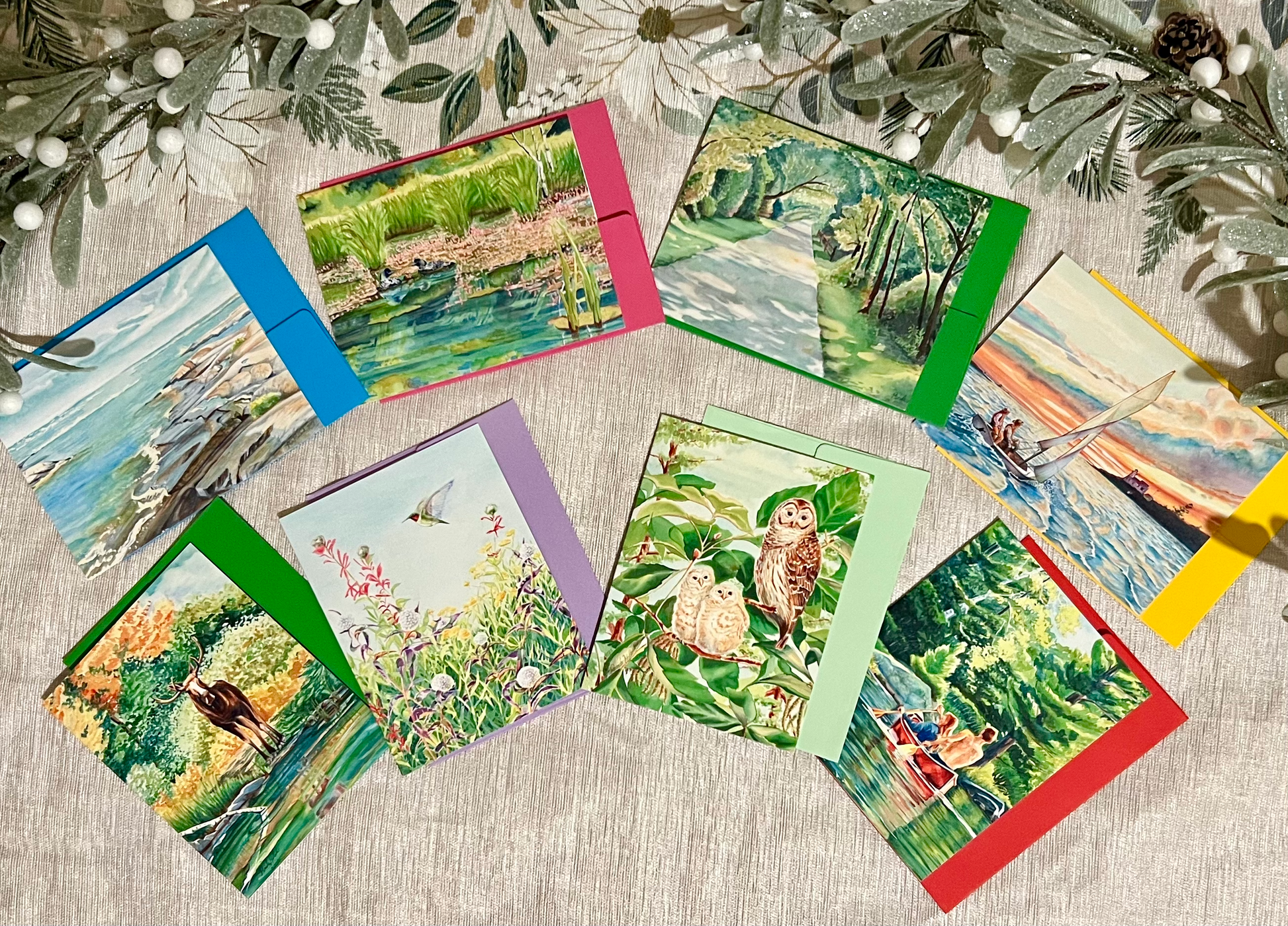 Set of 8 folded note cards, each featuring a unique watercolor image