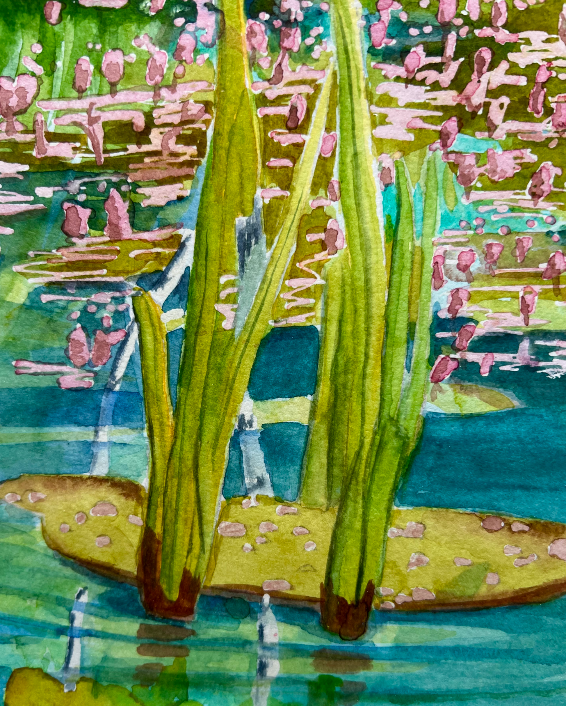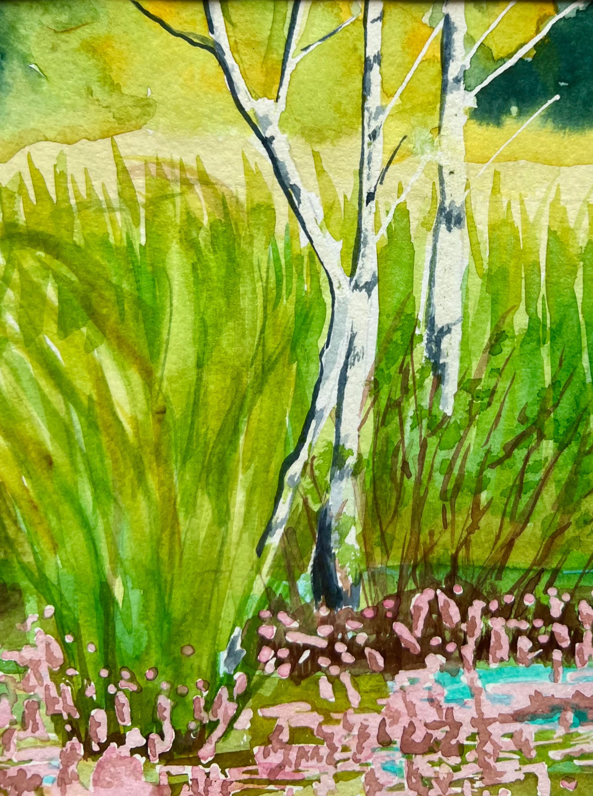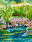 Peaceful and heartwarming, Baby Loon captures a tender family moment in a sunlit bay. The fuzzy brown chick glides gently between its parents, exploring blooming water plants as they watch over with care. Painted in bright, cheerful hues of blue water and warm light, this matted watercolor print celebrates the beauty of nature and the preciousness of family bonds.