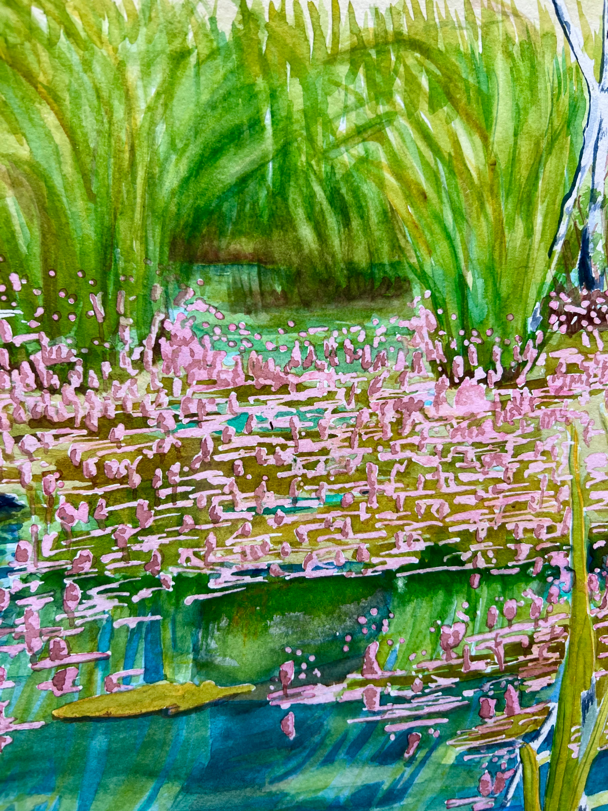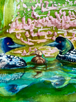 This heartwarming painting depicts a loon family bonding in a sunny, tranquil bay. The fuzzy brown baby loon swims gracefully between its loving parents in bright, clear blue water. The baby loon playfully explores blooming water plants, adding a touch of energy and liveliness to the scene. The bright and sunny colors used in the painting add to the cheerful and uplifting mood of the piece, making it a beautiful portrayal of nature's bond and the preciousness of family.