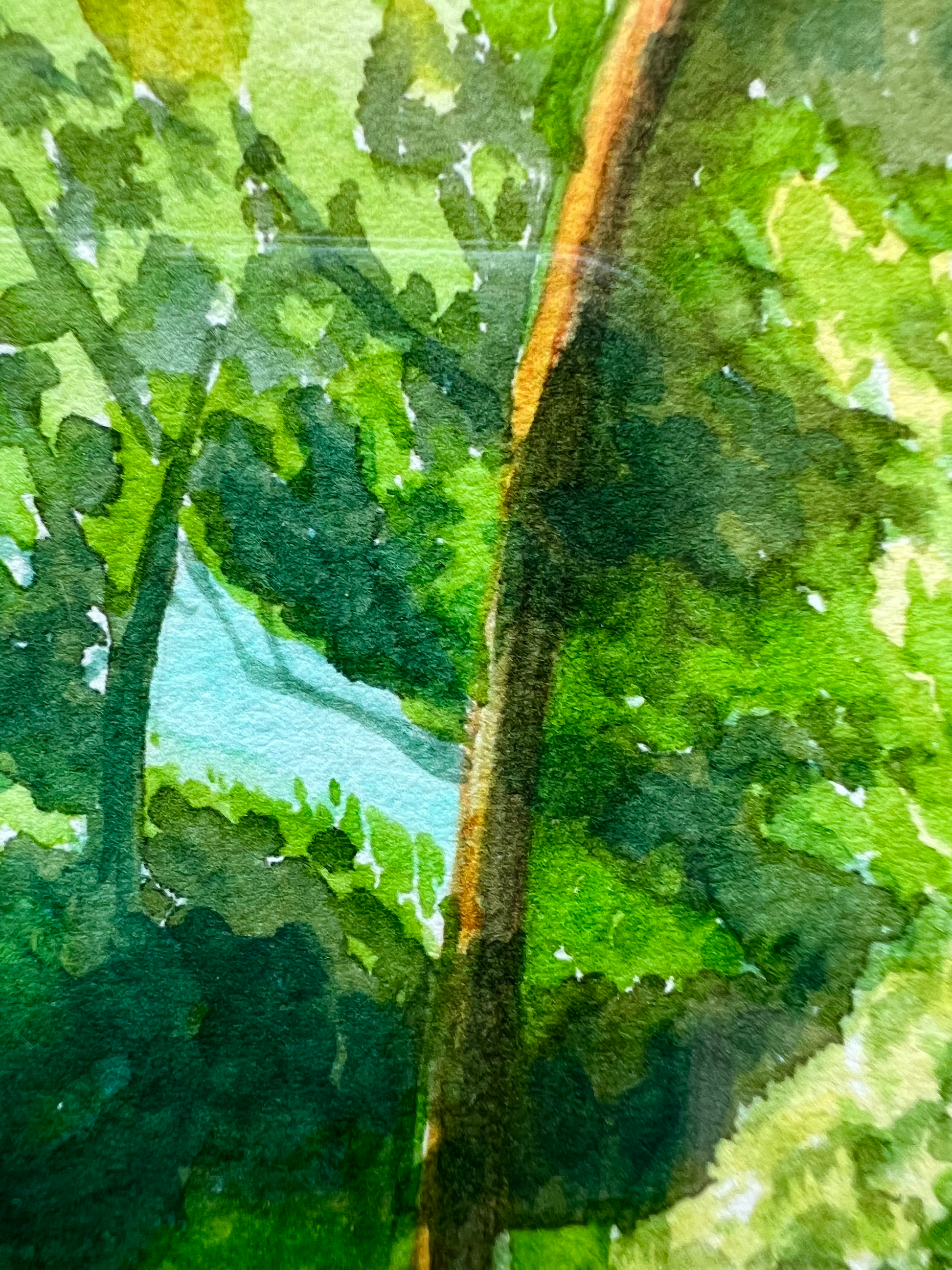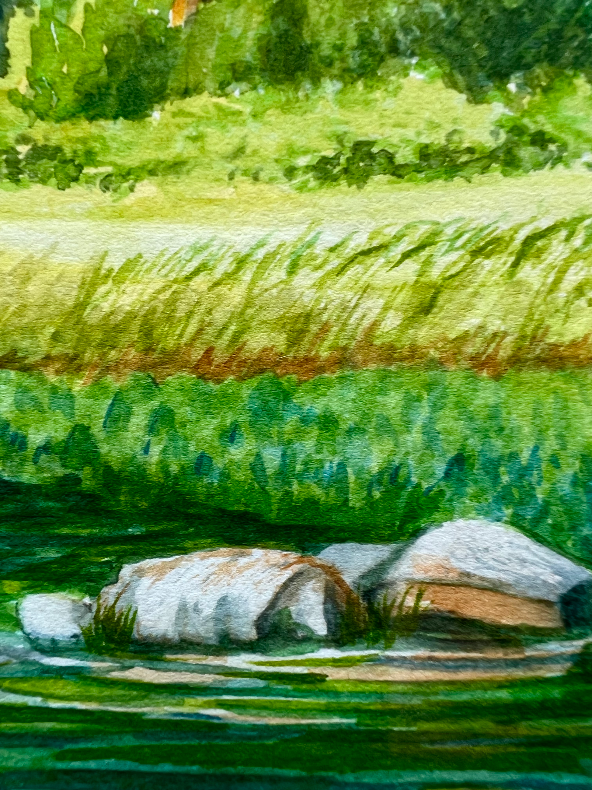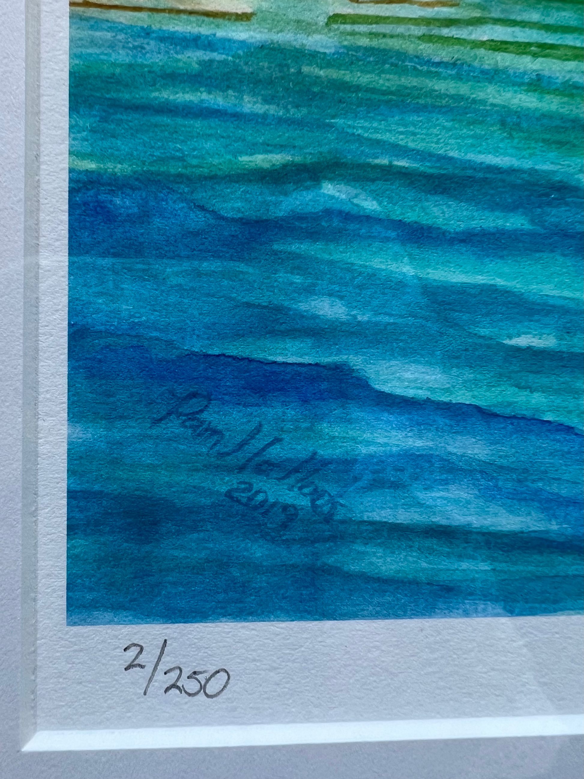 This Fine Art Giclée Print is professionally matted and framed using archival materials. It is presented with a top mat that enhances the watercolor’s natural palette and set in a light walnut wooden frame with visible grain for a timeless look. The back is fully sealed and finished, giving the piece a gallery-quality presentation.