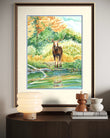 The still water at his feet reflects his towering form, while golden sunlight filters through the trees, illuminating the scene with warmth and magic. This artwork embodies the wild spirit of North America’s great forests, celebrating the strength, beauty, and mystery of one of the continent’s most iconic animals.