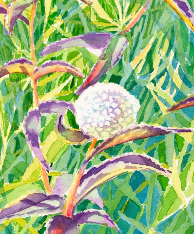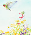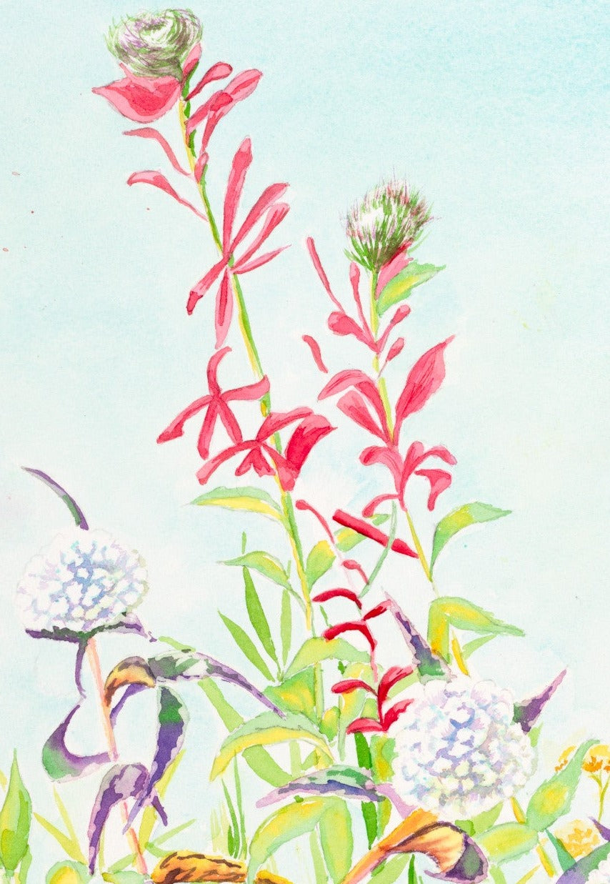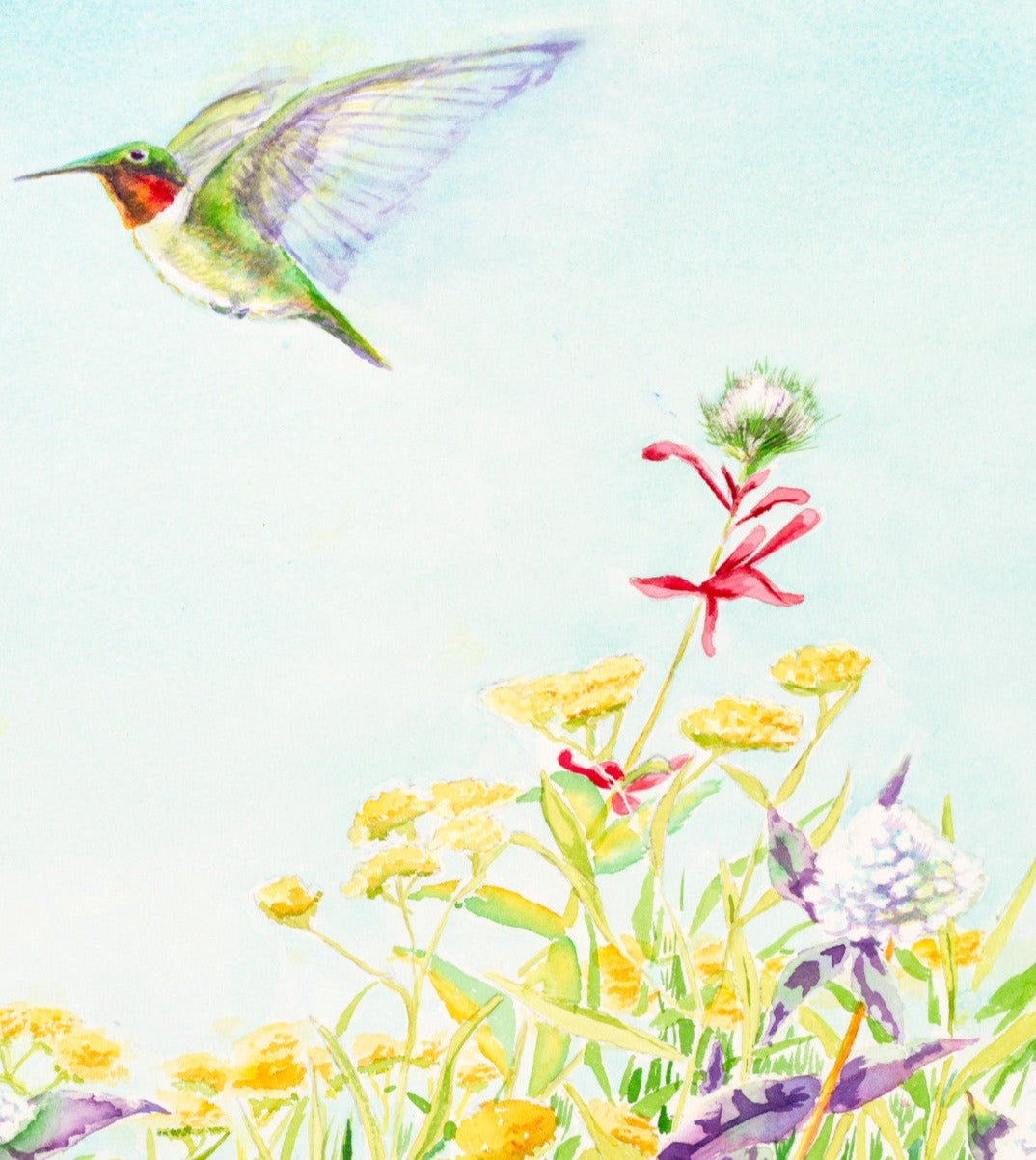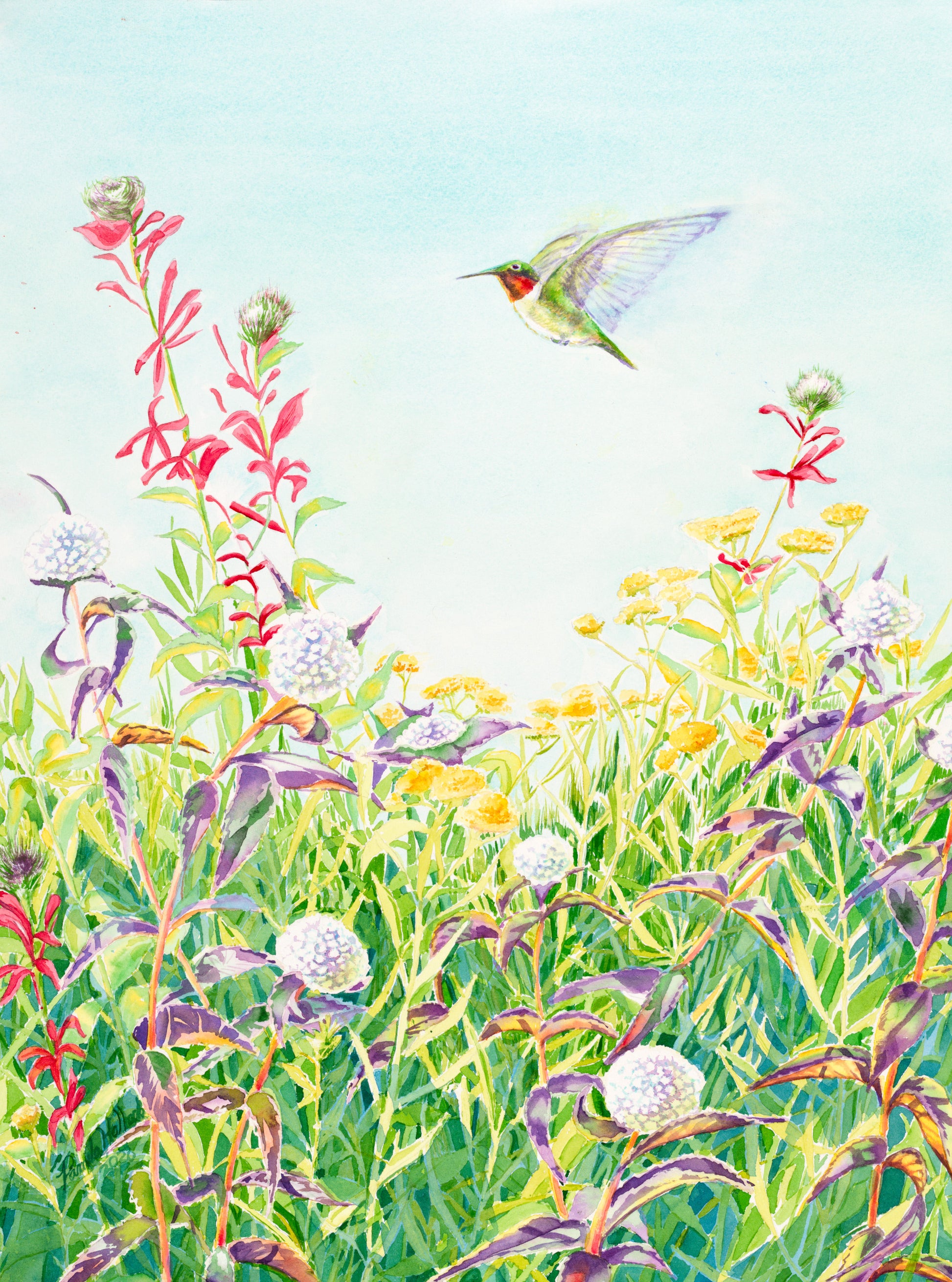 Get ready to be enchanted by this whimsical garden painting! Bursting with color and life, the garden is a riot of wildflowers, including red Indian paintbrush, wild thistle, and Queen Anne's Lace. Hovering delicately amidst this magical scene is a Ruby-Throated Hummingbird, flitting from flower to flower. It's a joyful tribute to the beauty of nature and a reminder to appreciate the little things that bring us happiness. This painting invites us to lose ourselves in the wonder of the natural world and take pleasure in life's simple pleasures.