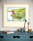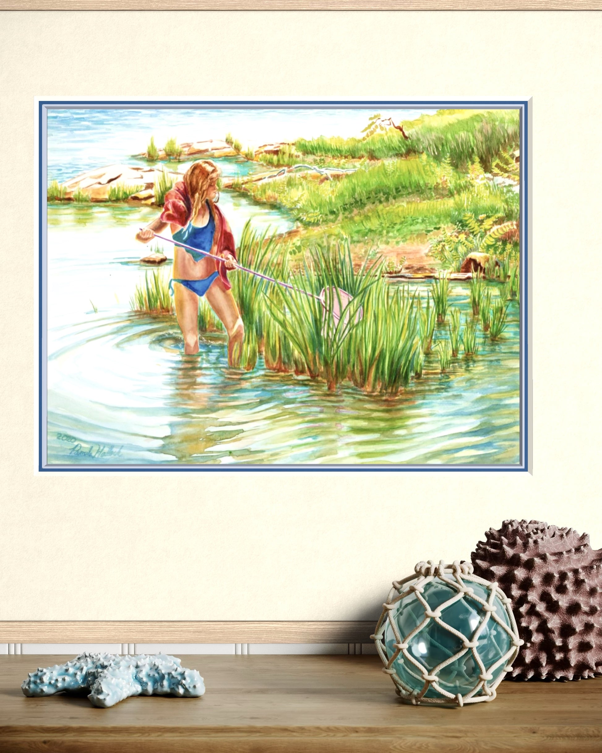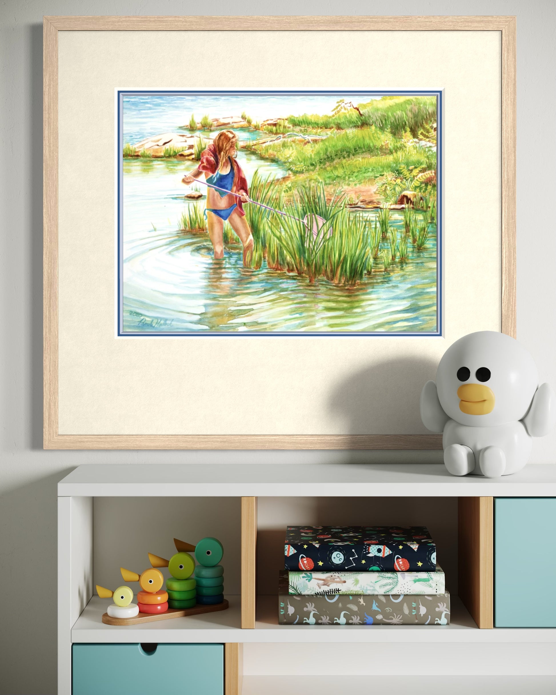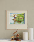 "Frogging", Girl with Pink Minnow Net Watercolor Print | Georgian Bay