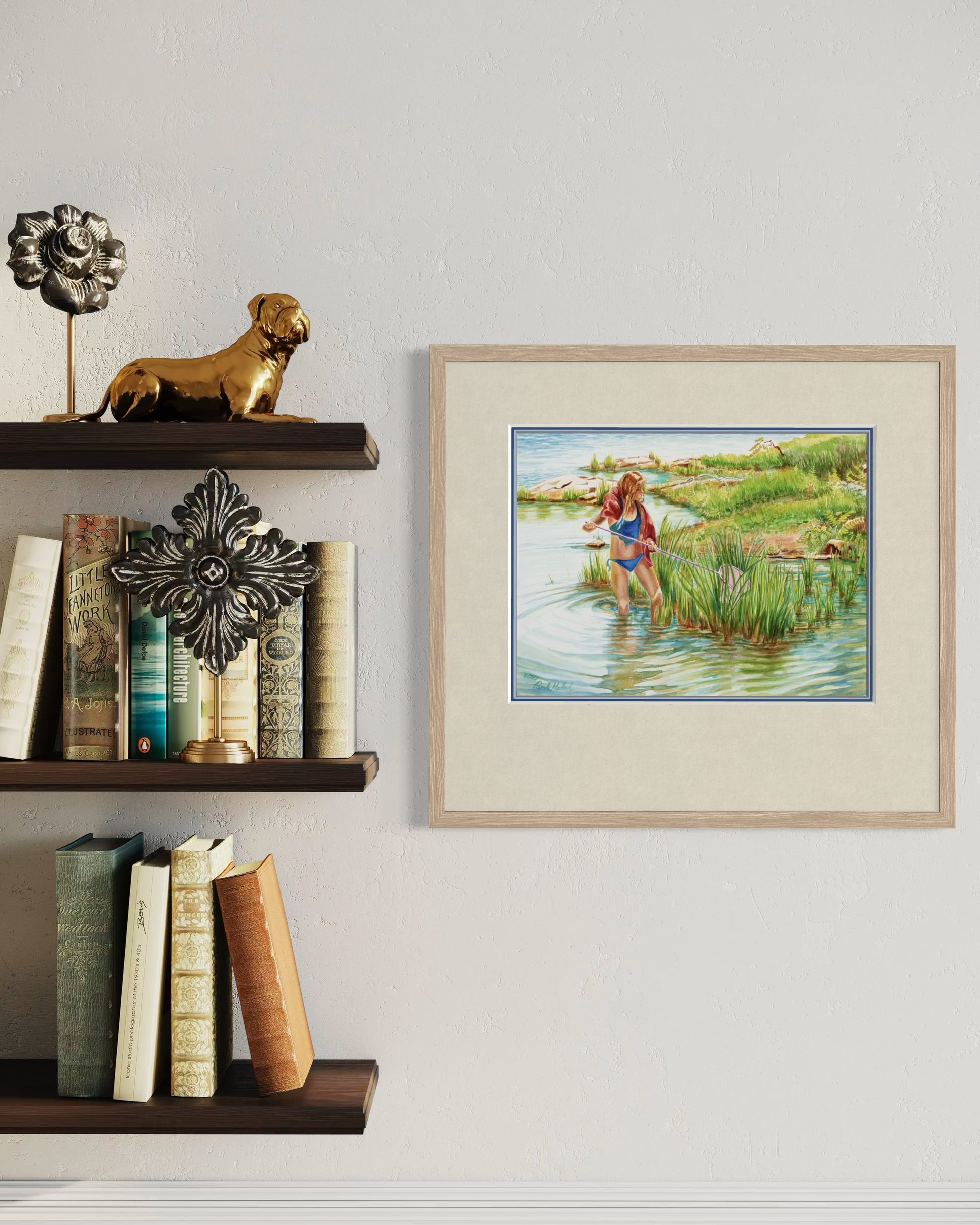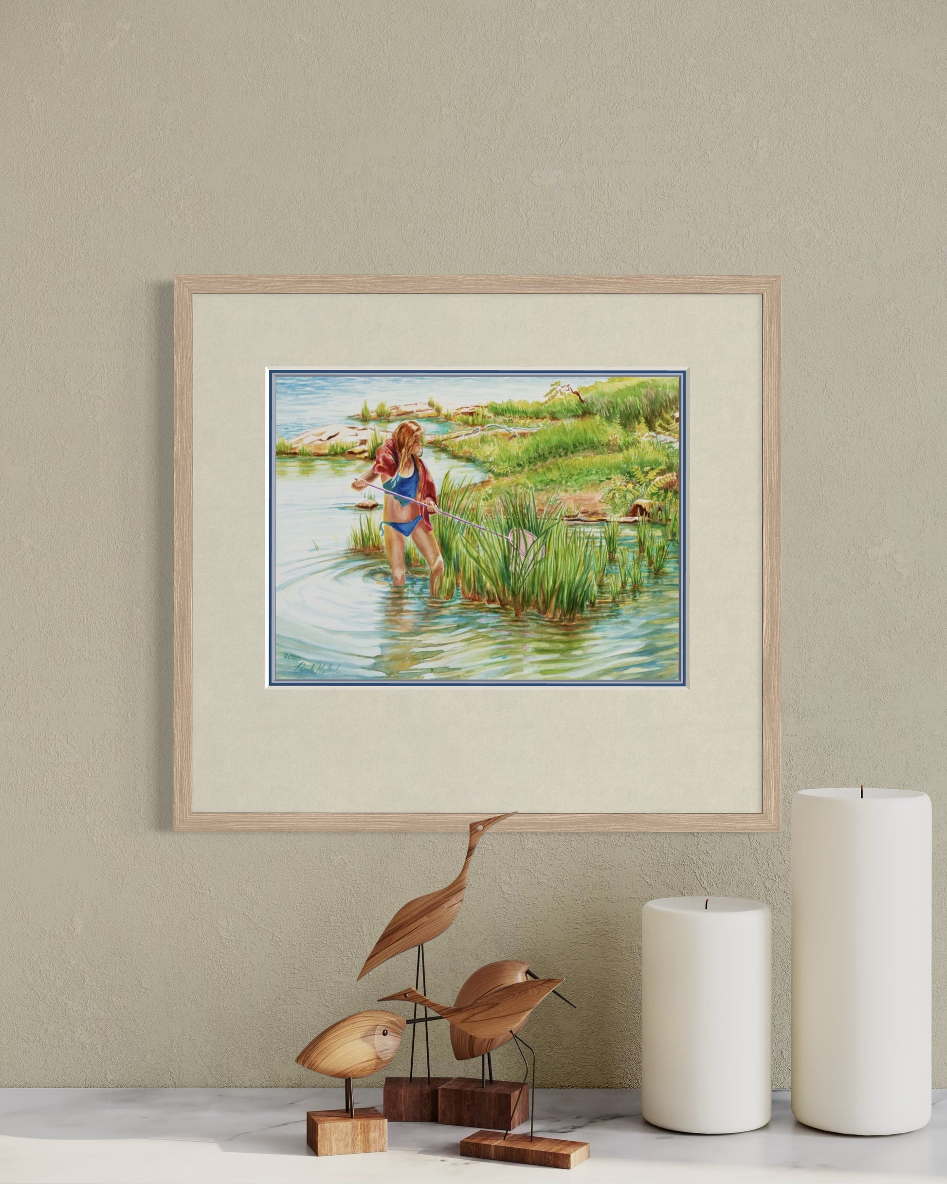Playful and adventurous, Girl with Pink Minnow Net captures the carefree joy of childhood summers on Georgian Bay, Lake Huron. A preteen girl, towel draped around her neck, stands at the water’s edge with her giant pink net, determined to catch frogs, crawdads, or any hidden treasures among the reeds.