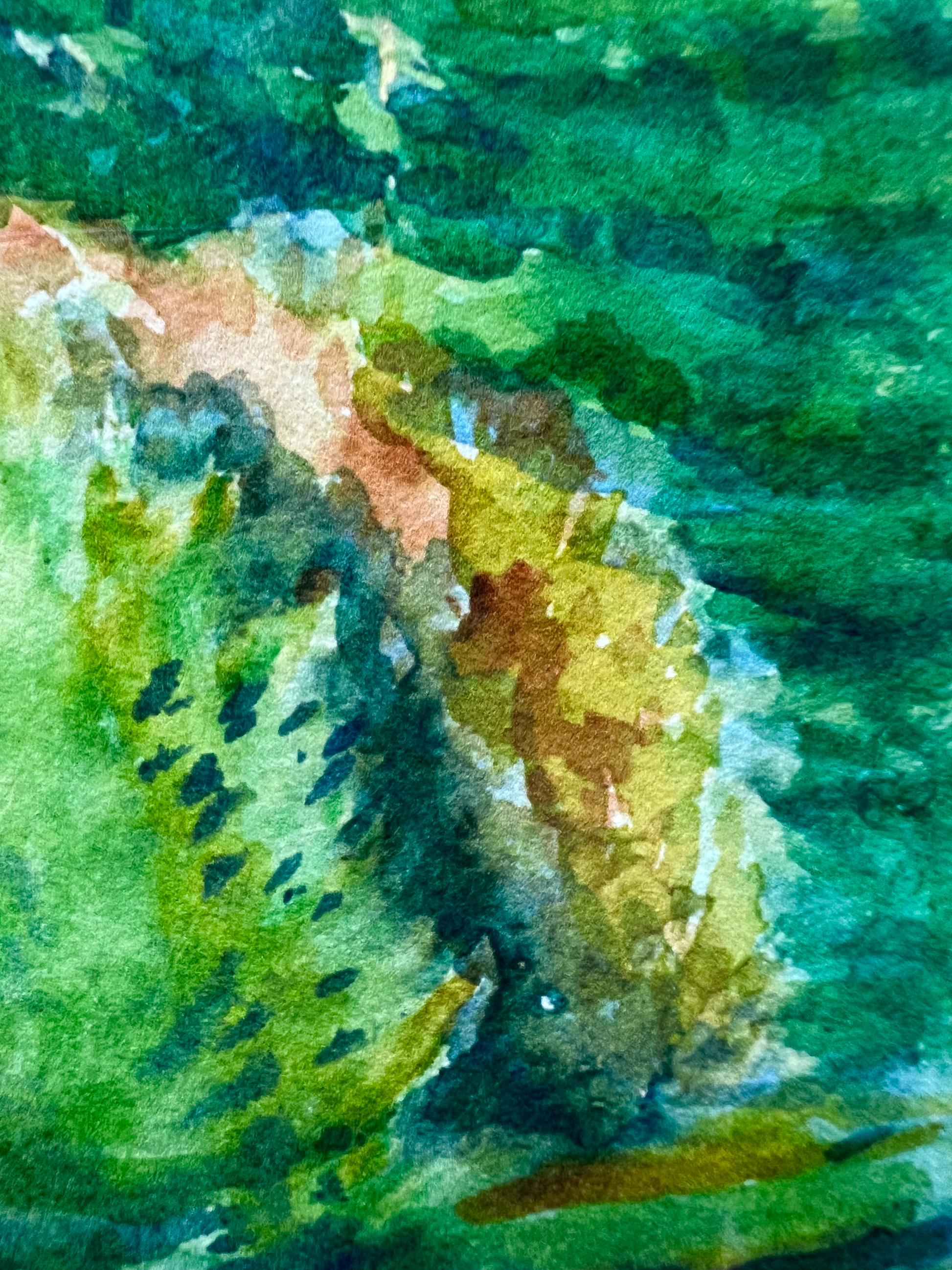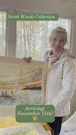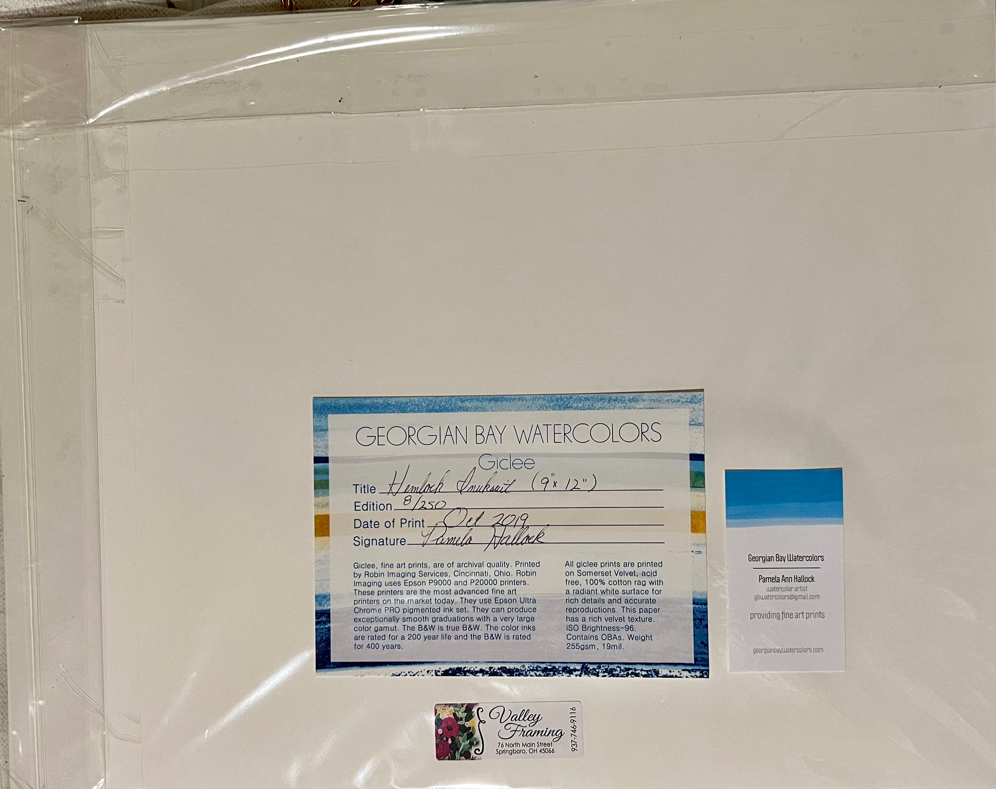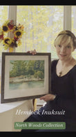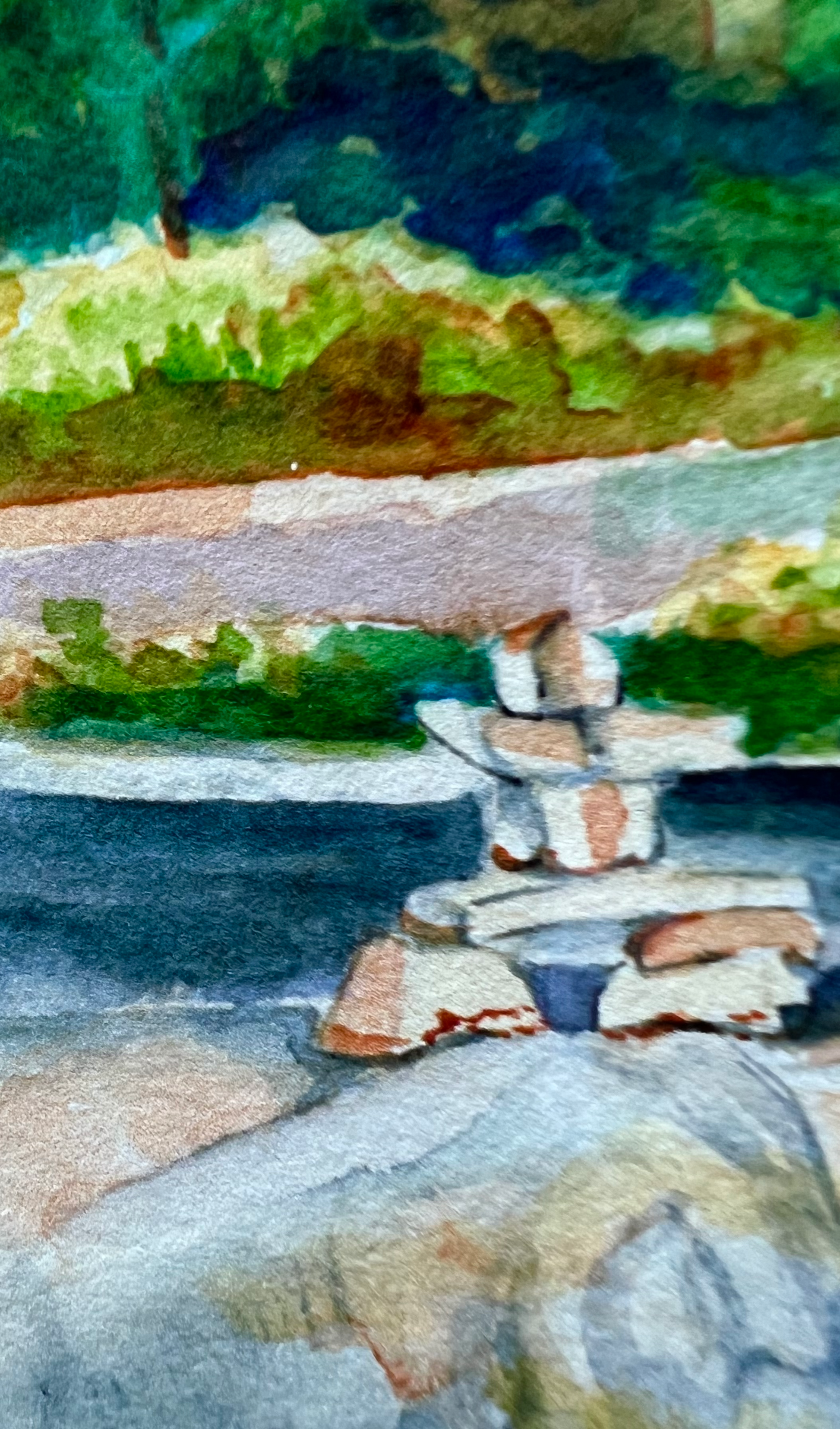 Experience the serene beauty of Georgian Bay with Hemlock Inuksuit. This watercolor artwork captures the shimmering waters of Hemlock Channel, where tall pine trees reflect in deep green currents and sunlight dances across the bay.