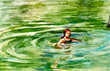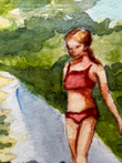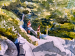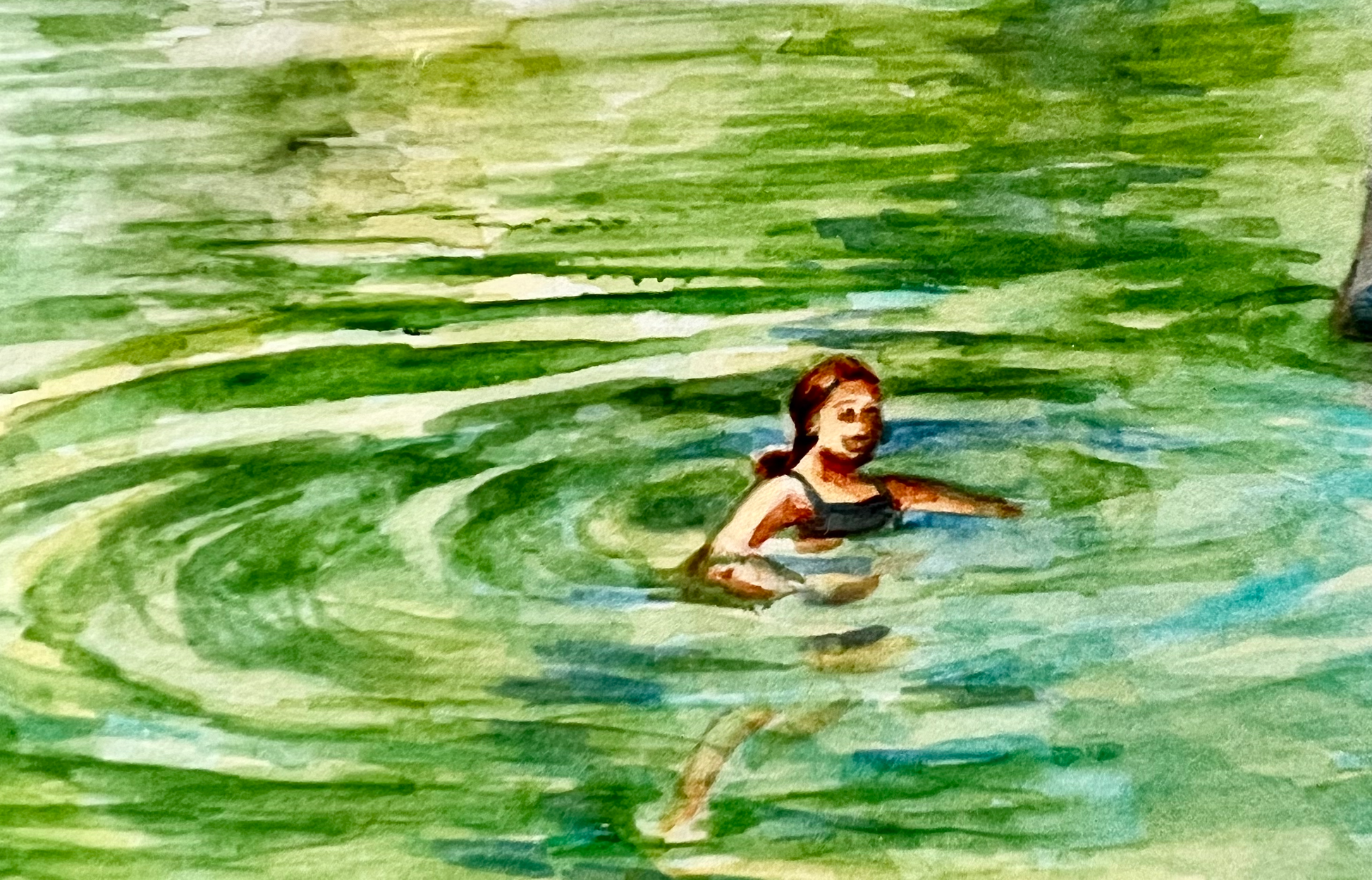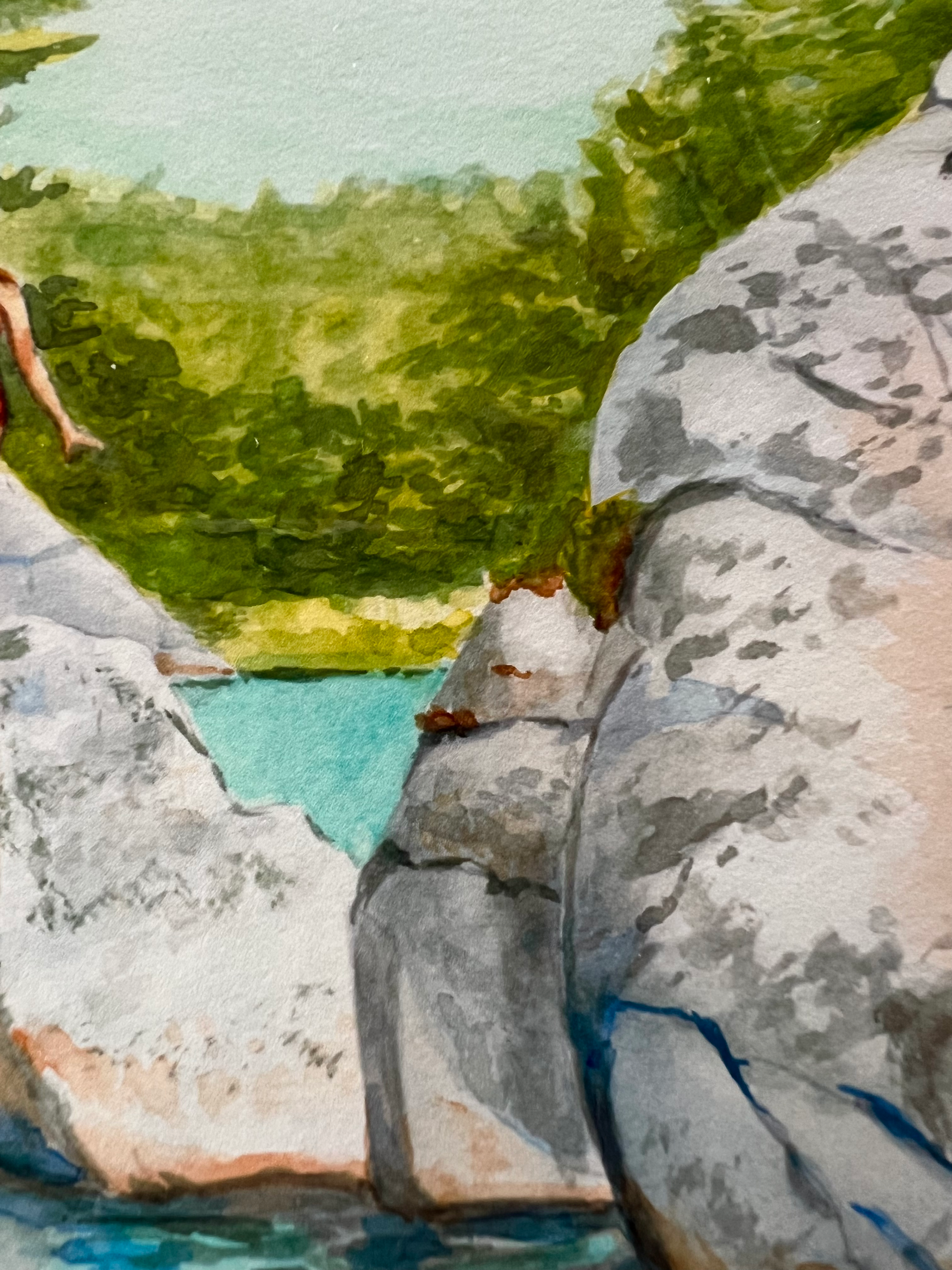 Under bright aqua skies, two young swimmers leap joyfully from the boulders into the refreshing bay below. Their laughter and carefree splashes bring energy to the scene, perfectly capturing the excitement of summer, the spirit of exploration, and the timeless wonder of Georgian Bay.