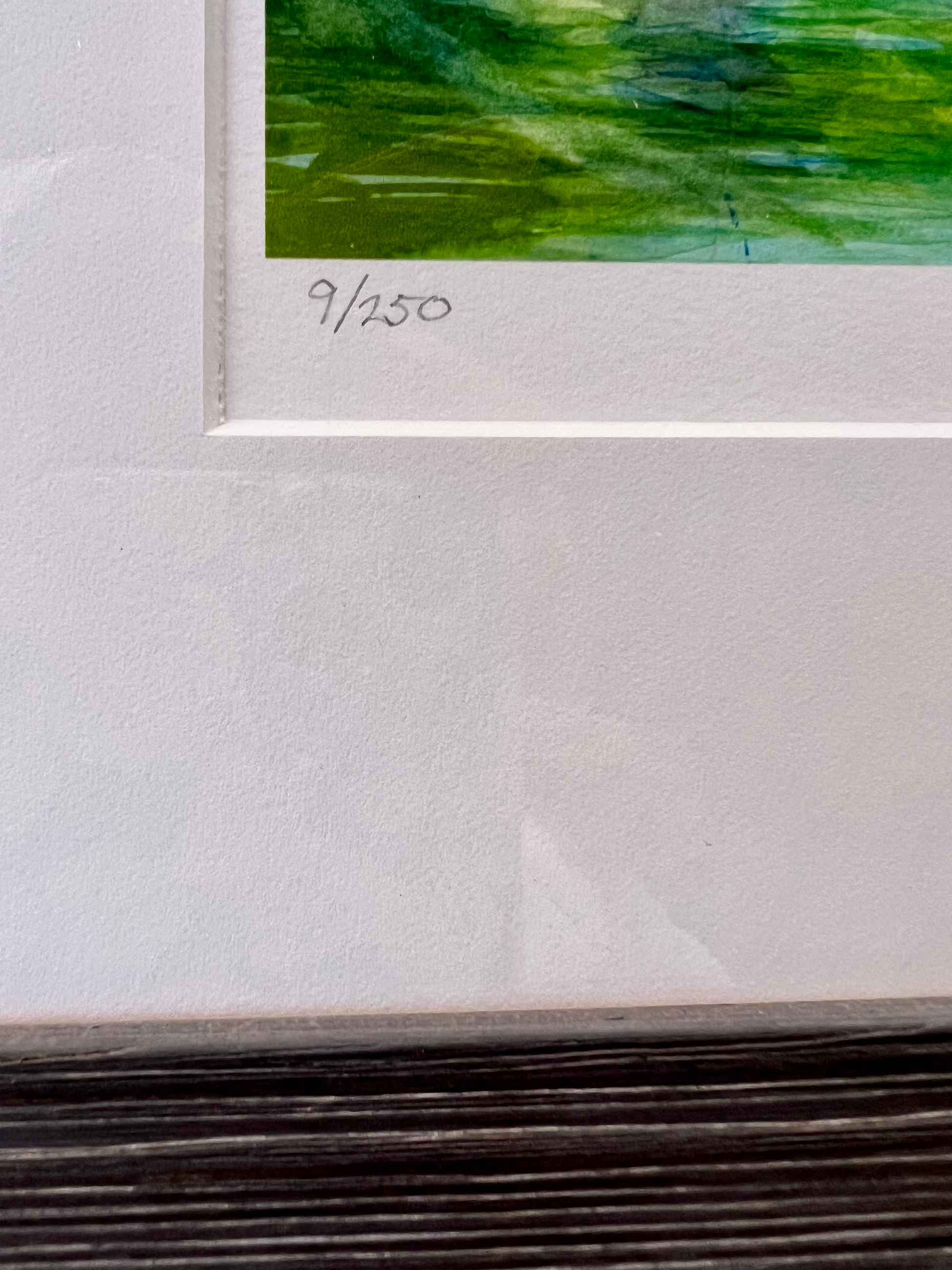 This Fine Art Giclée Print is professionally matted and framed using all archival materials. It is mounted with a soft cream archival mat that enhances the watercolor’s natural palette and set in a light grey wooden frame with visible grain for a contemporary finish. The back is fully sealed and finished, giving the piece a gallery-quality presentation.