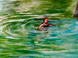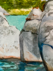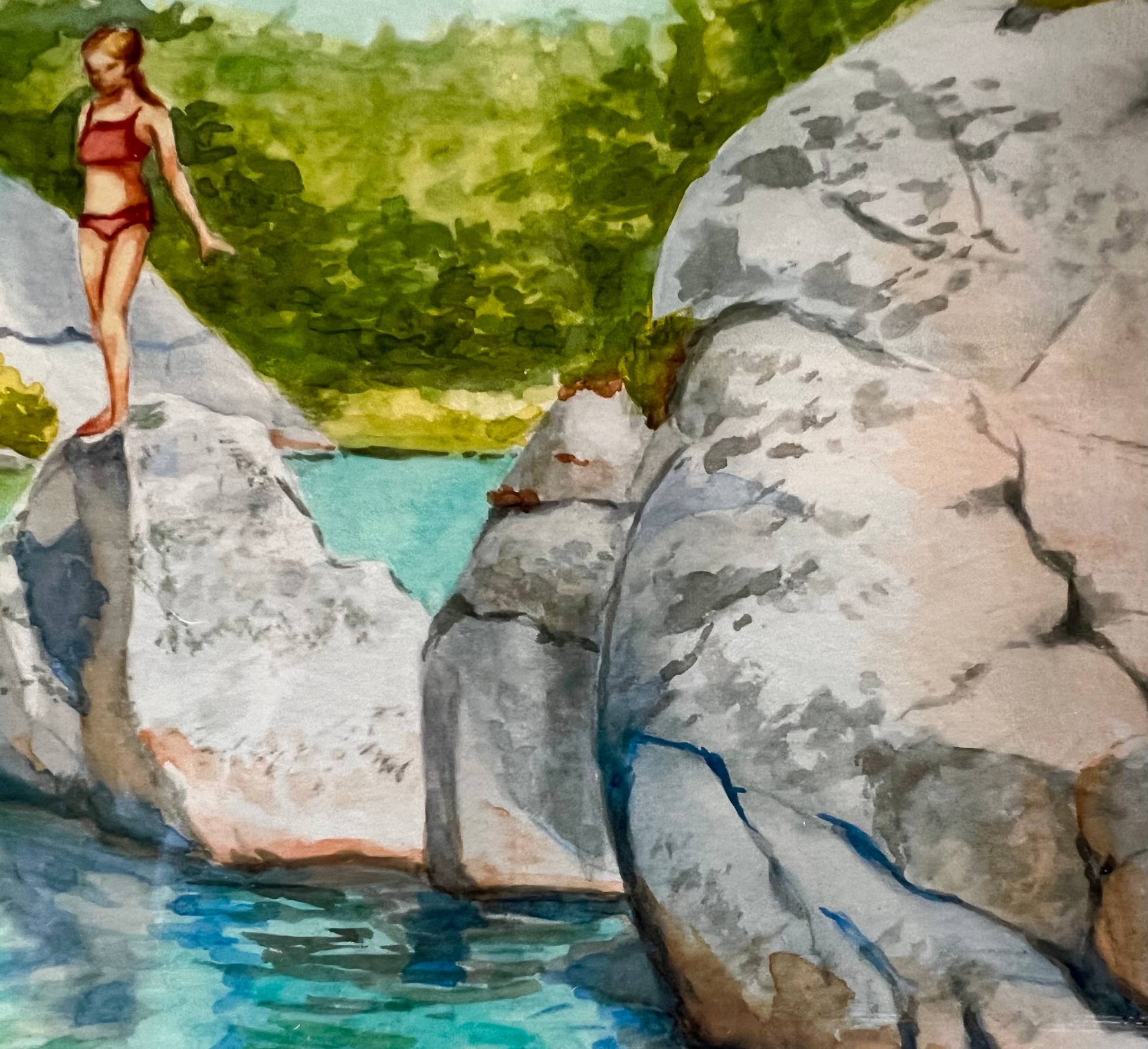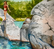 Under the bright afternoon sun, two young swimmers leap from sunlit boulders into the refreshing waters below. Their carefree splashes bring energy and excitement to the scene, perfectly capturing the joy of summer and the spirit of Georgian Bay adventure.