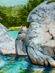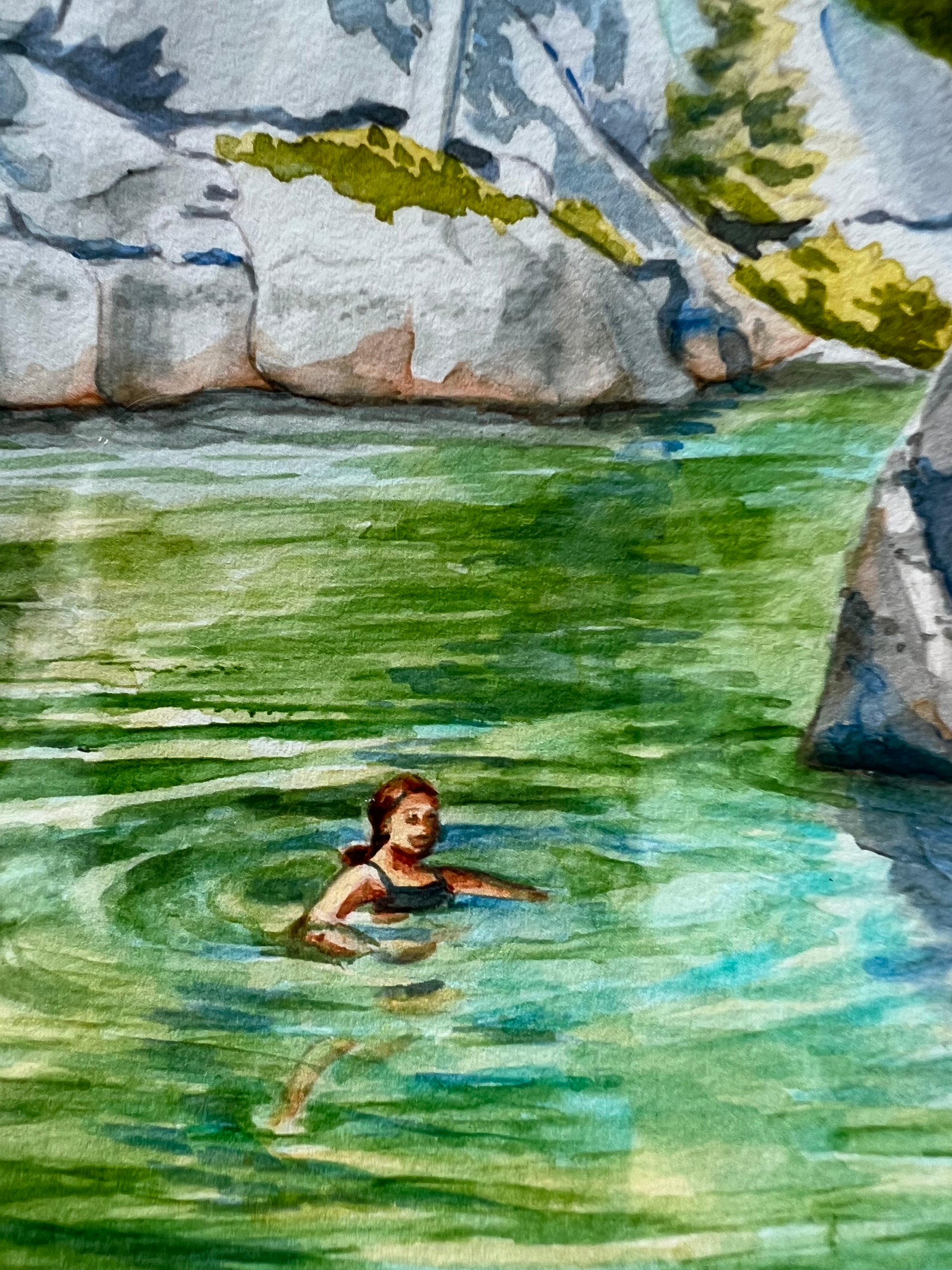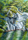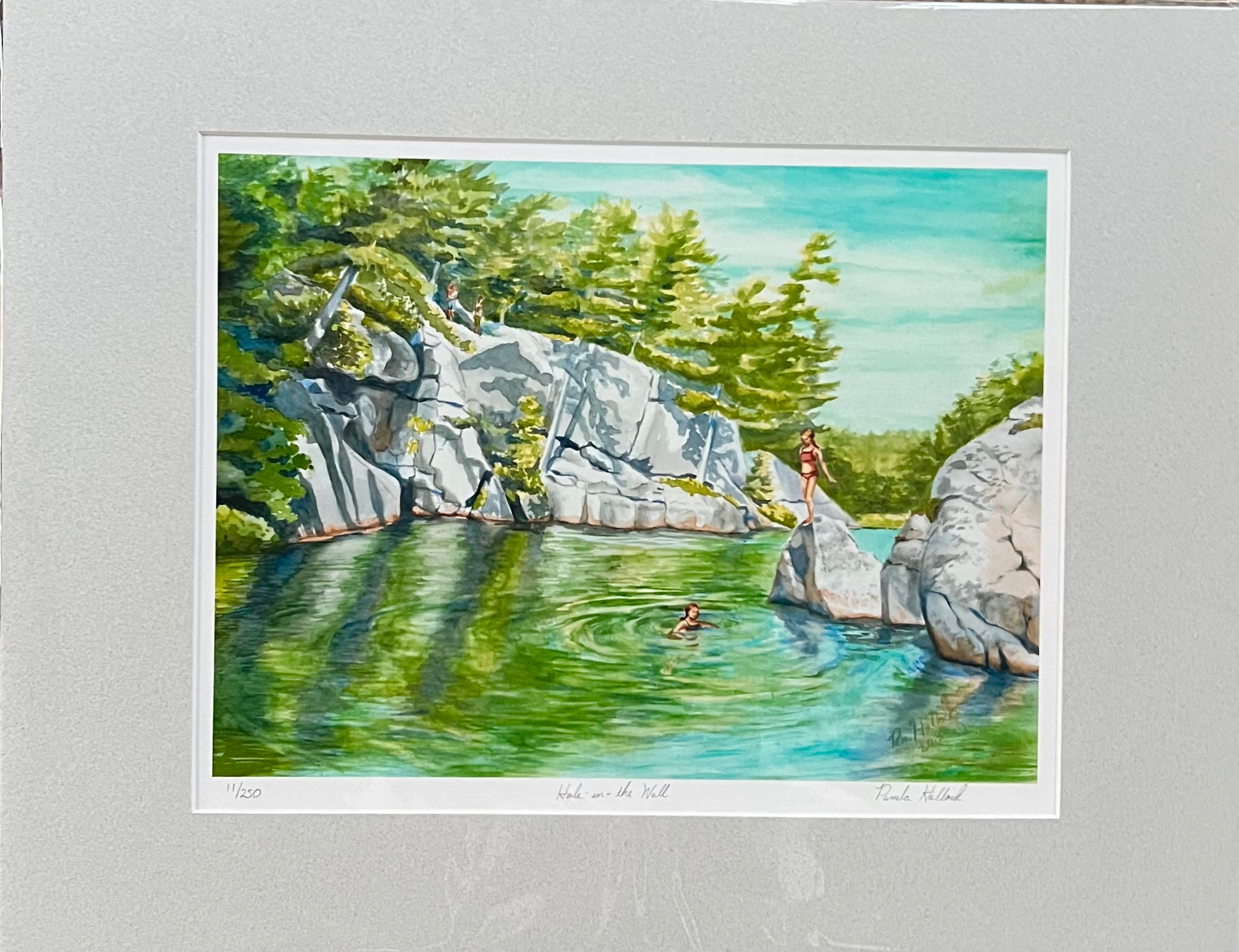 Beneath the bright aqua skies, two preteen swimmers leap joyfully from sunlit boulders into the refreshing waters below. This matted watercolor print, ready to frame, captures the adventurous spirit of summer, the thrill of cliffside swimming, and the timeless beauty of Georgian Bay’s glacial cliffs.