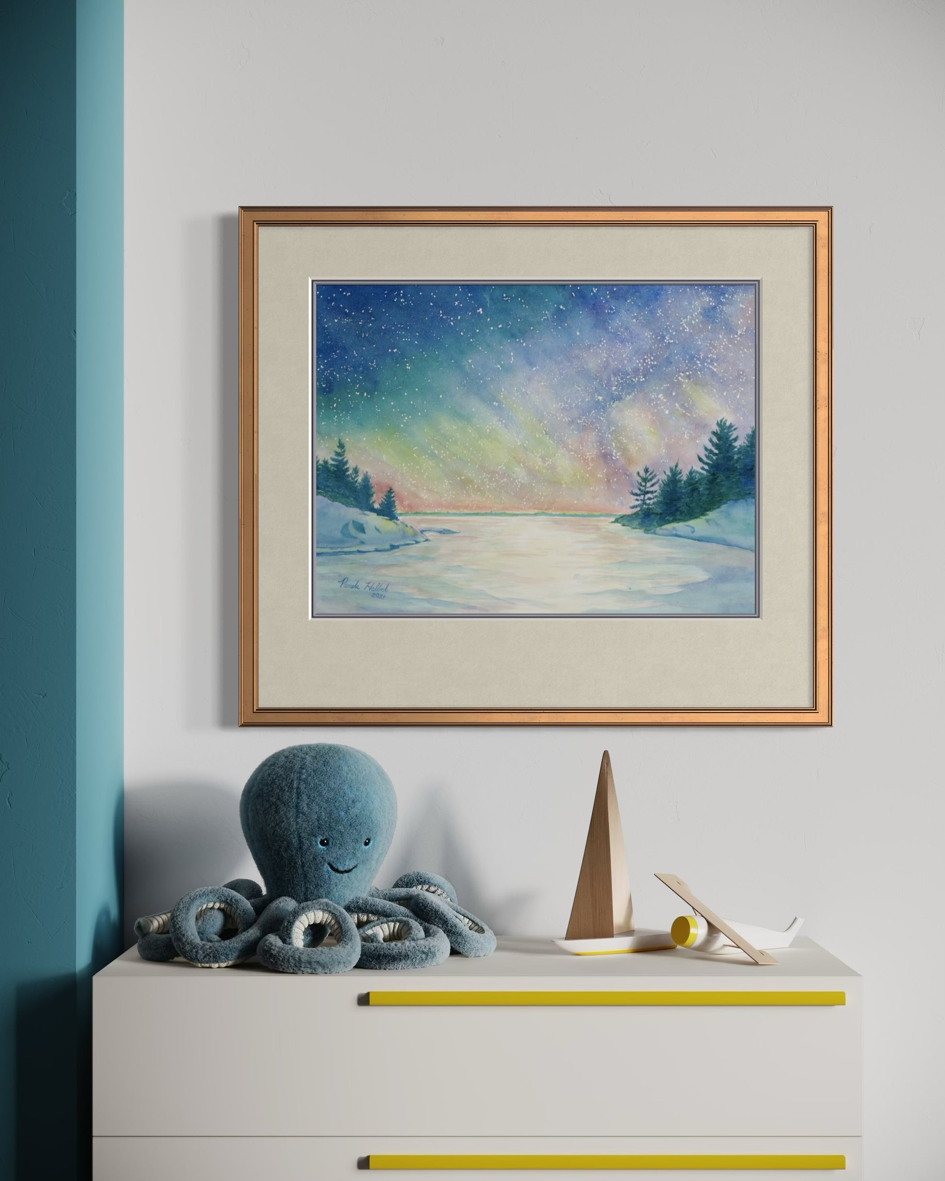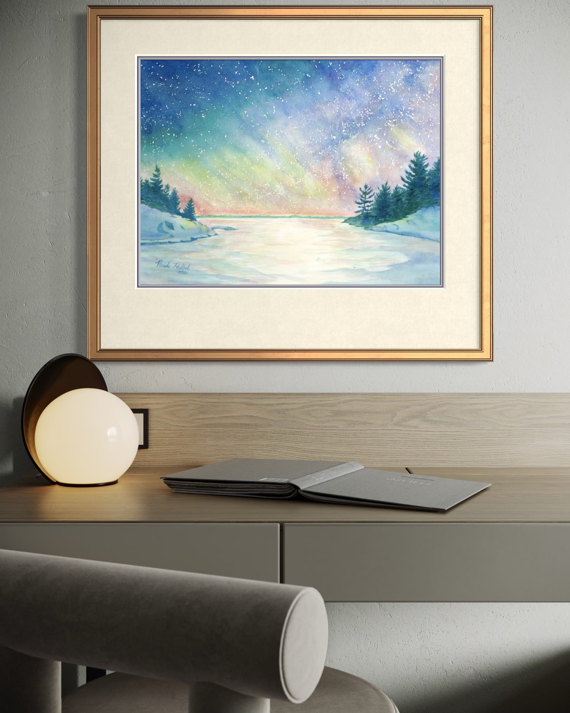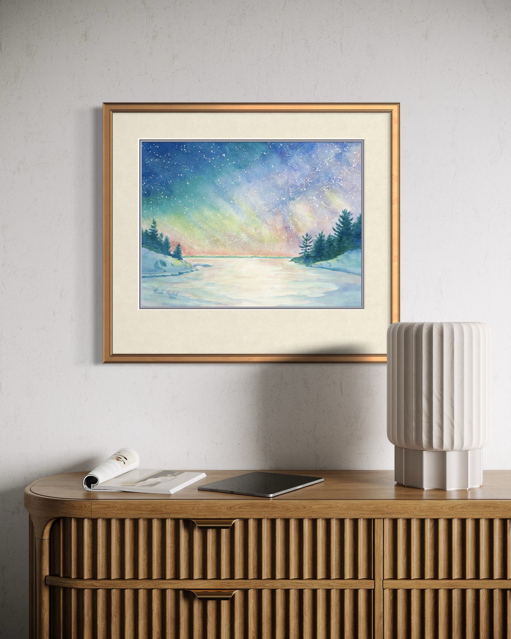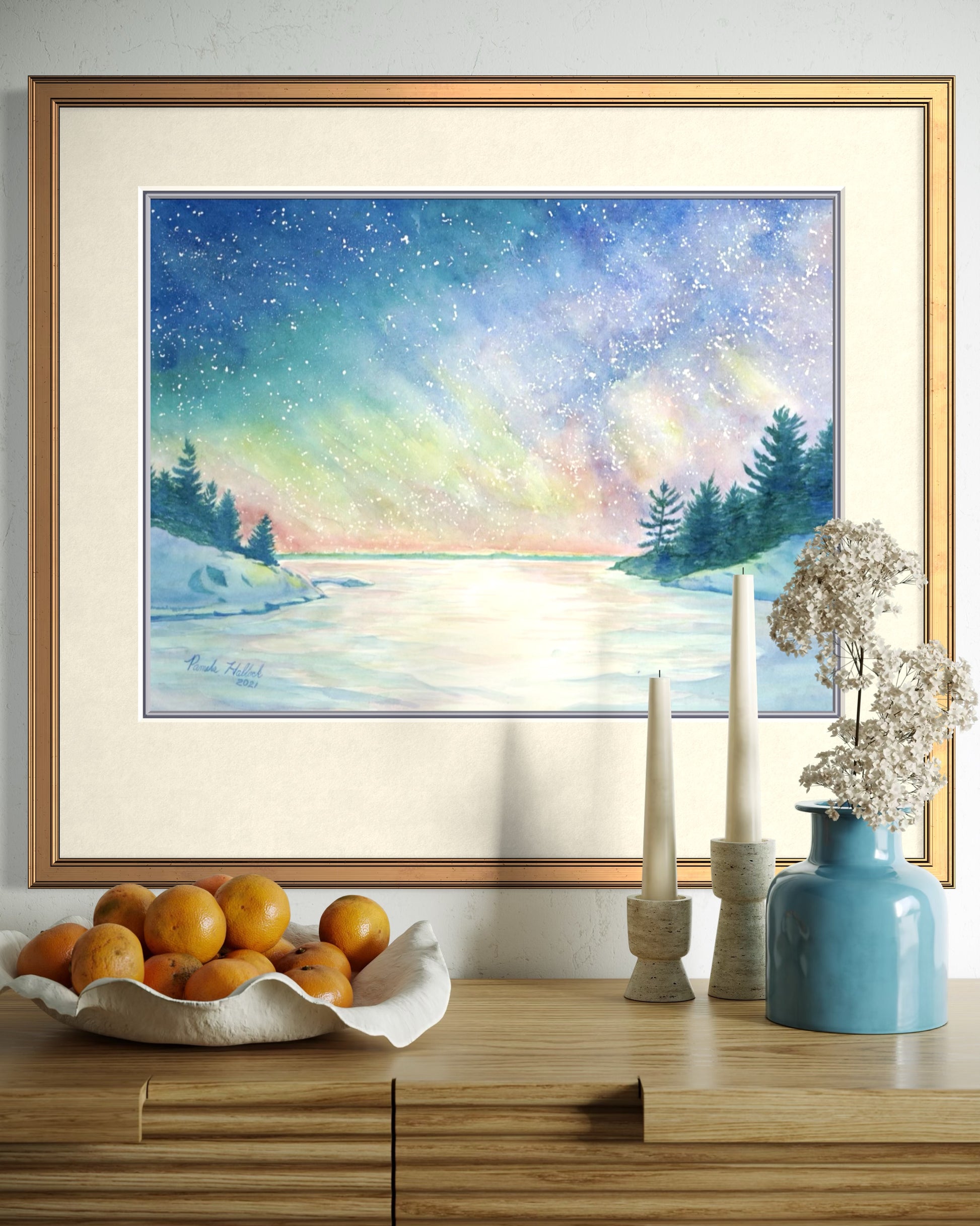 🌌 Lake Huron Winter Sky Watercolor Print – Northern Lights Fine Art