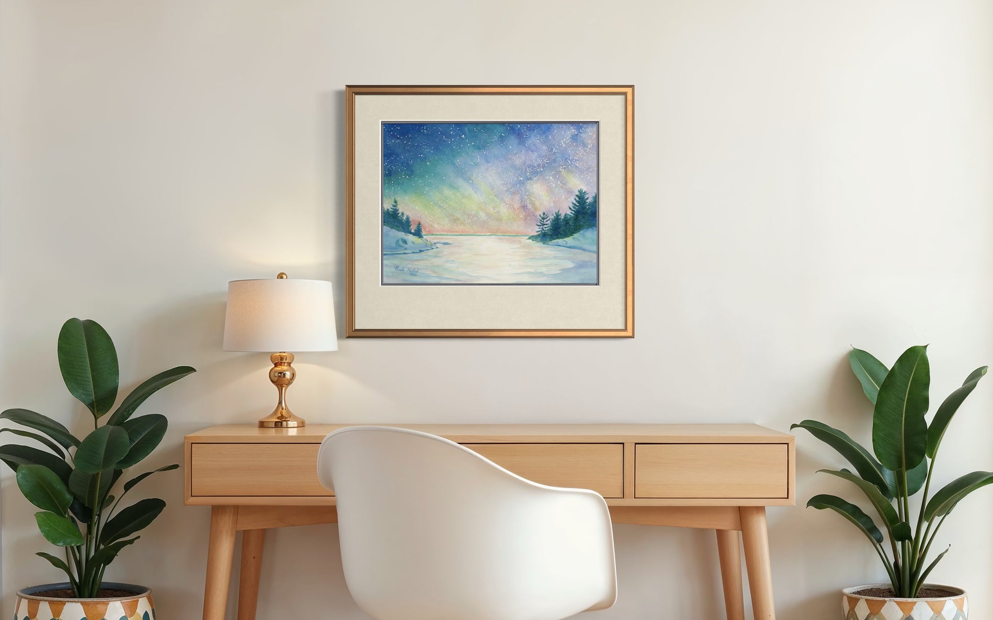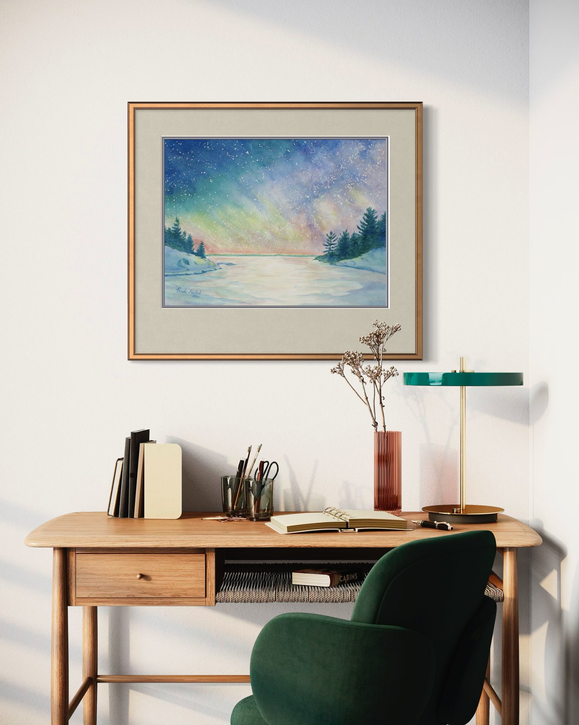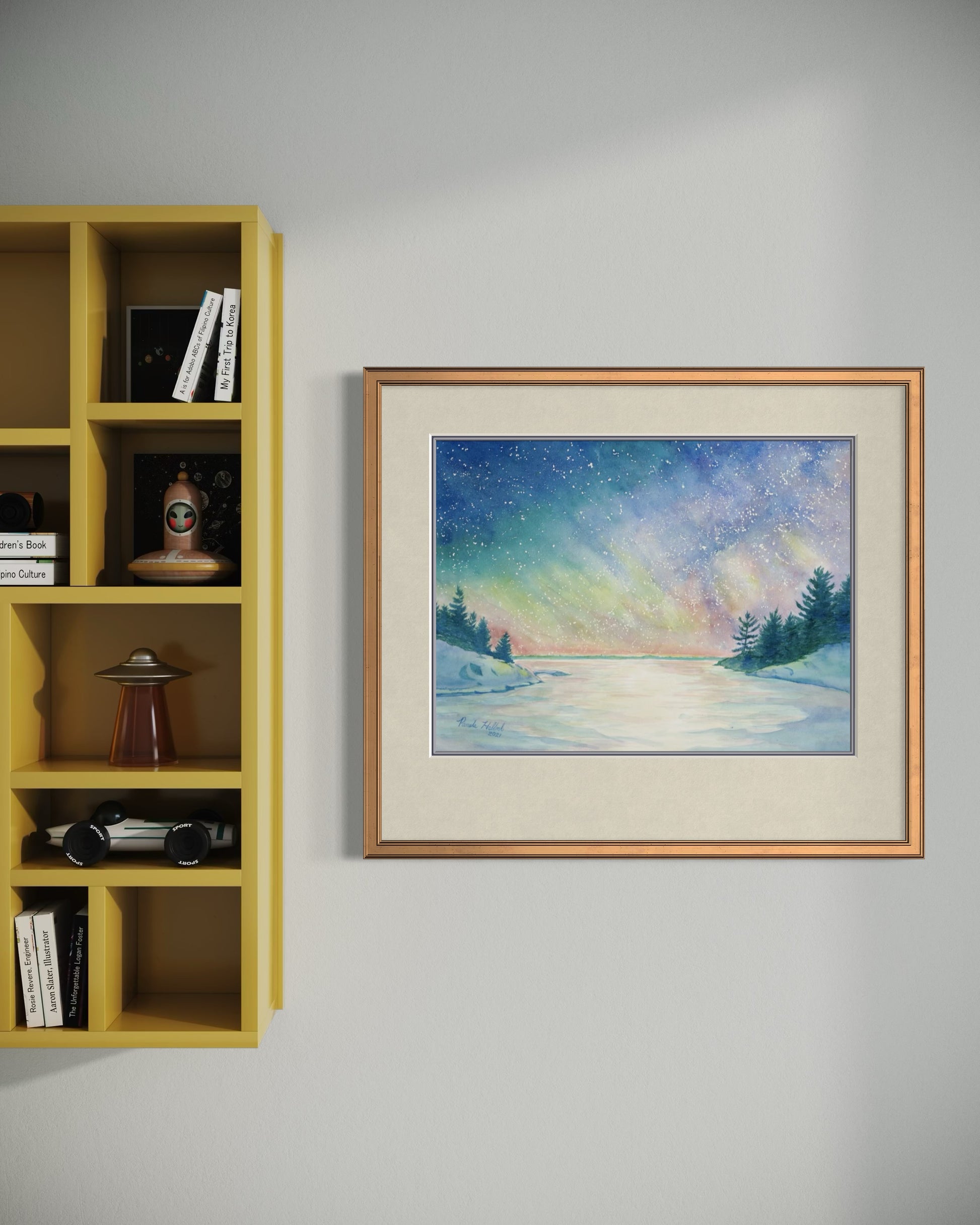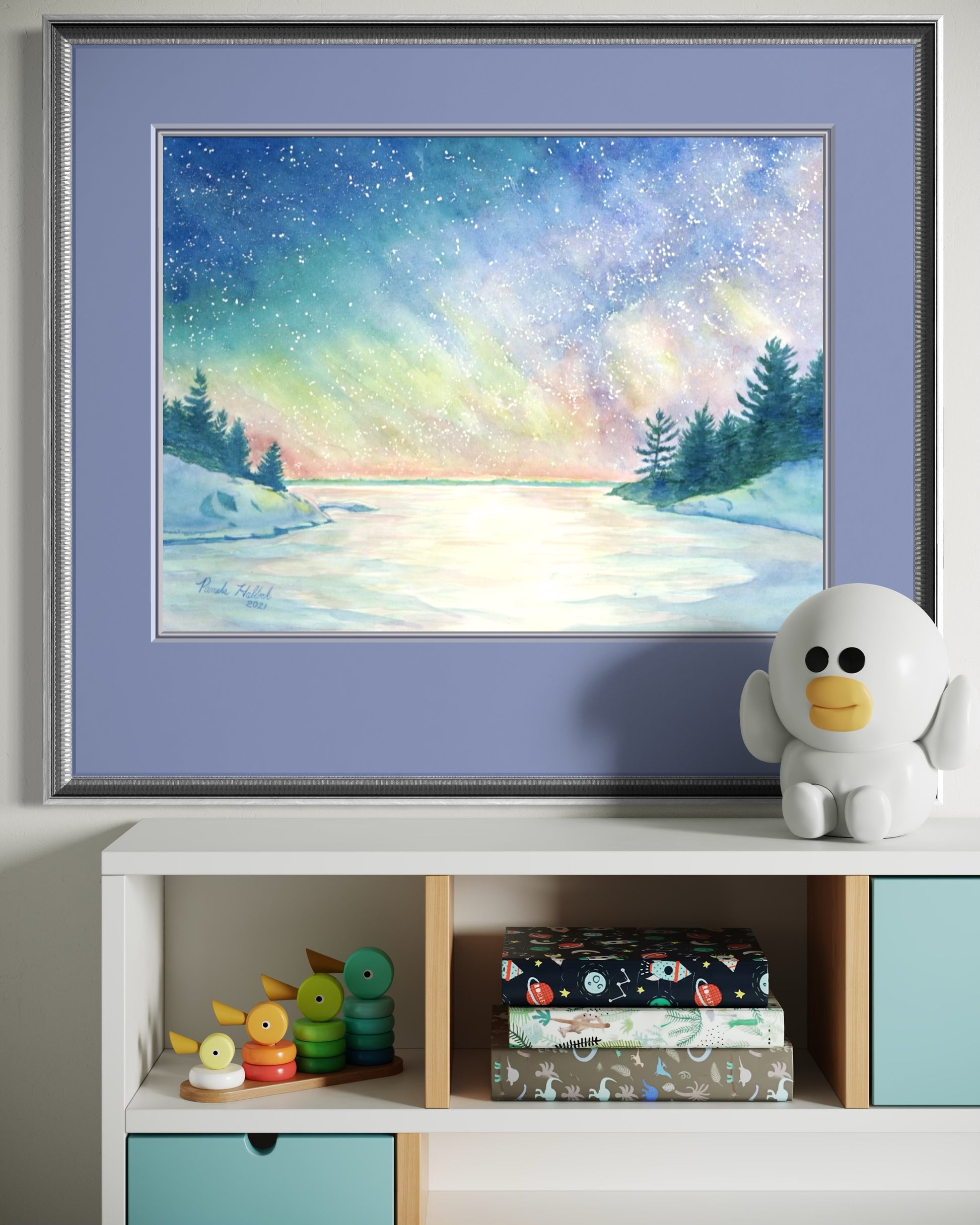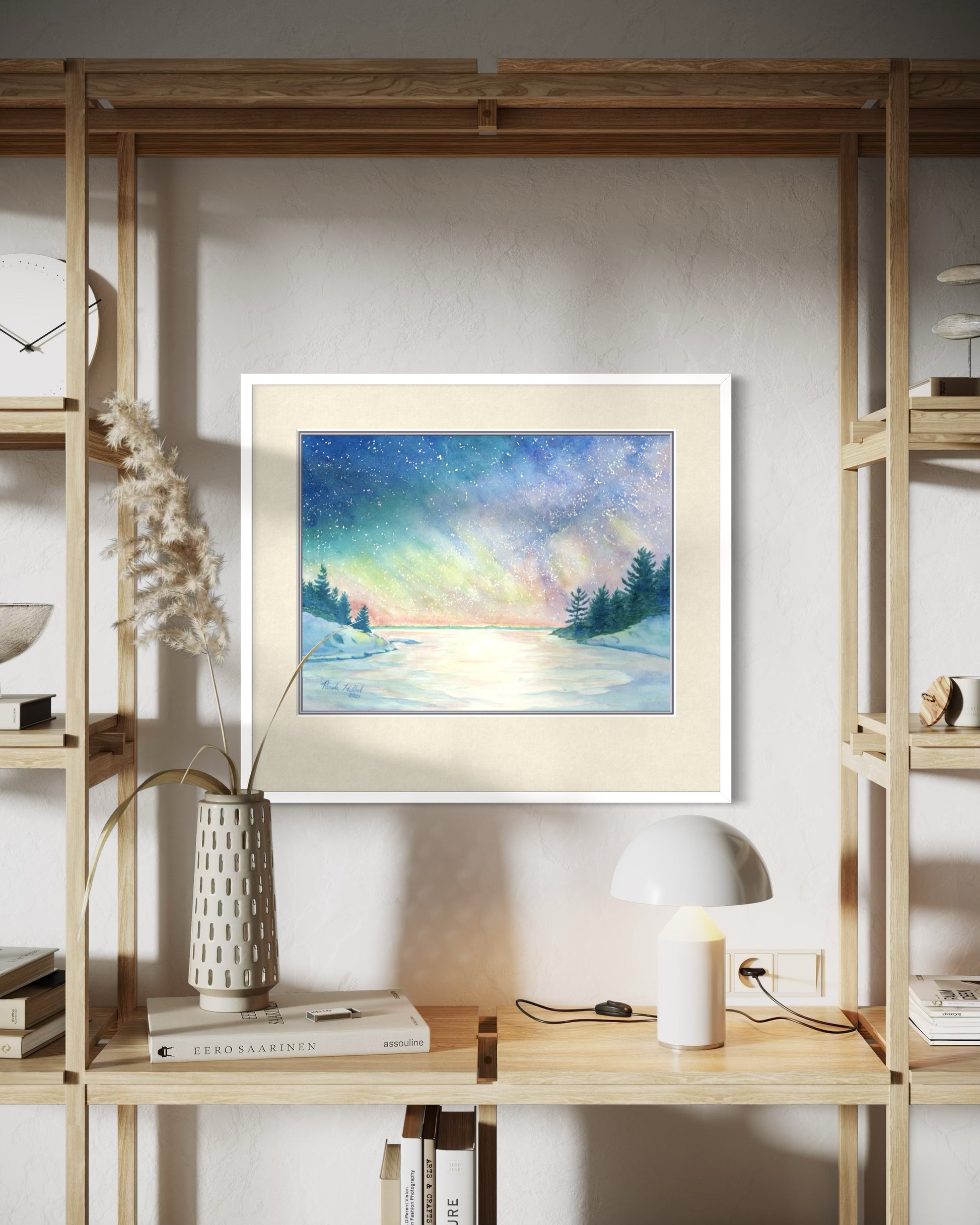 🌌 Lake Huron Winter Sky Watercolor Print – Northern Lights Fine Art
