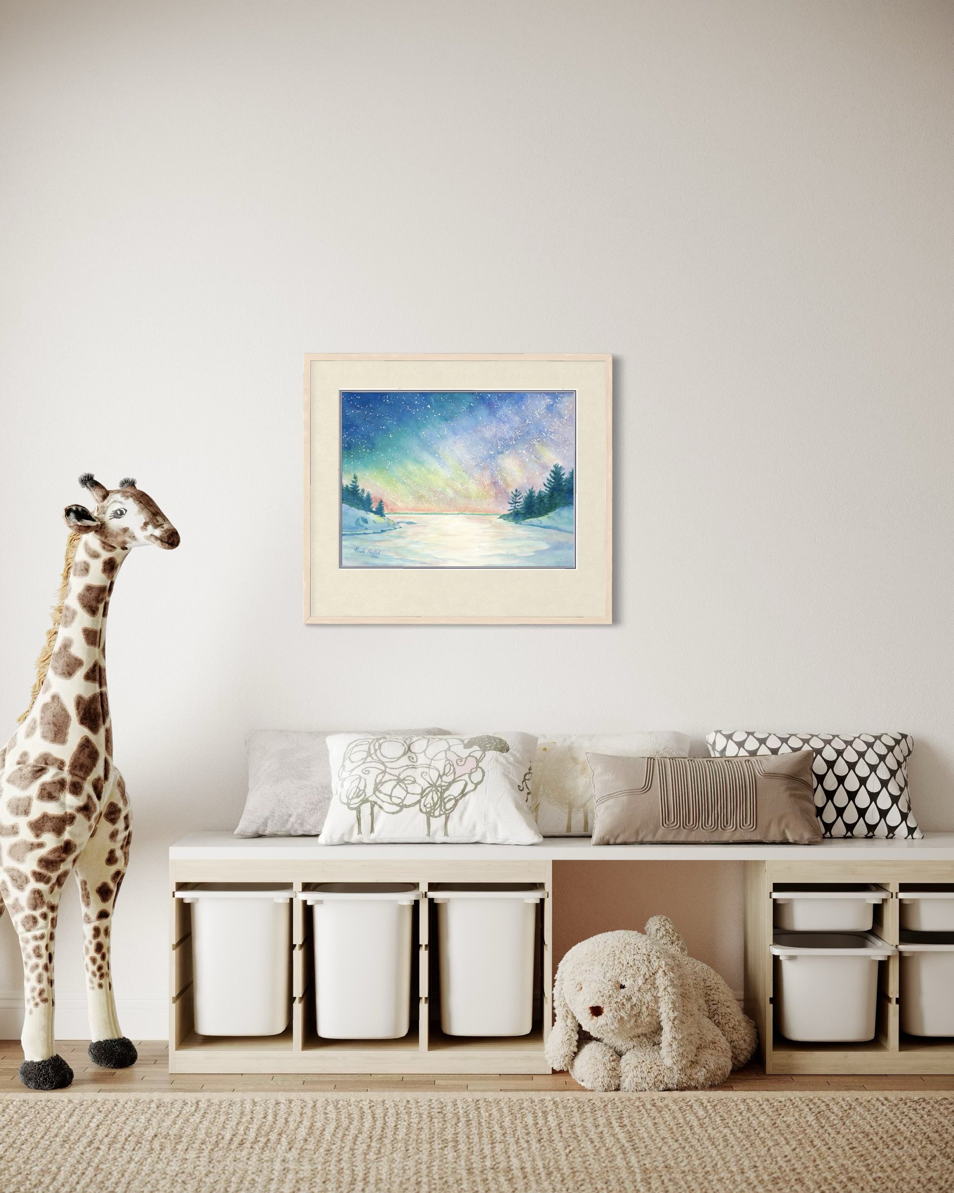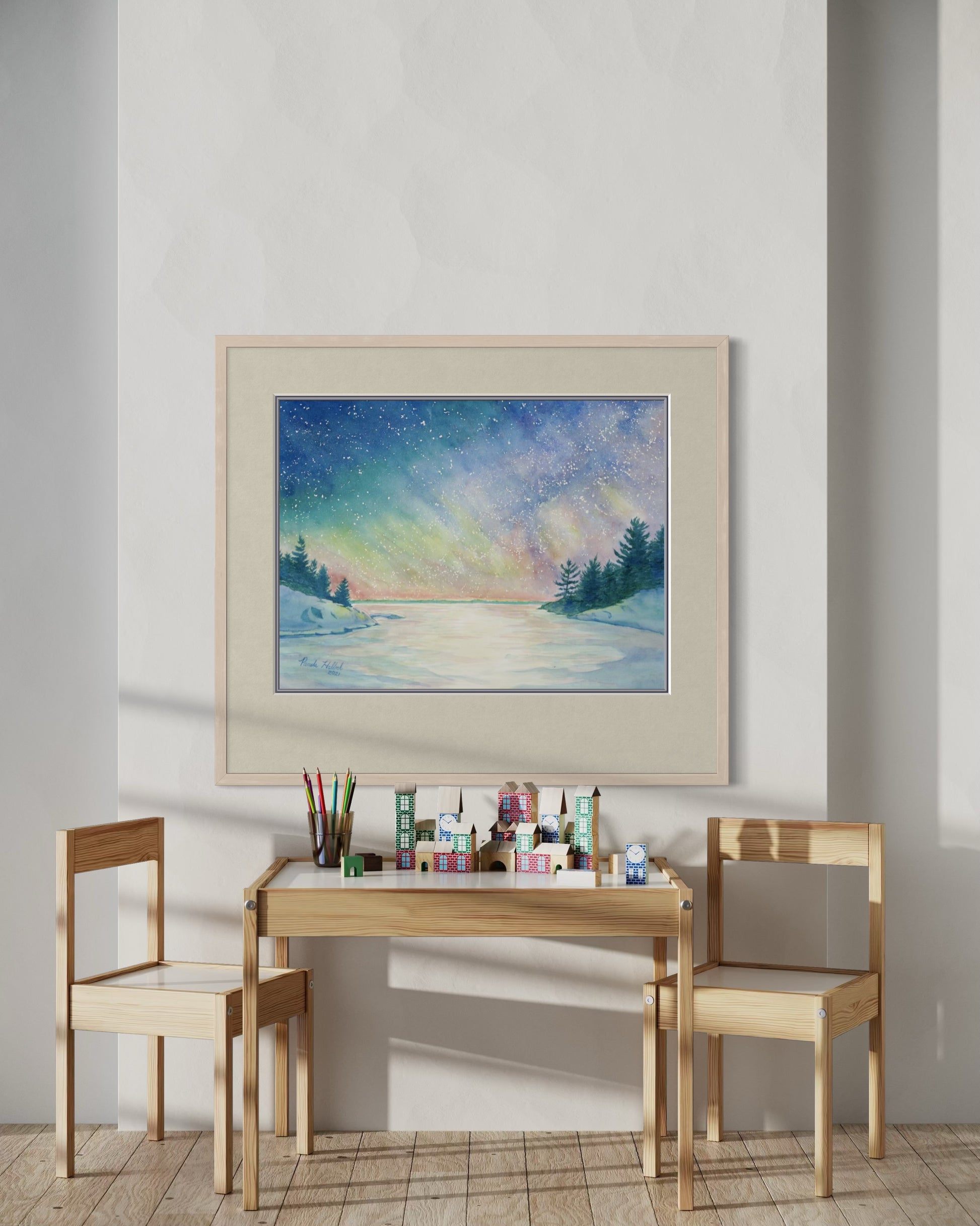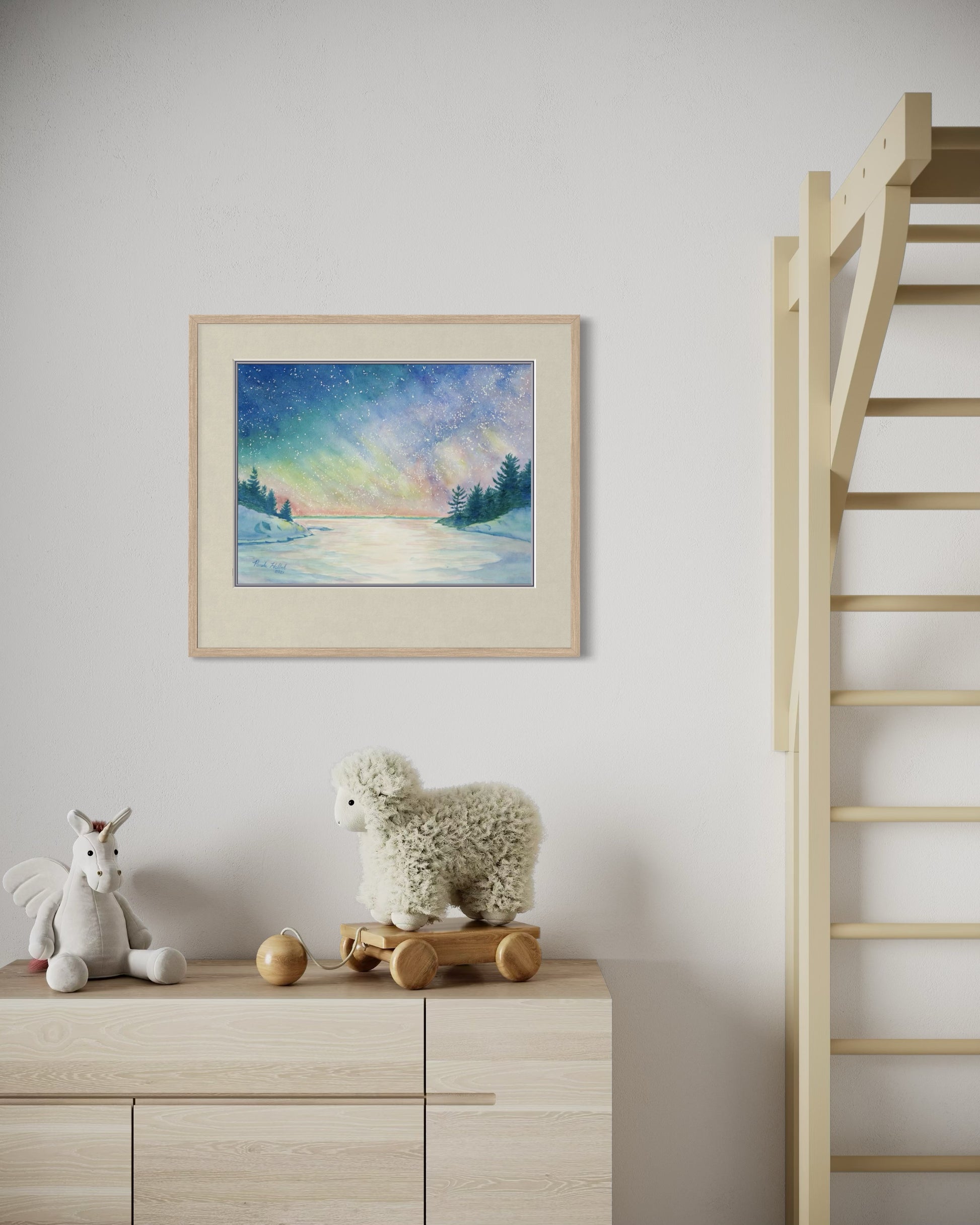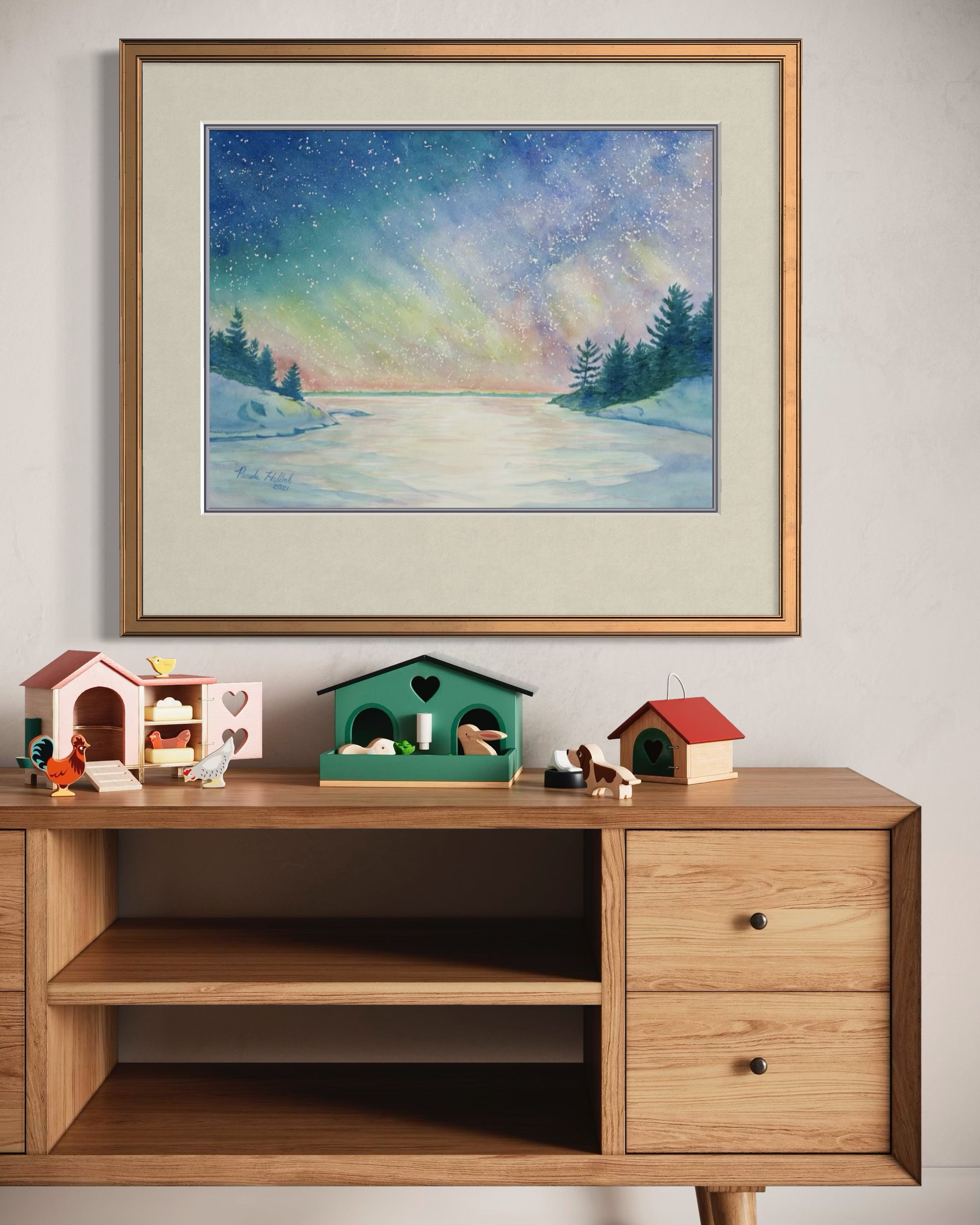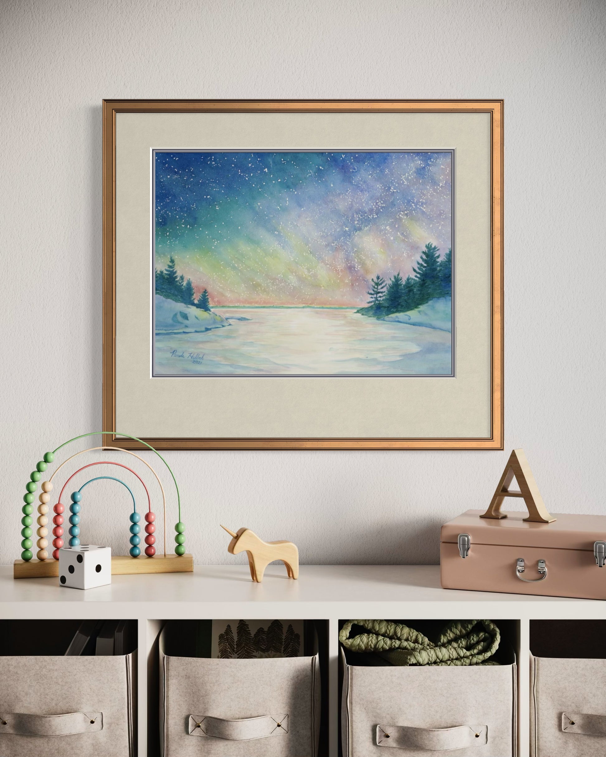 Framed by tall pines standing like guardians, the scene glows with the sparkle of stars and the soft shimmer of moonlight on snow. The crisp winter air feels almost tangible, inviting you to pause, breathe, and savor the serenity of the season. This painting is a joyful reminder of the quiet wonder that winter brings—perfect for collectors of night sky art, Lake Huron fine art, or northern lights watercolor prints.