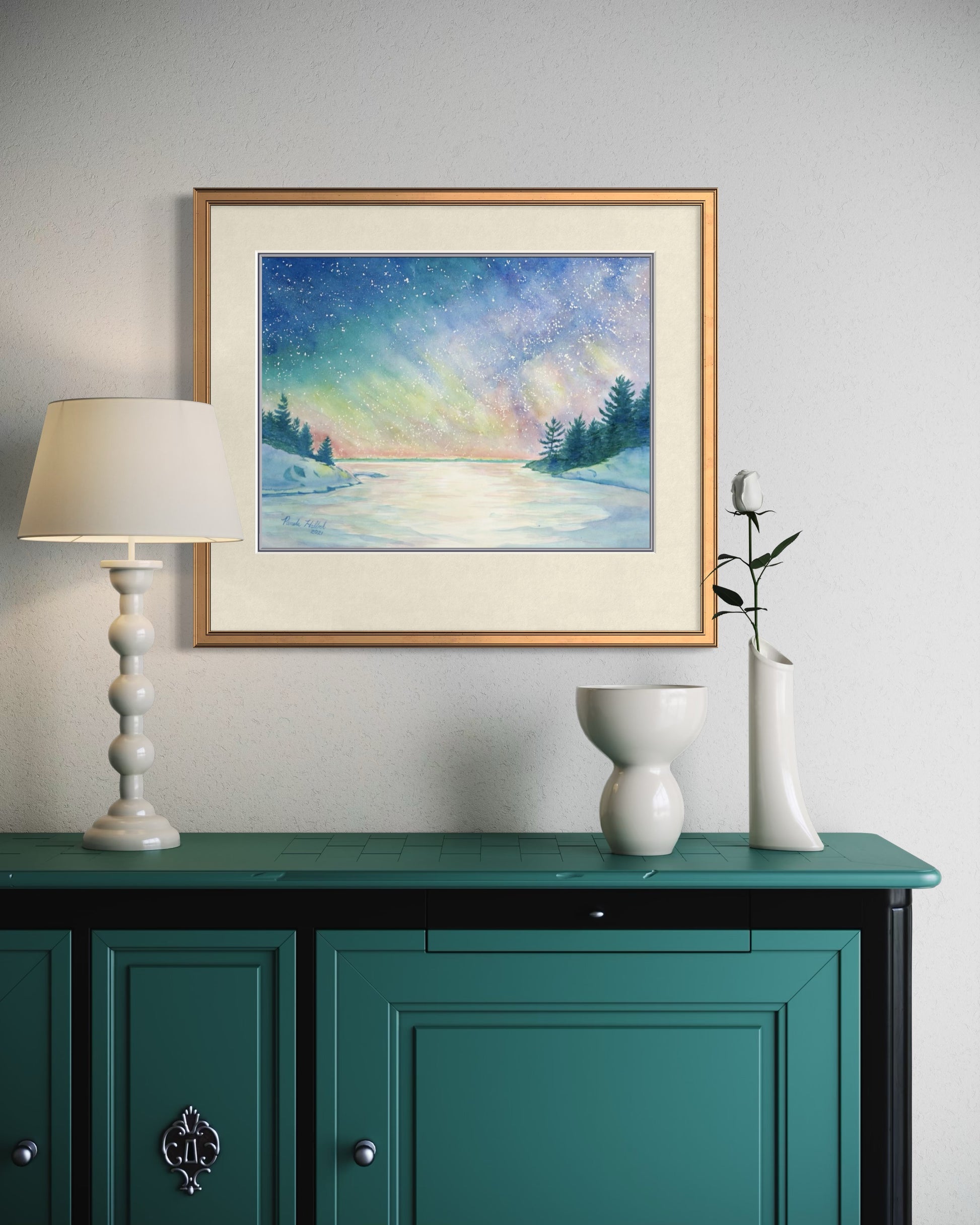 "Winter Sky", Lake Huron Winter Sky Watercolor Print | Northern Lights Art