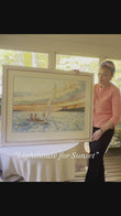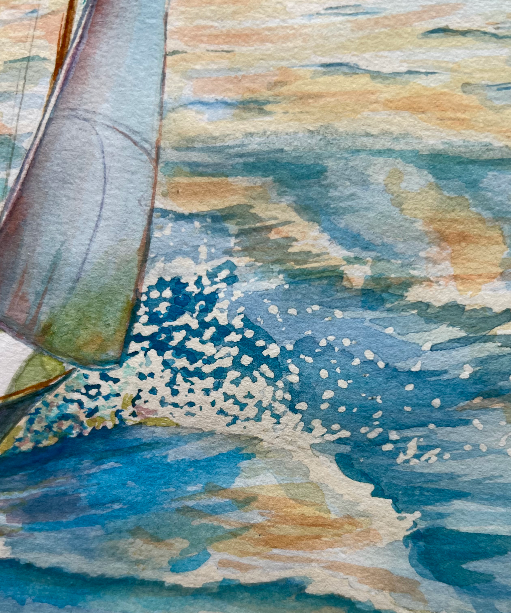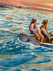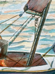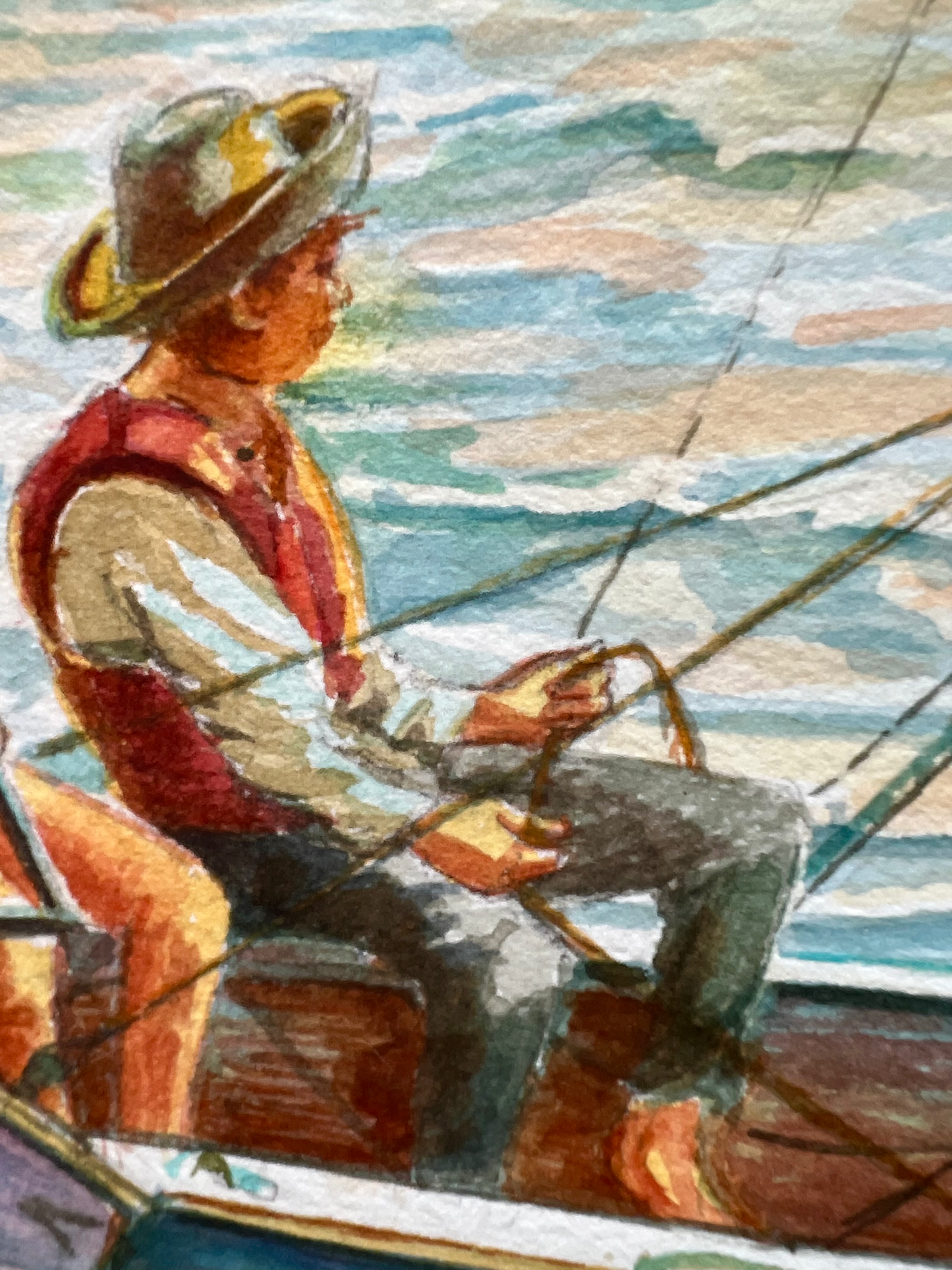 This painting captures the carefree and fun-loving spirit of a simple moment, where the worries of the world fade away, and all that matters is the beauty of nature and the thrill of the adventure. It is a wonderful representation of the timeless appeal of sailing to the lighthouse, an experience that brings joy and excitement to people of all ages.
