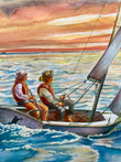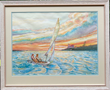 Welcome to this lively painting titled "Lighthouse for Sunset"! In this vibrant work of art, we witness the joyous tradition of sailing to the lighthouse to catch a breathtaking view of the colorful sunset.