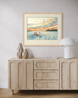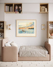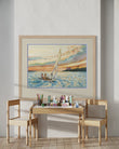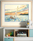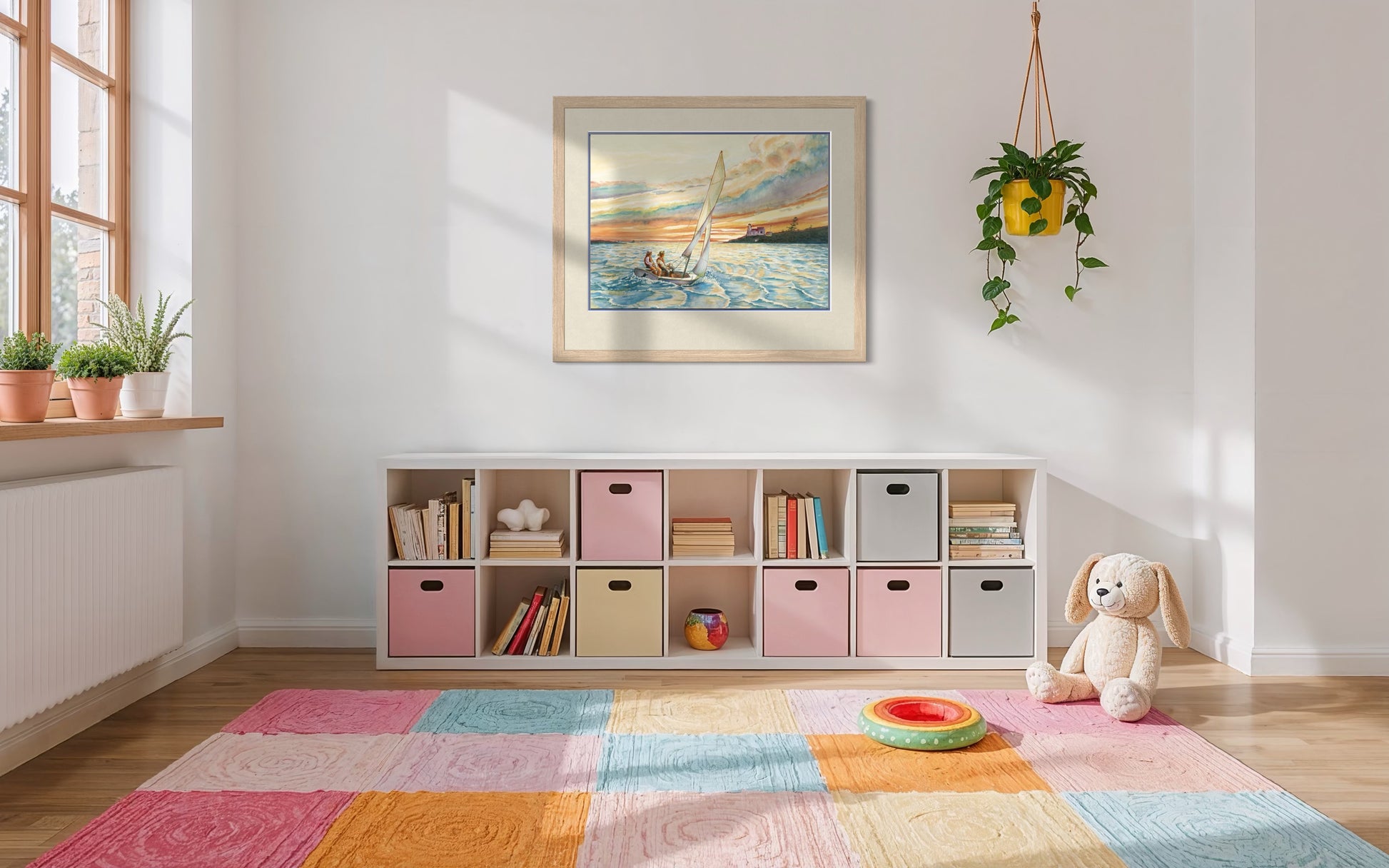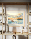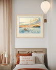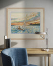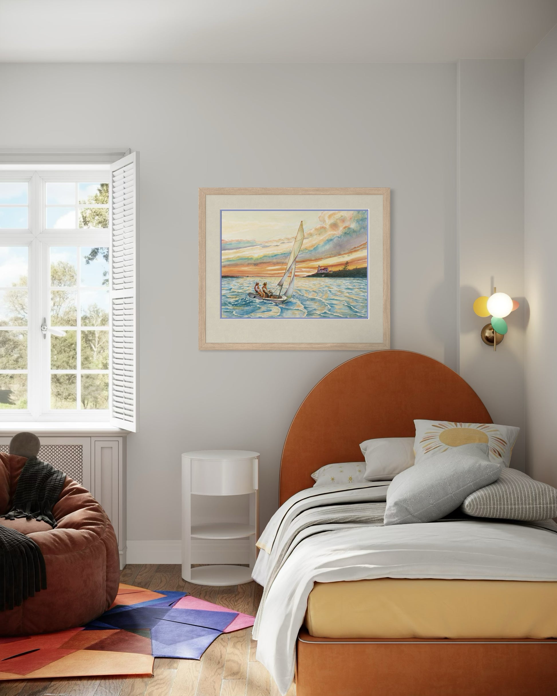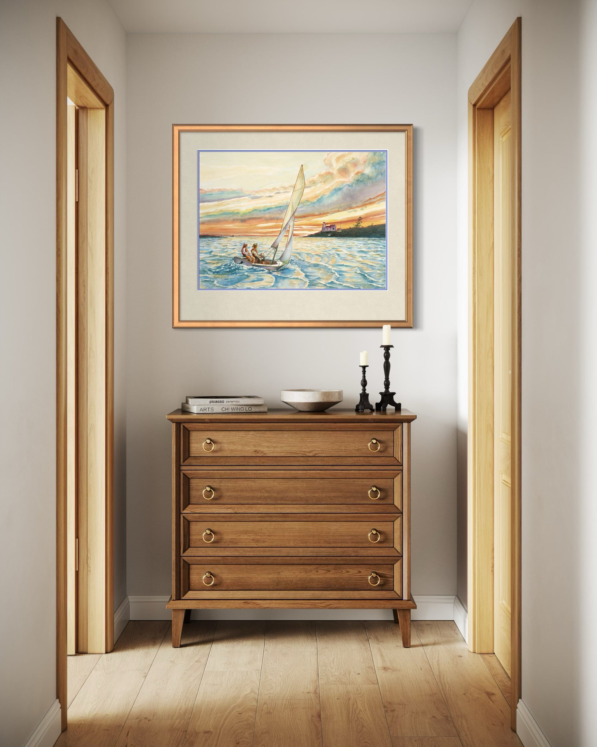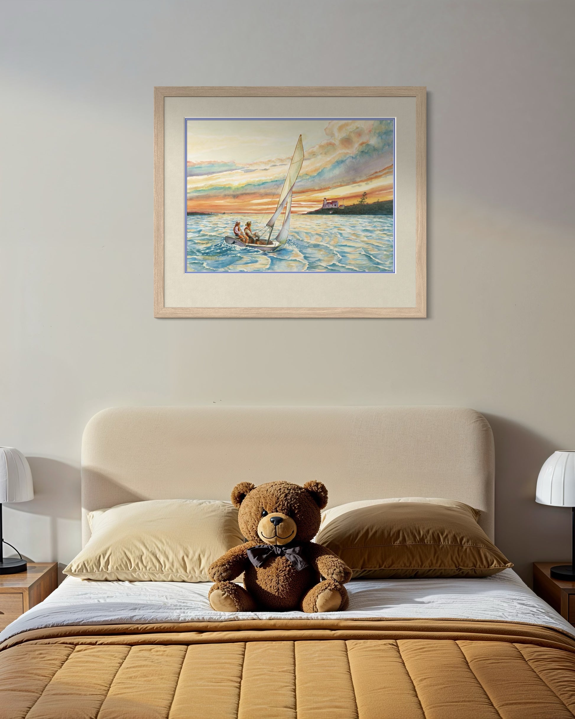 Joyful and radiant, Lighthouse for Sunset captures the timeless tradition of sailing out to the lighthouse to watch the day’s final light fade across the horizon. A small sailboat, carrying two adventurous youths, glides across the shimmering water, their sails full with the brisk evening wind.