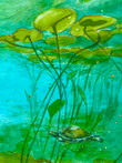 Enchanting and serene, Lilies in Frog Bay captures the beauty of an aquatic landscape alive with color and calm. Wild lake lilies stretch gracefully toward the sunlight, their delicate petals and slender stems swaying in the clear water. Among them, a playful turtle swims happily, finding shelter in the peaceful bay.