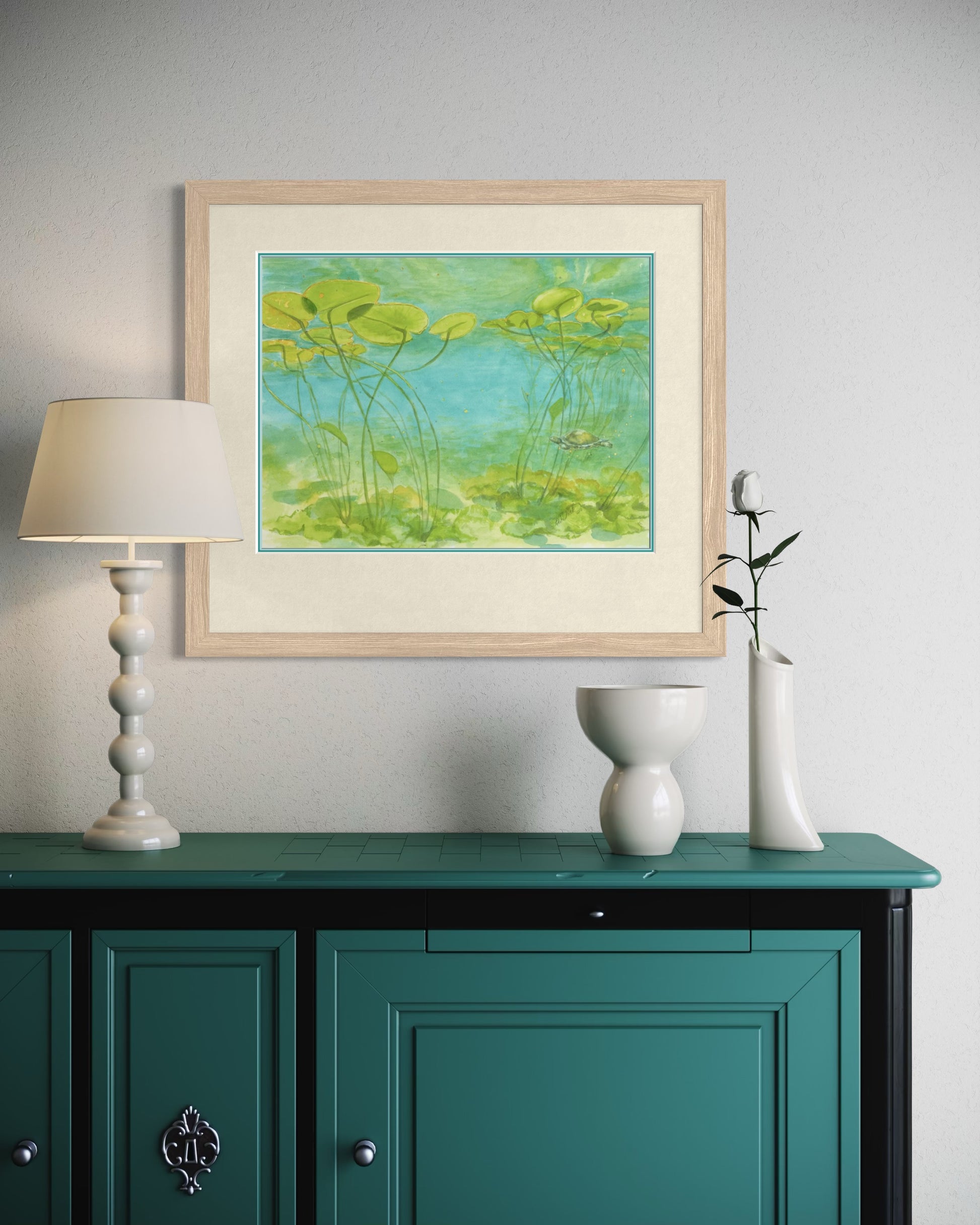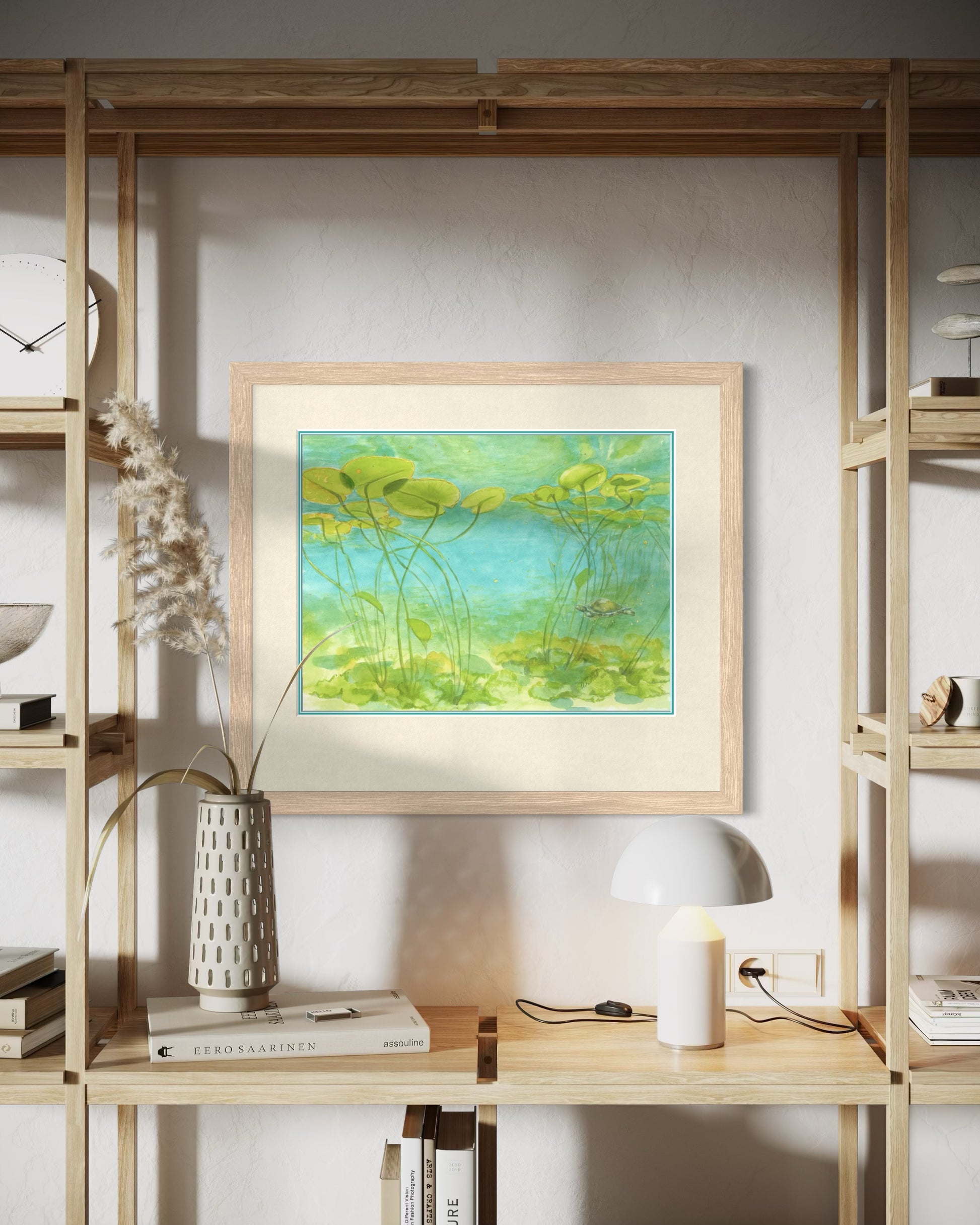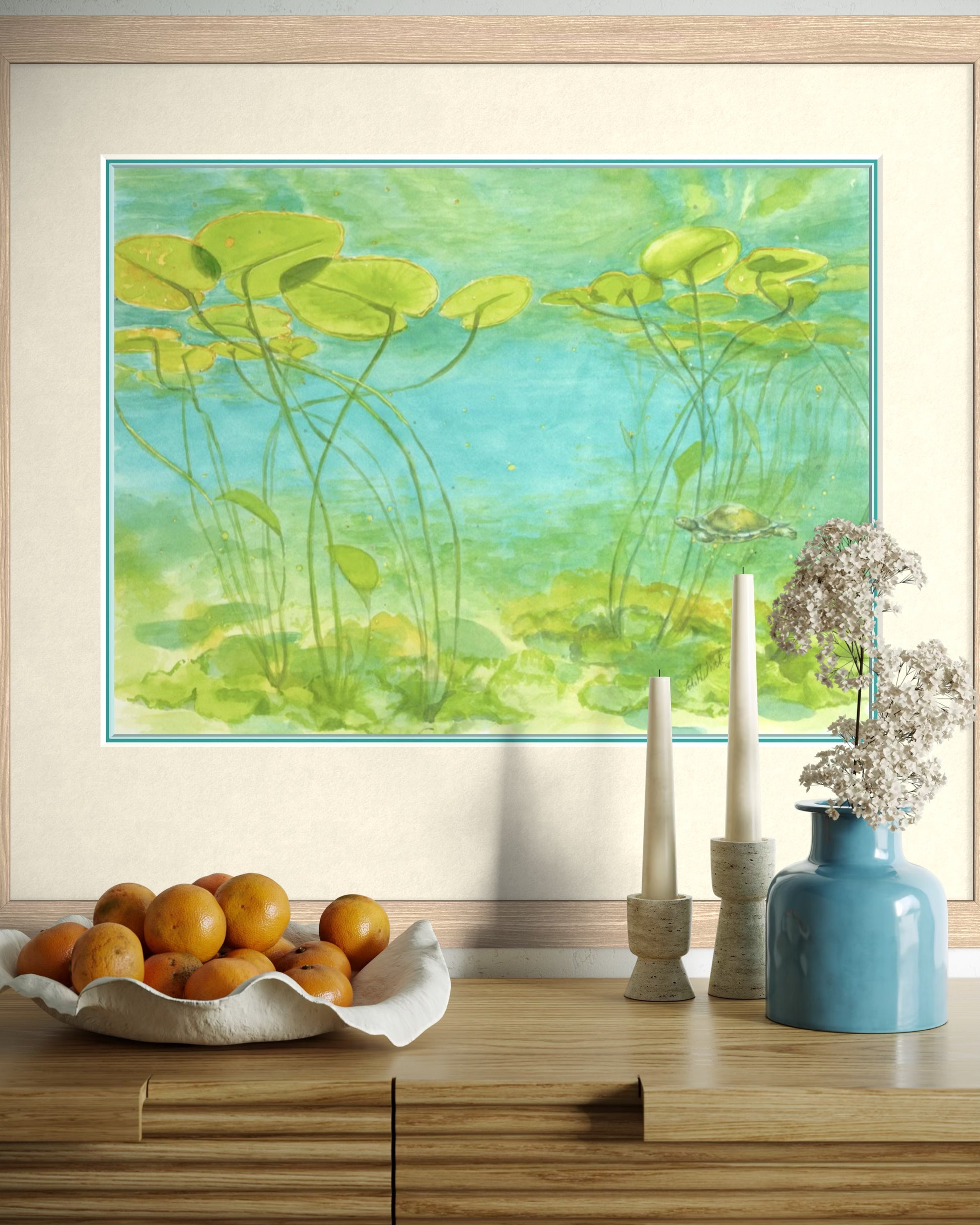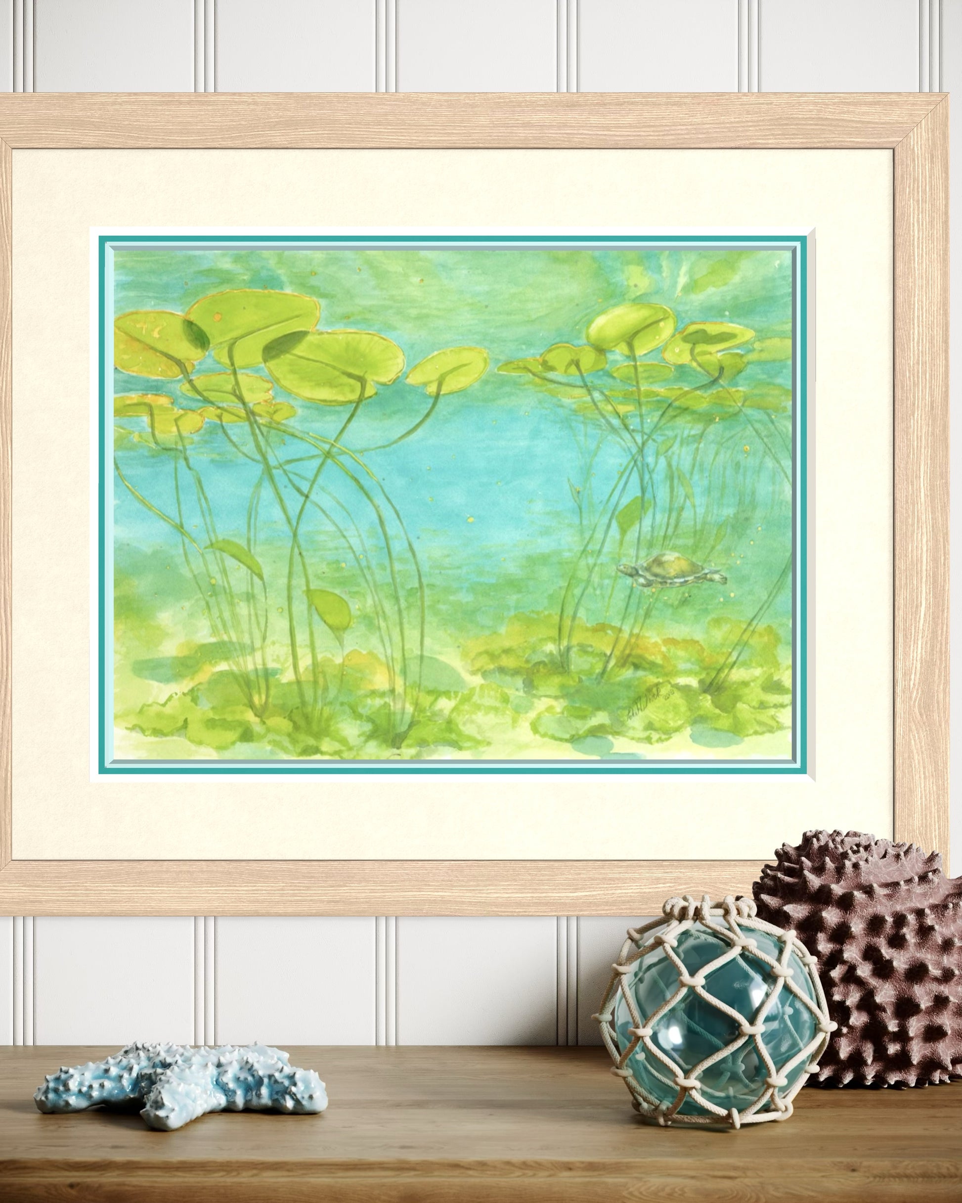 The bright colors and calm setting make this piece a gentle reminder of the hidden wonders of nature. Perfect for collectors of botanical watercolor prints, turtle fine art, or Georgian Bay-inspired artwork, this print brings a touch of tranquility and natural beauty to any space.