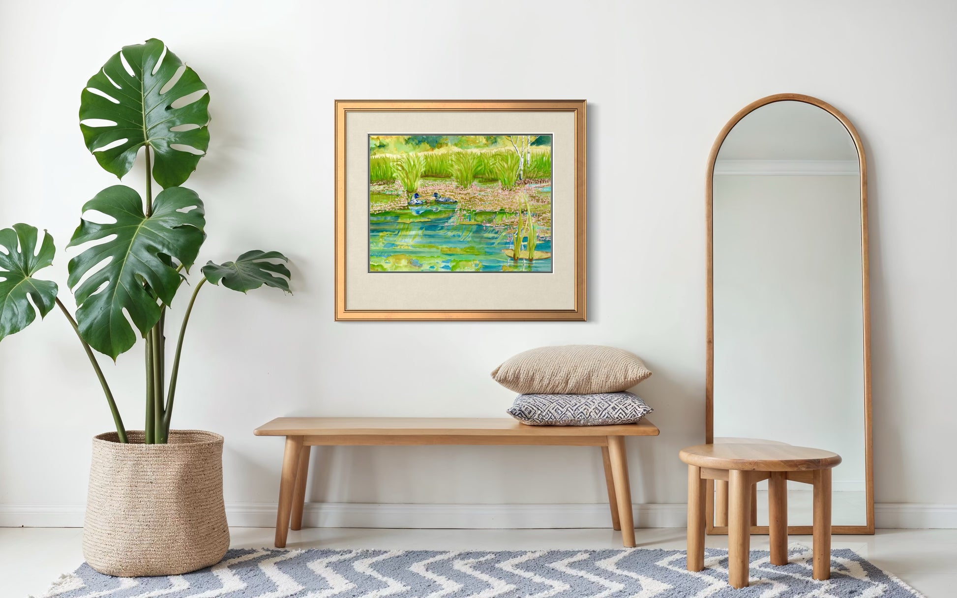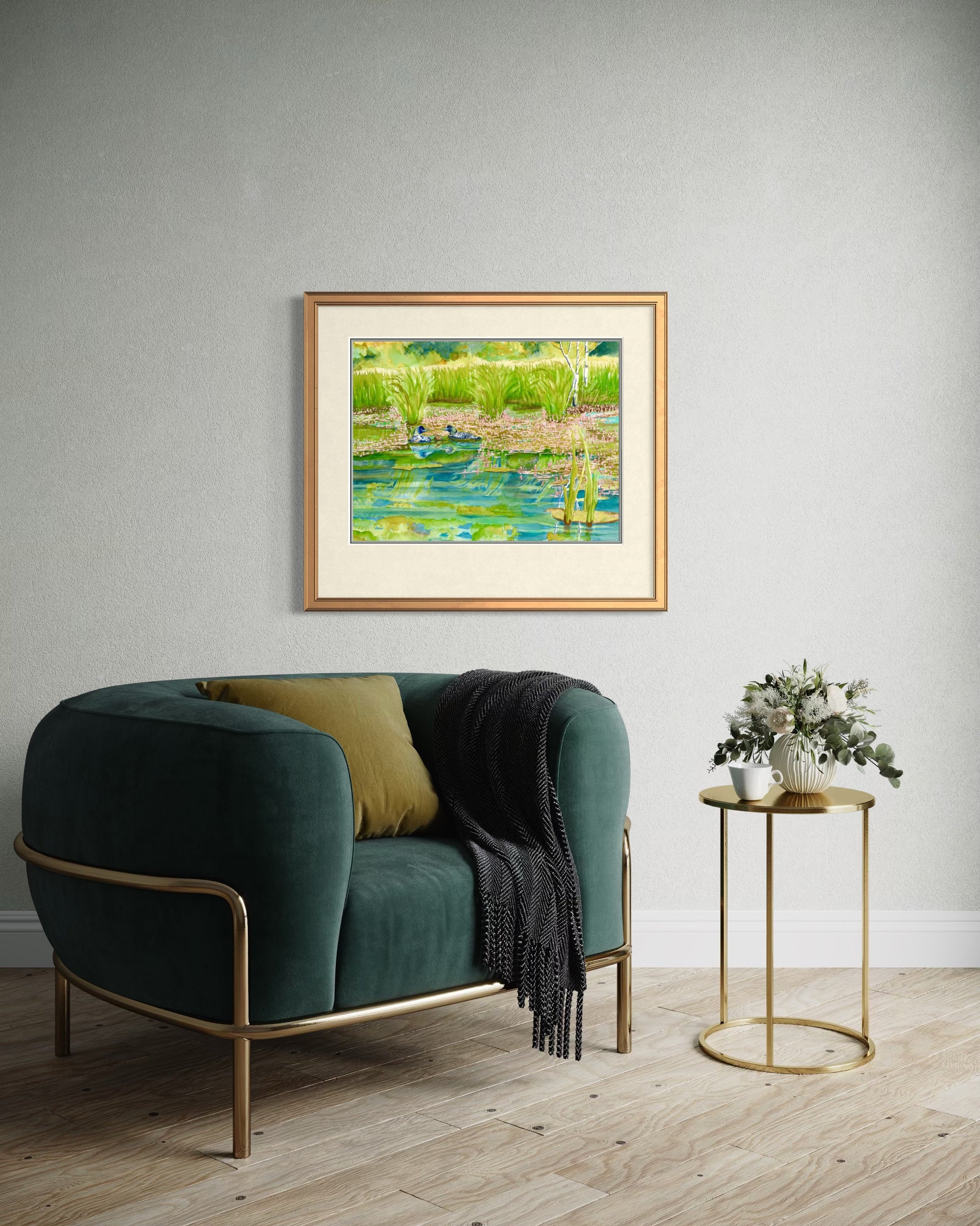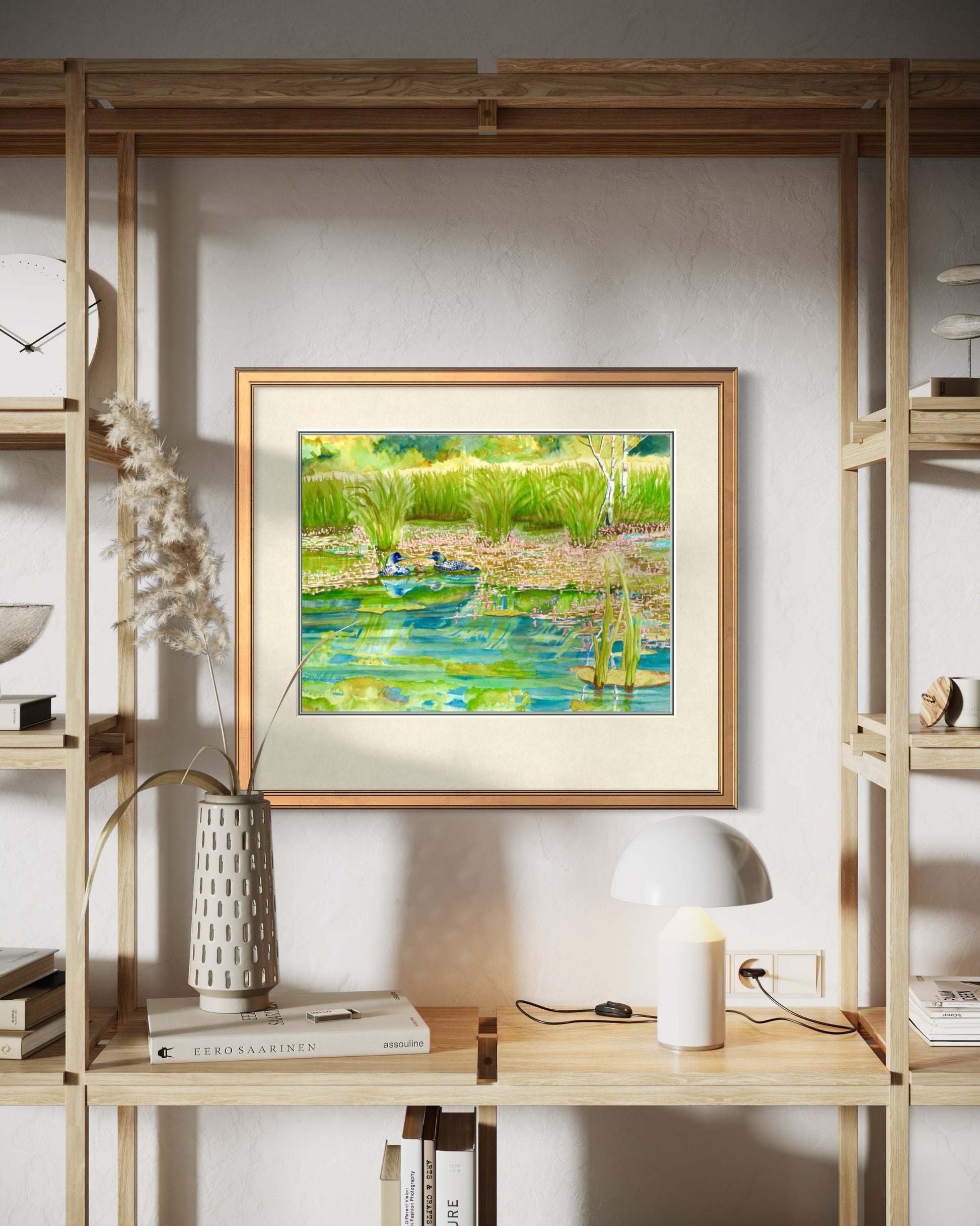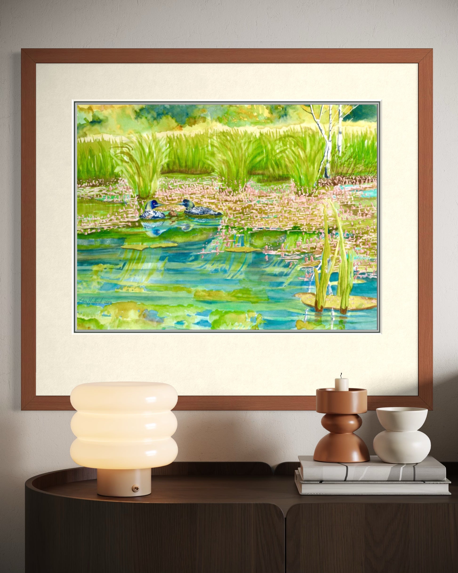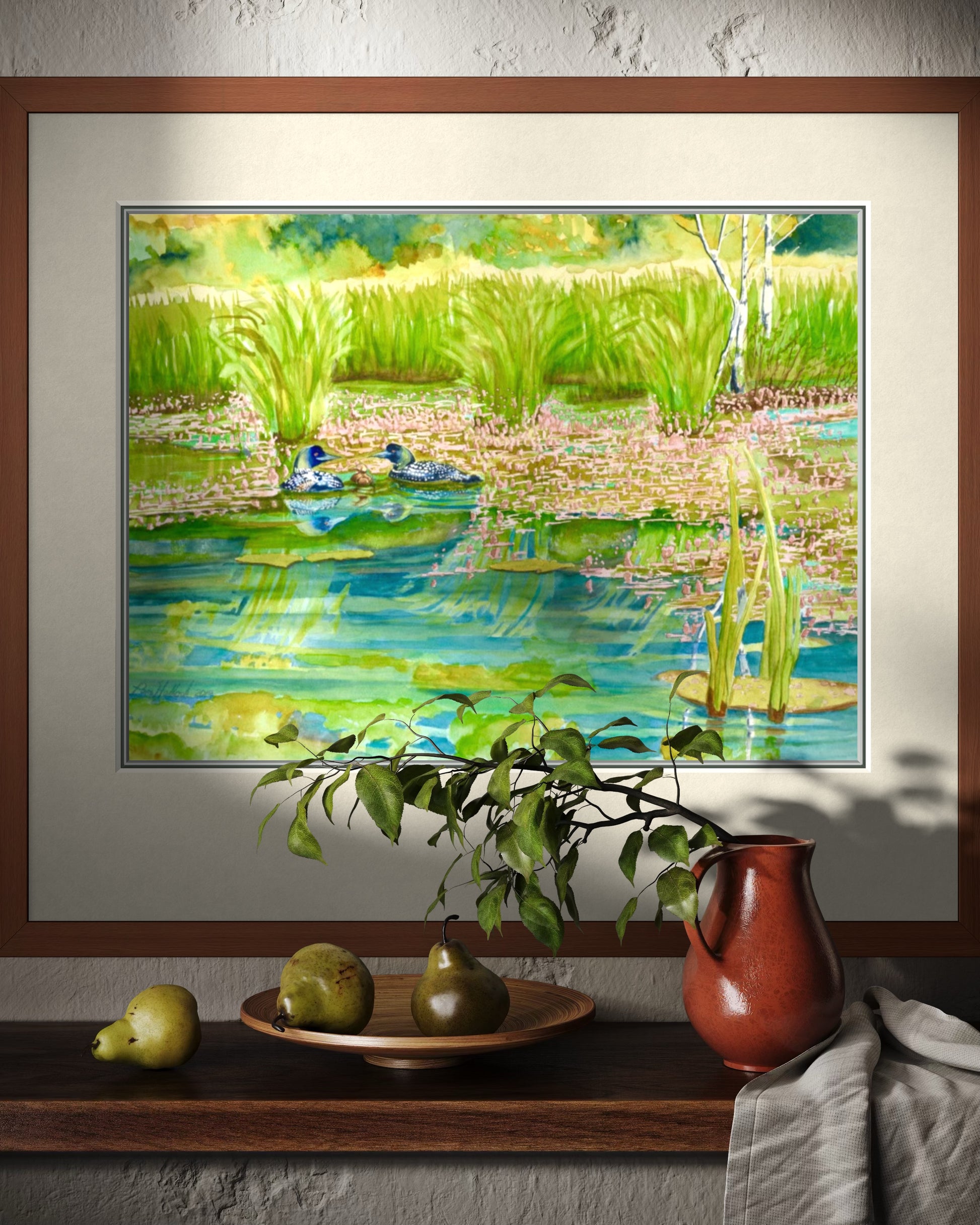 The cheerful colors and tranquil setting make this painting a joyful tribute to both the serenity of the wild and the preciousness of family bonds. Perfect for collectors of bird watercolor prints, Canadian wildlife art, and nature-inspired fine art décor.
