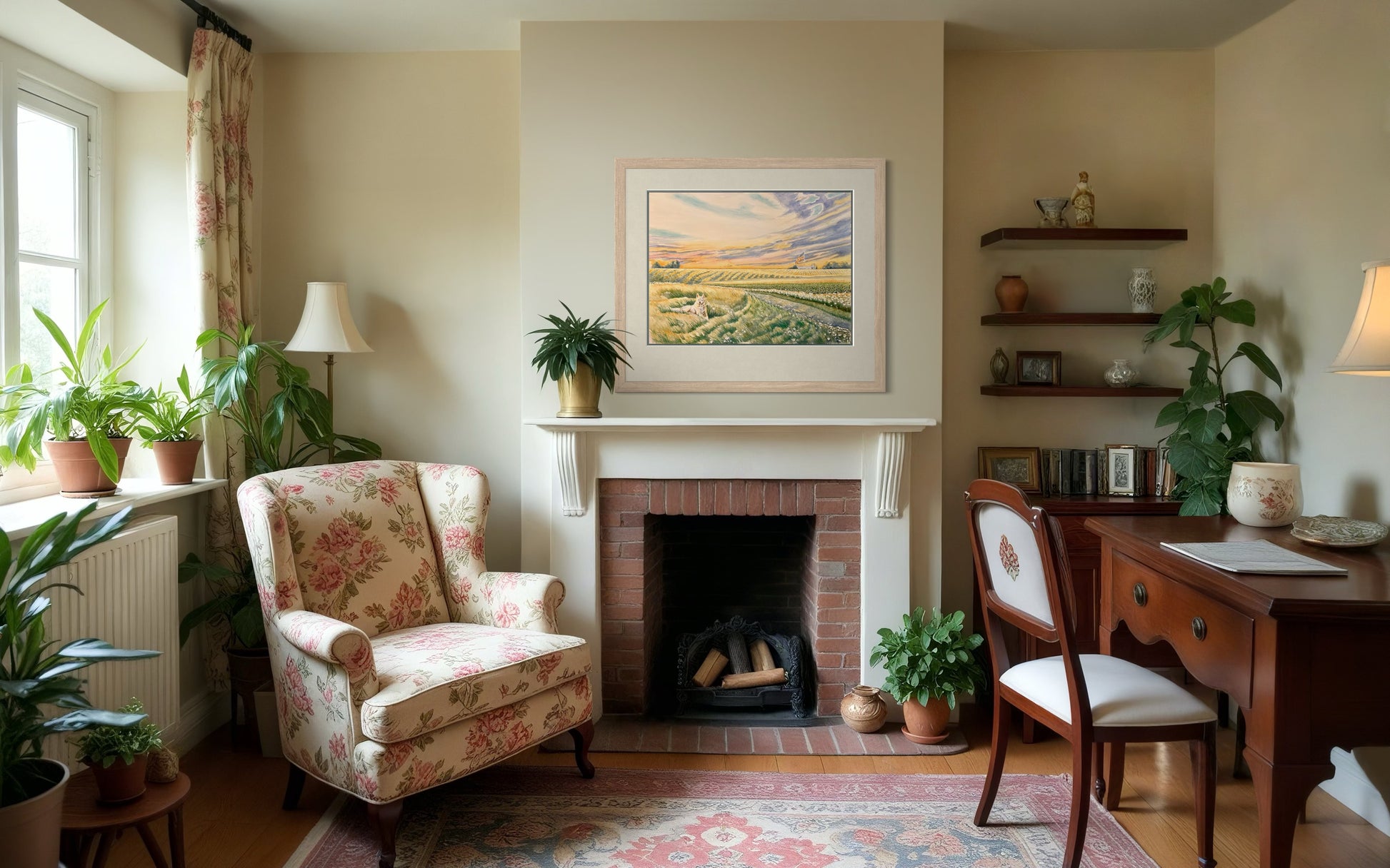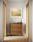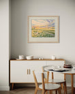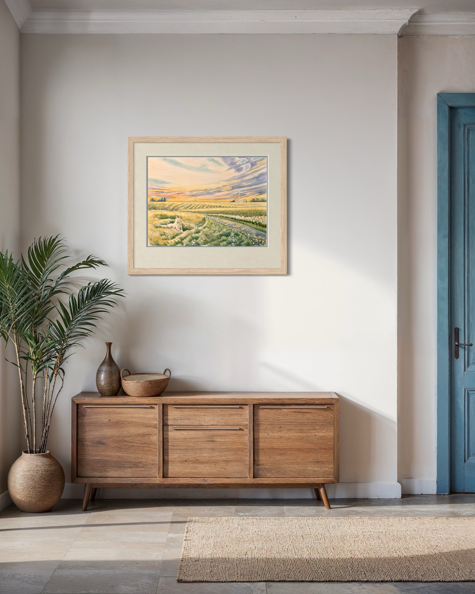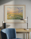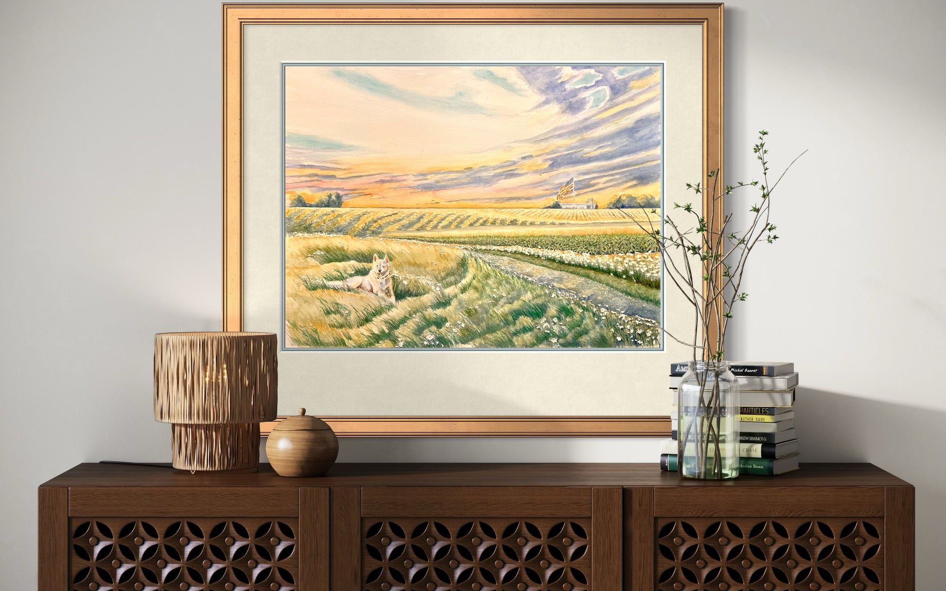 Radiant and expansive, Midwest Cornfields captures the timeless beauty of the American heartland in watercolor. Golden rows of corn stretch endlessly beneath a brilliant sky, inviting the viewer to wander into the boundless Midwest landscape. At sunrise, soft hues of pink and orange dance across the horizon as the morning sun scatters the last wisps of cloud. A proud U.S. flag, waving from a local Chevy dealership, anchors the scene in Americana.