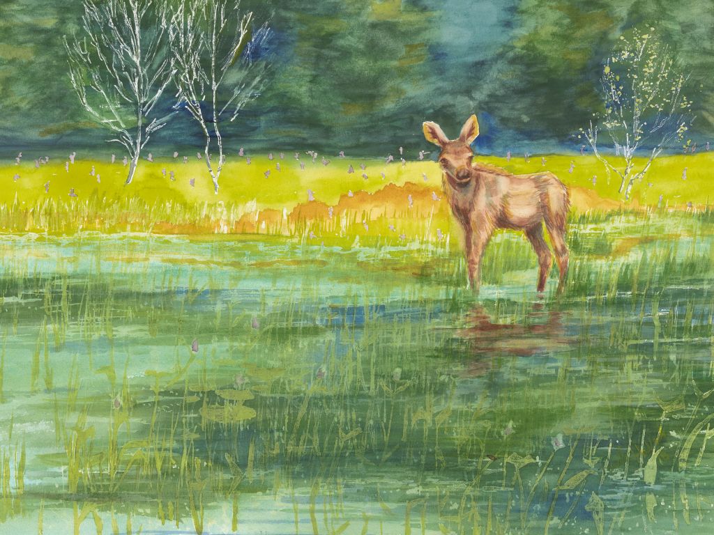 The moose calf looks so content, as if it has not a care in the world, munching away while keeping a watchful eye on its surroundings. You can almost feel the peacefulness of the moment just by looking at the painting.