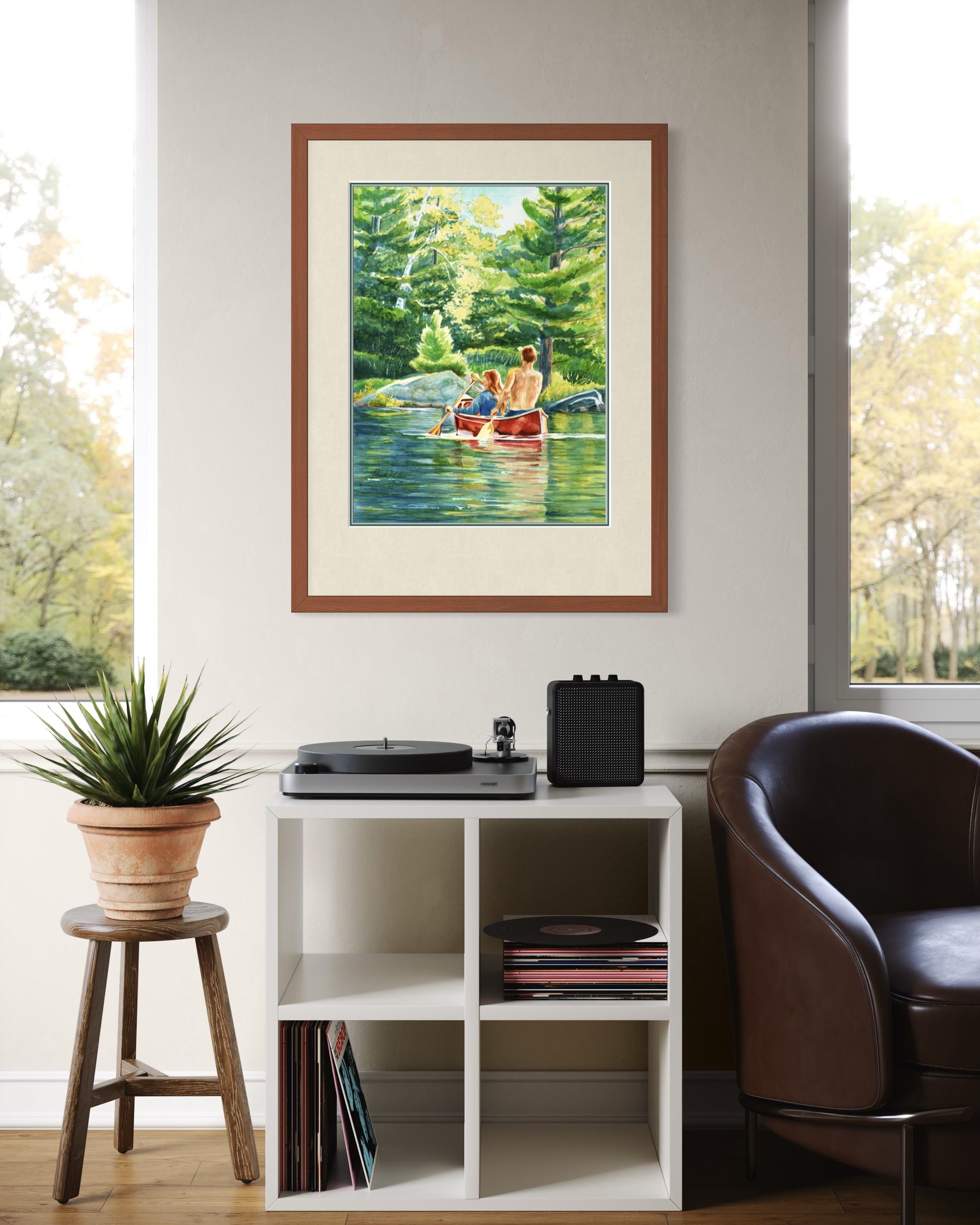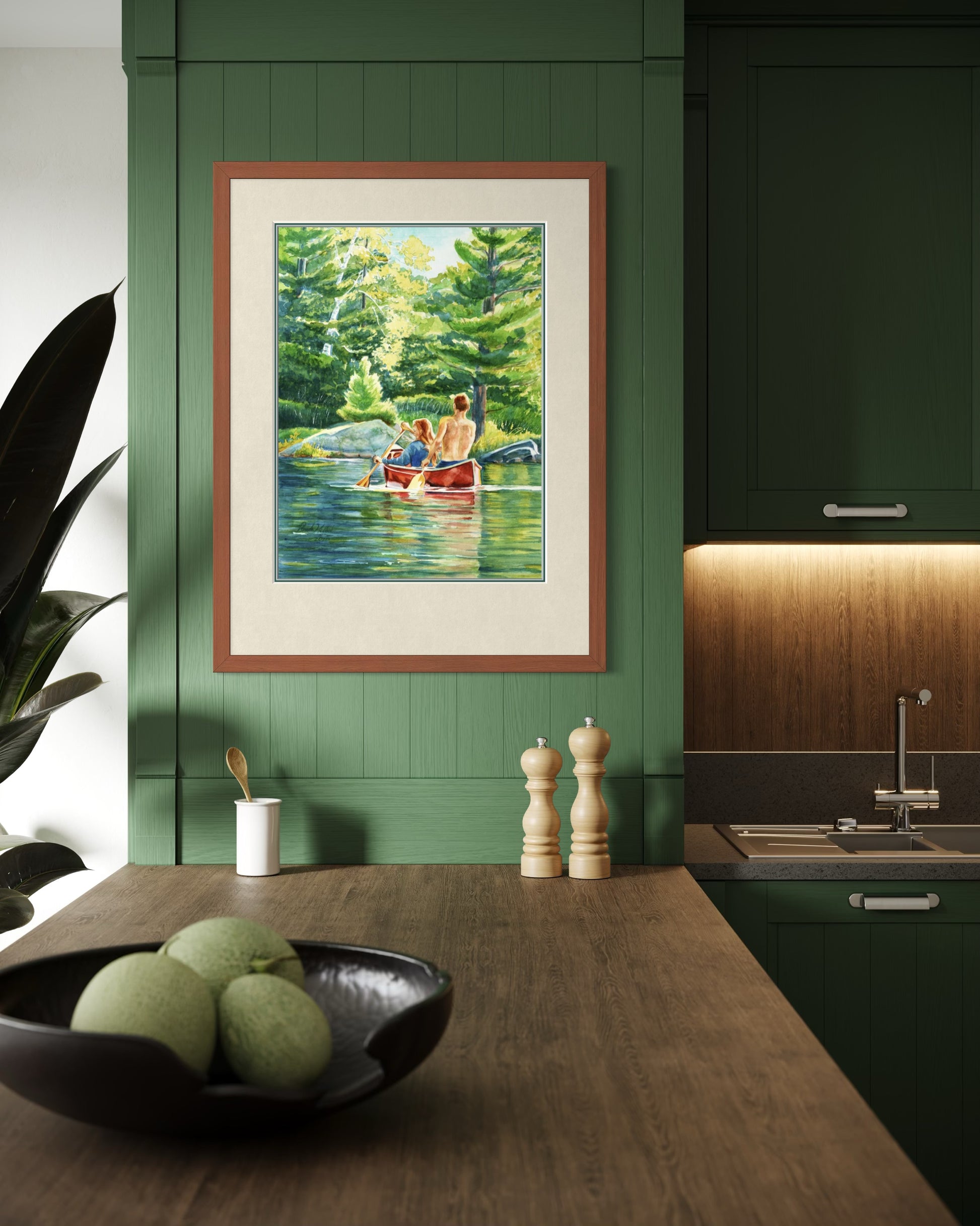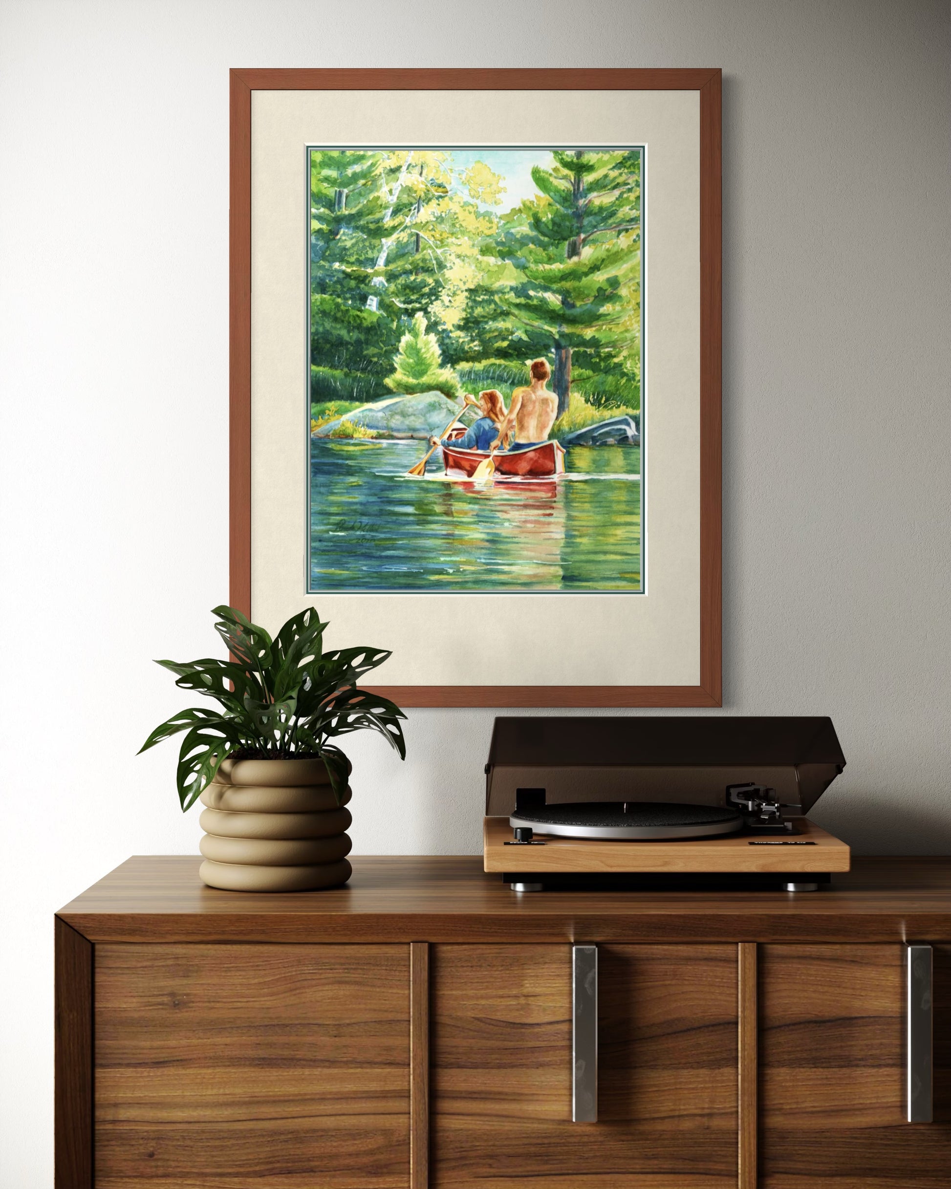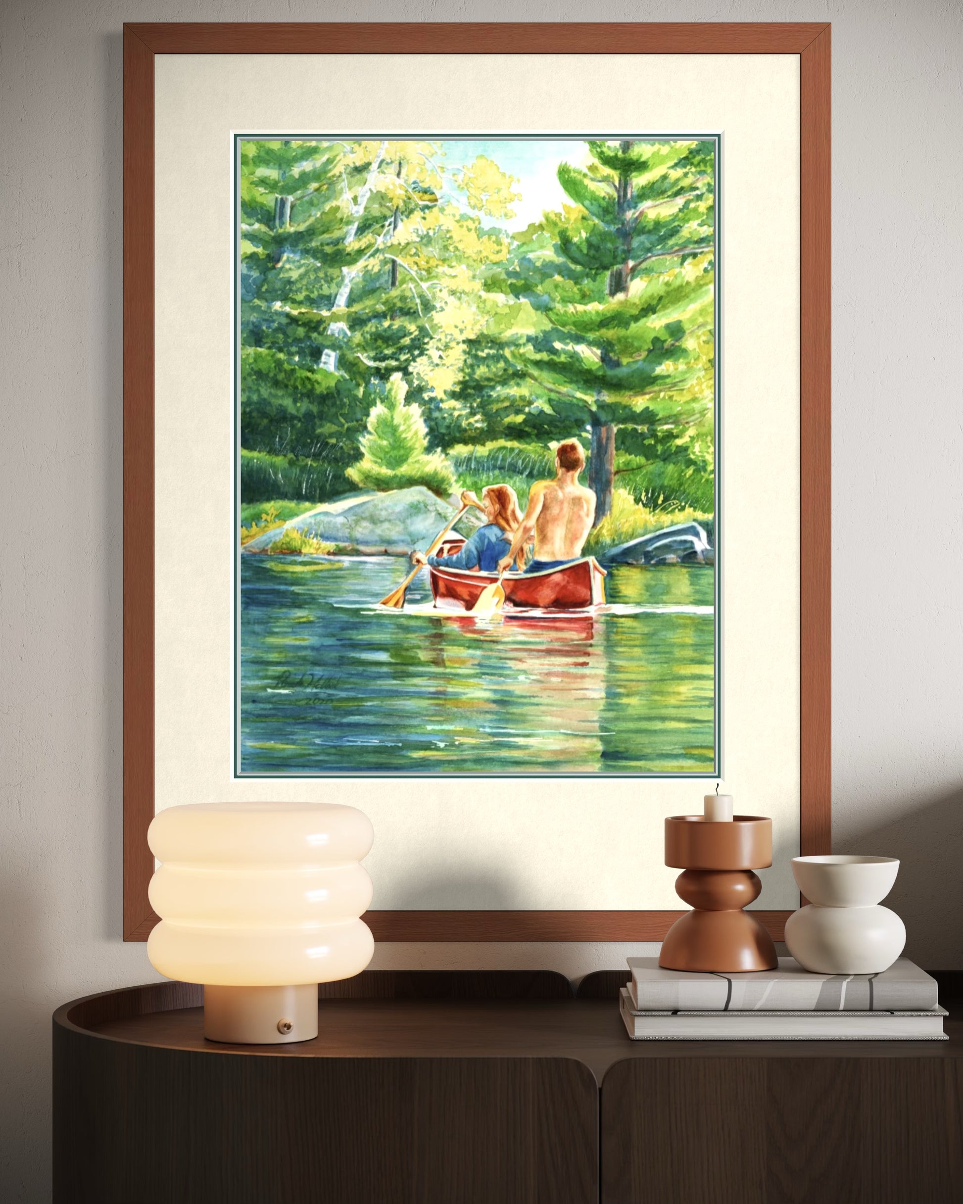Perfect for collectors of canoeing art, Canadian landscape watercolor prints, or outdoor-inspired wall décor, this piece brings the joy of summer exploration indoors.