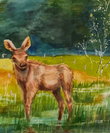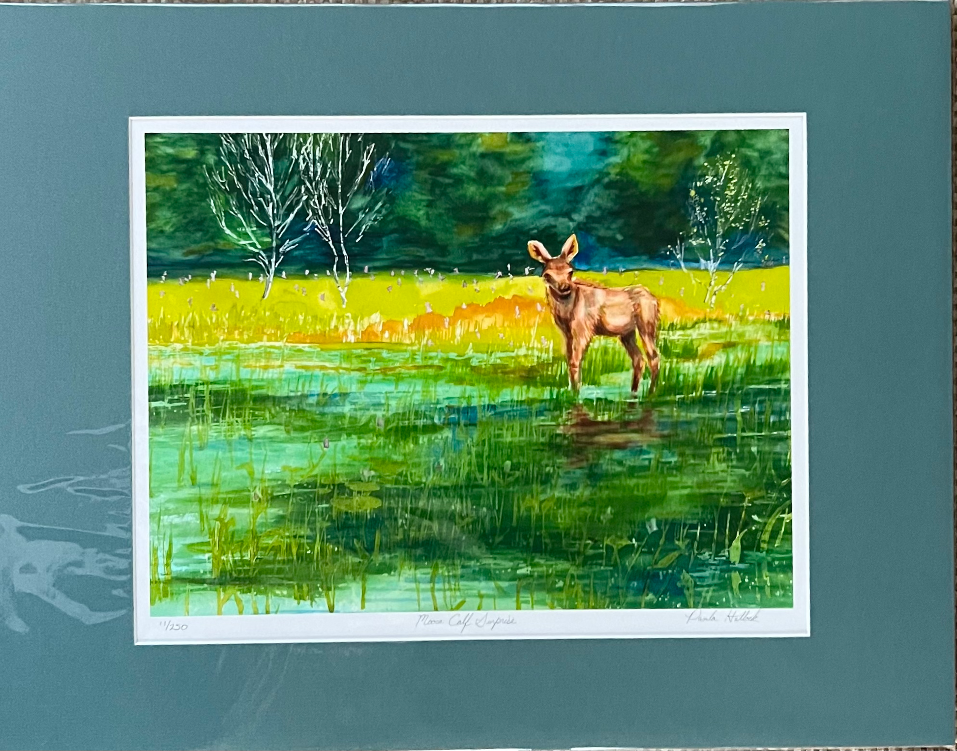 "Moose Calf Surprise" – Matted Watercolor Print, Ready to Frame