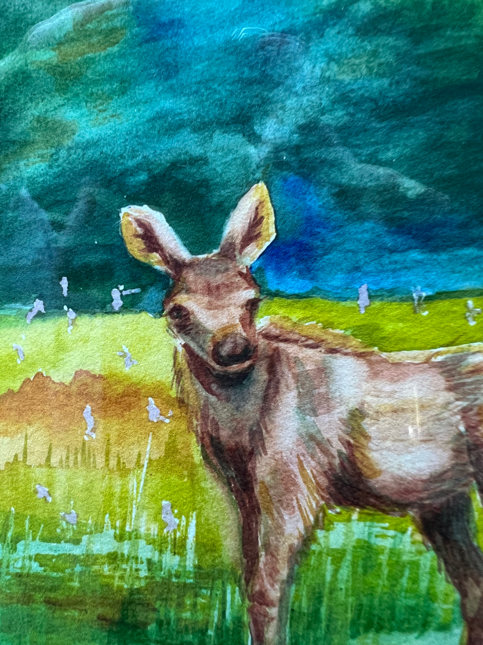 🦌 Moose Calf Surprise – Matted Watercolor Print, Ready to Frame