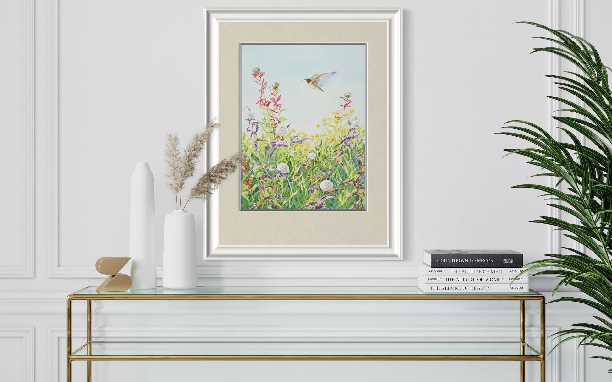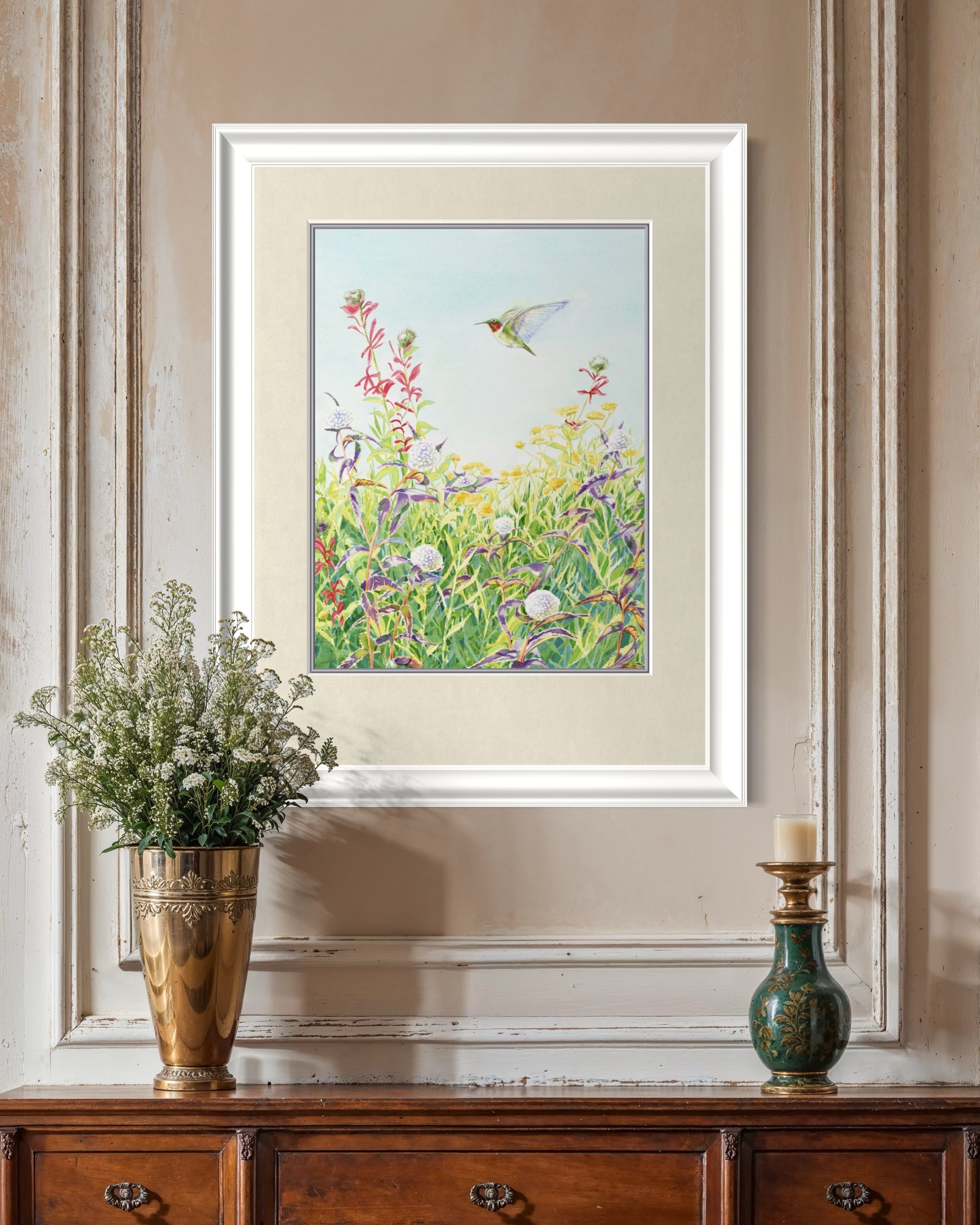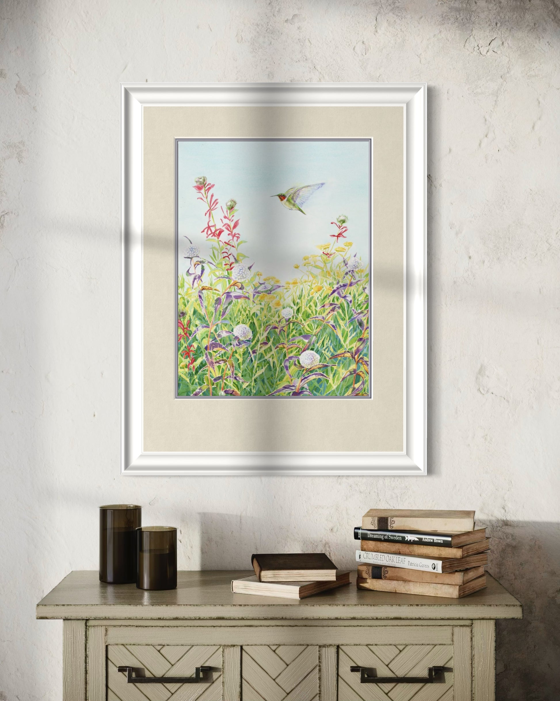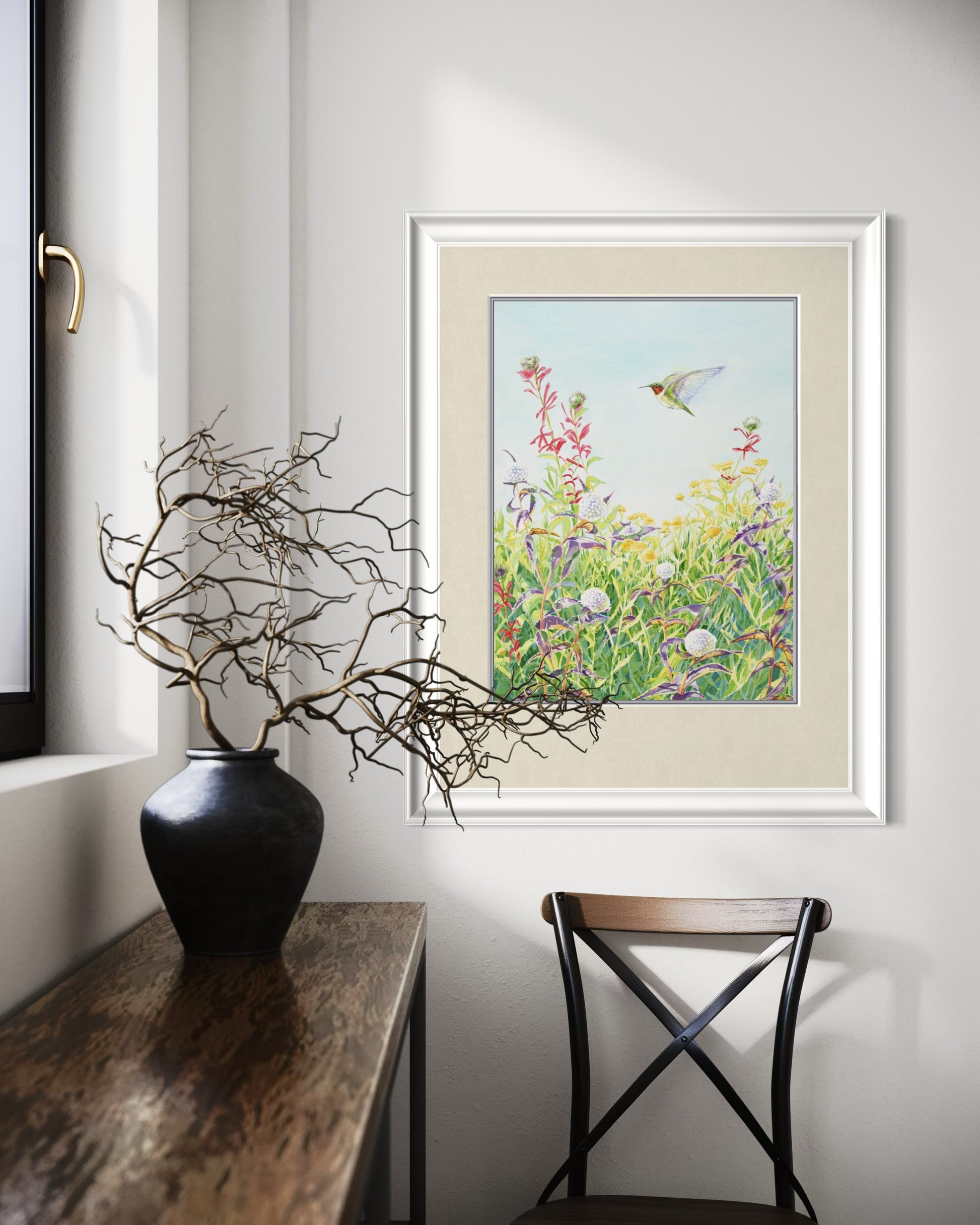Perfect for collectors of hummingbird watercolor prints, wildflower fine art, or botanical paintings, this artwork brings the freshness of a summer garden indoors. For more hummingbird art, discover "Blue Sage & Hummingbirds"