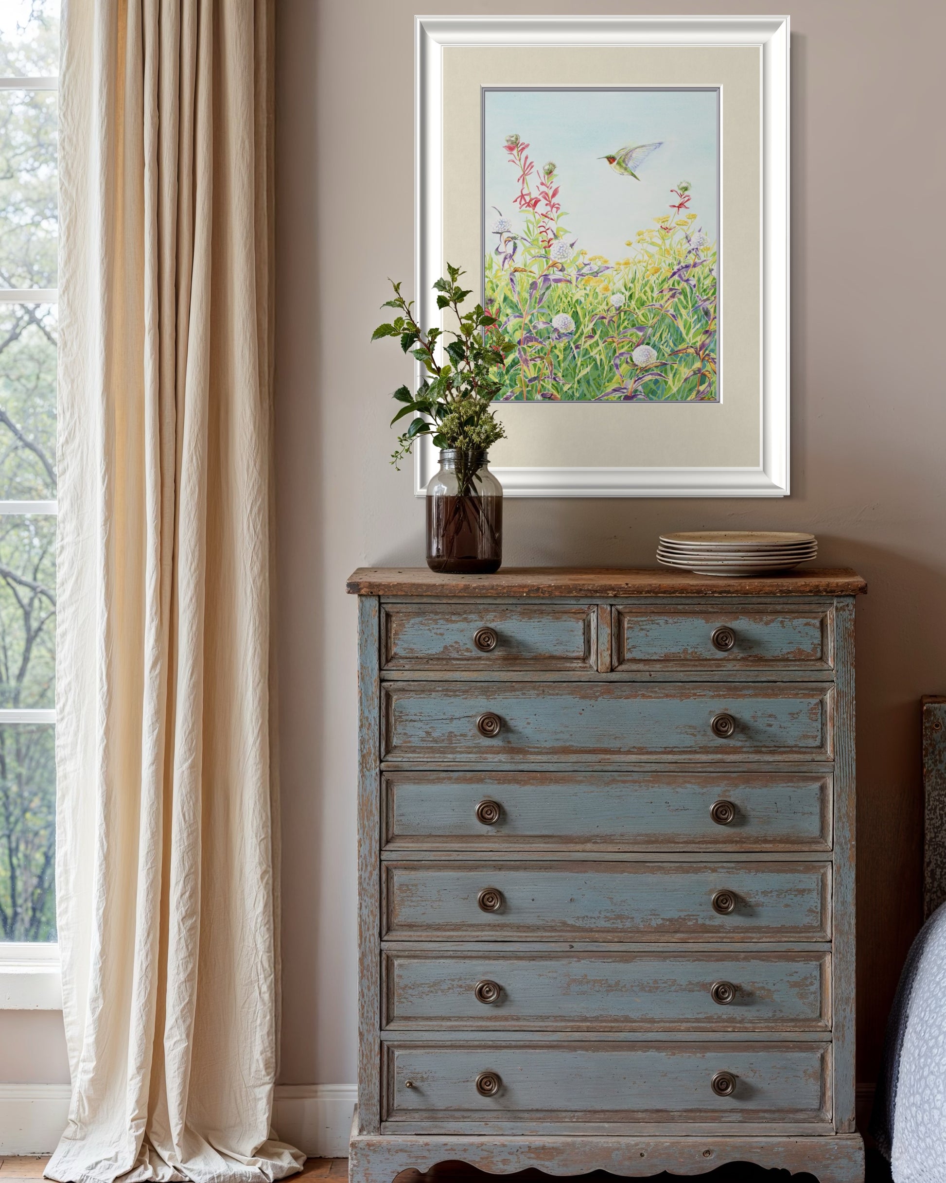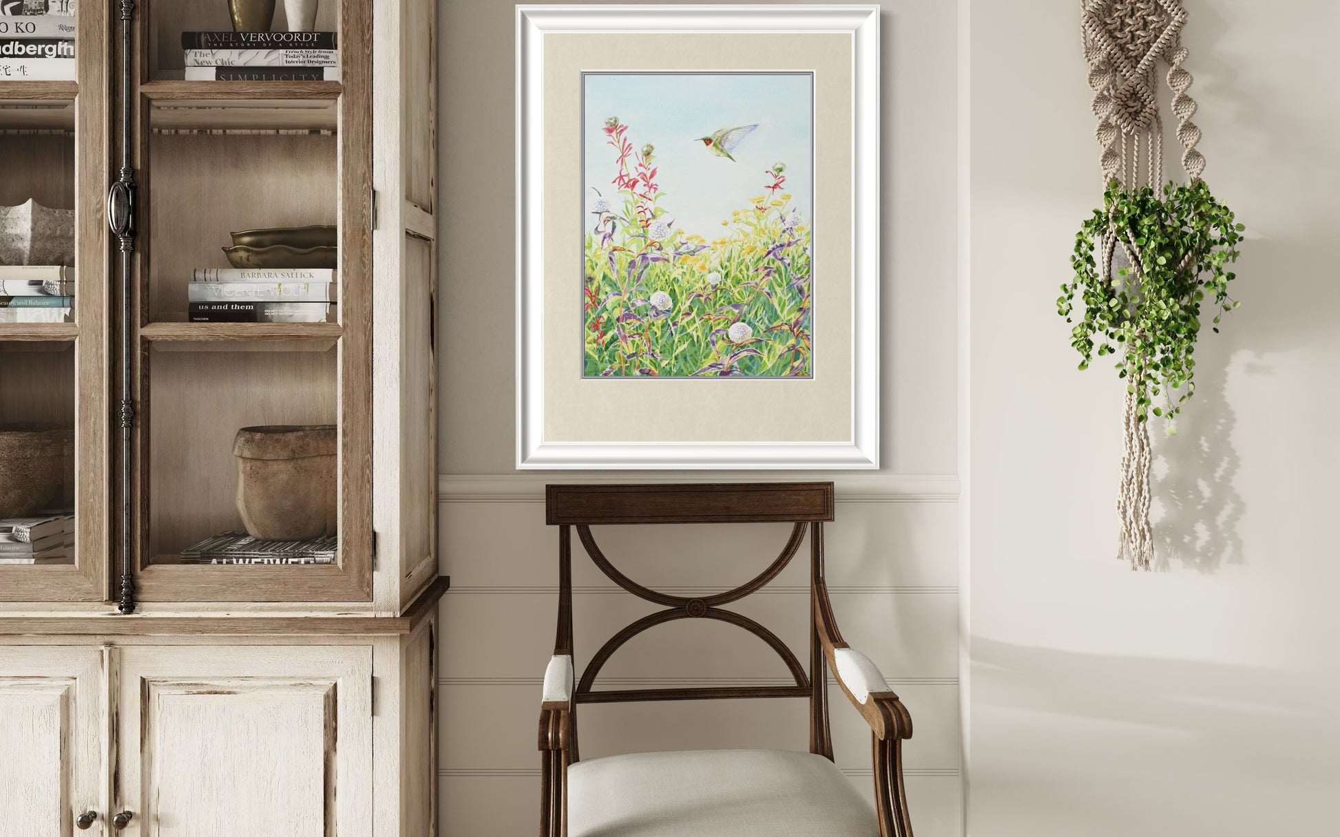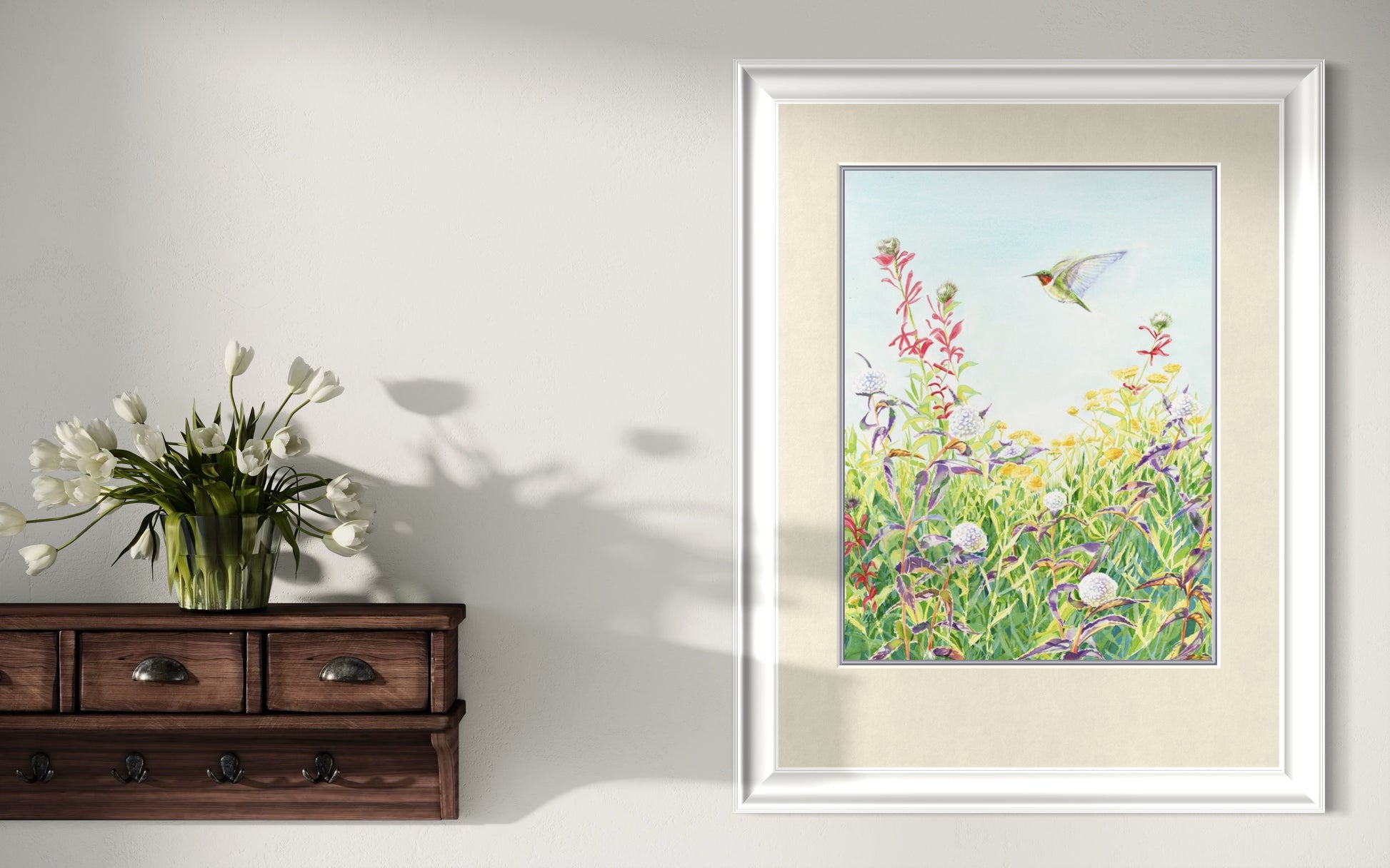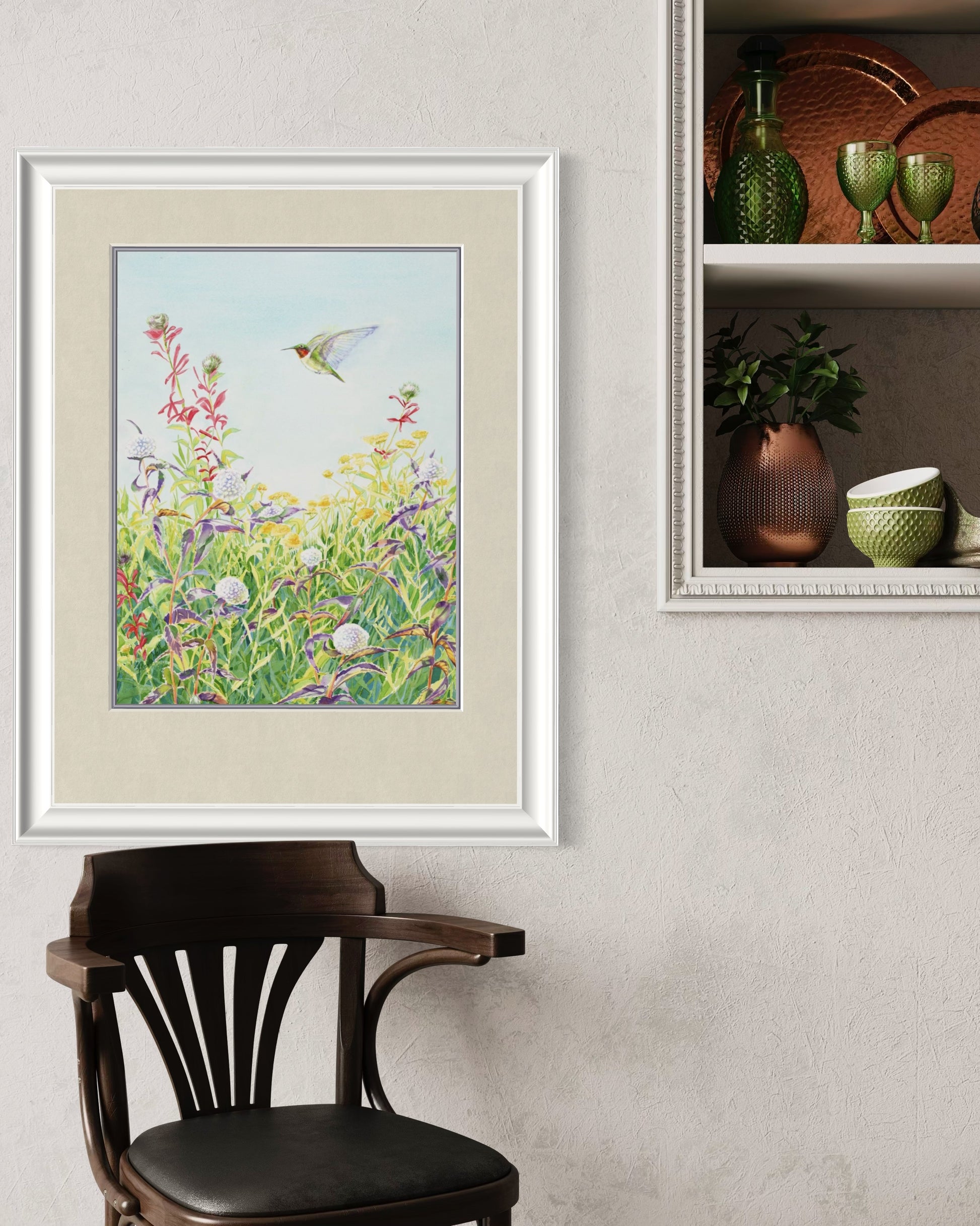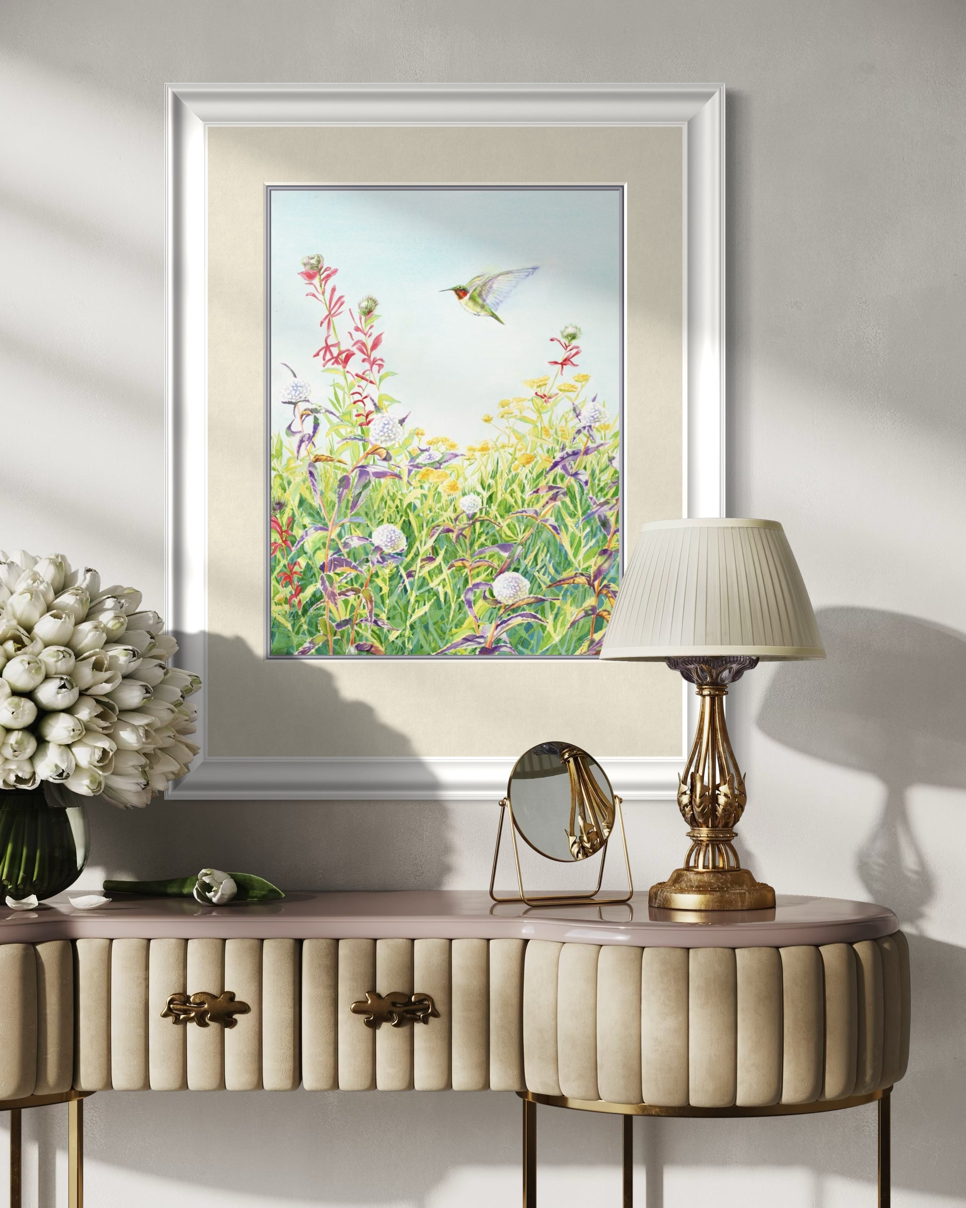 Perfect for collectors of hummingbird watercolor prints, wildflower fine art, or botanical paintings, this artwork brings the freshness of a summer garden indoors. For more hummingbird art, discover "Blue Sage & Hummingbirds"
