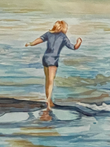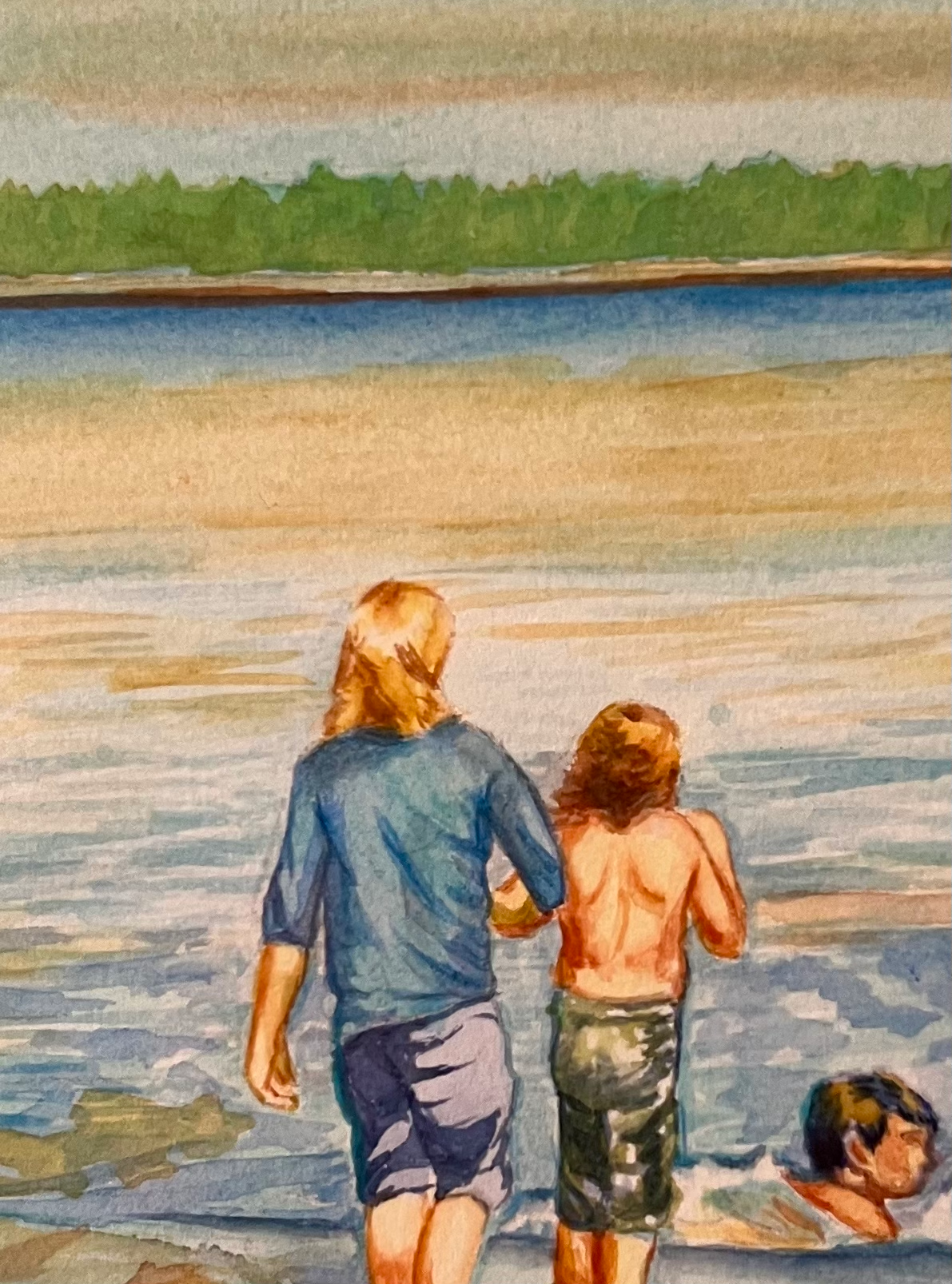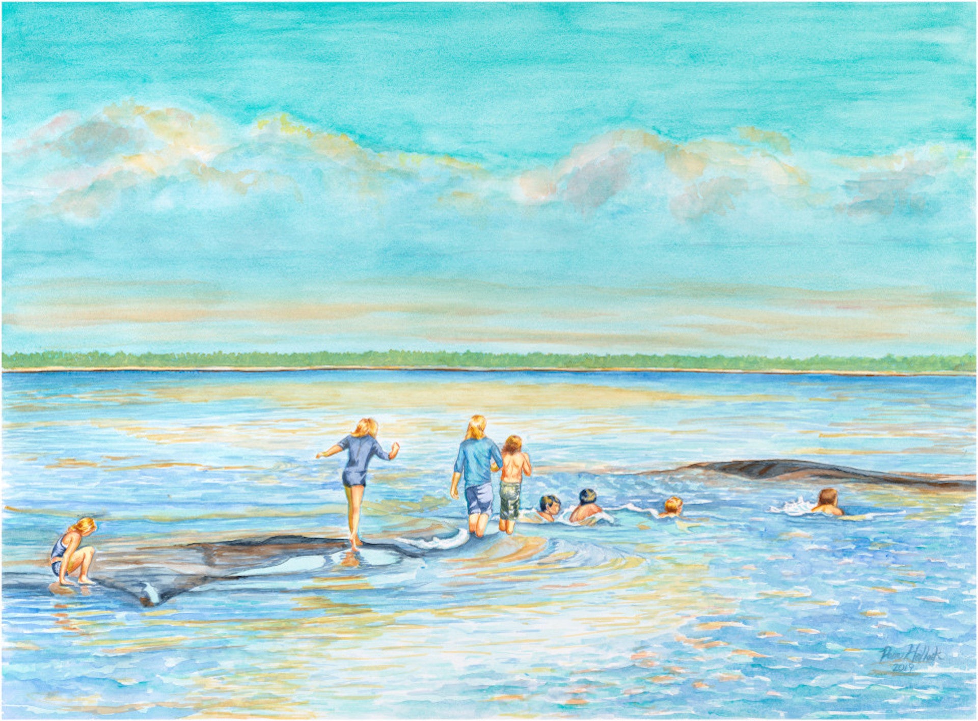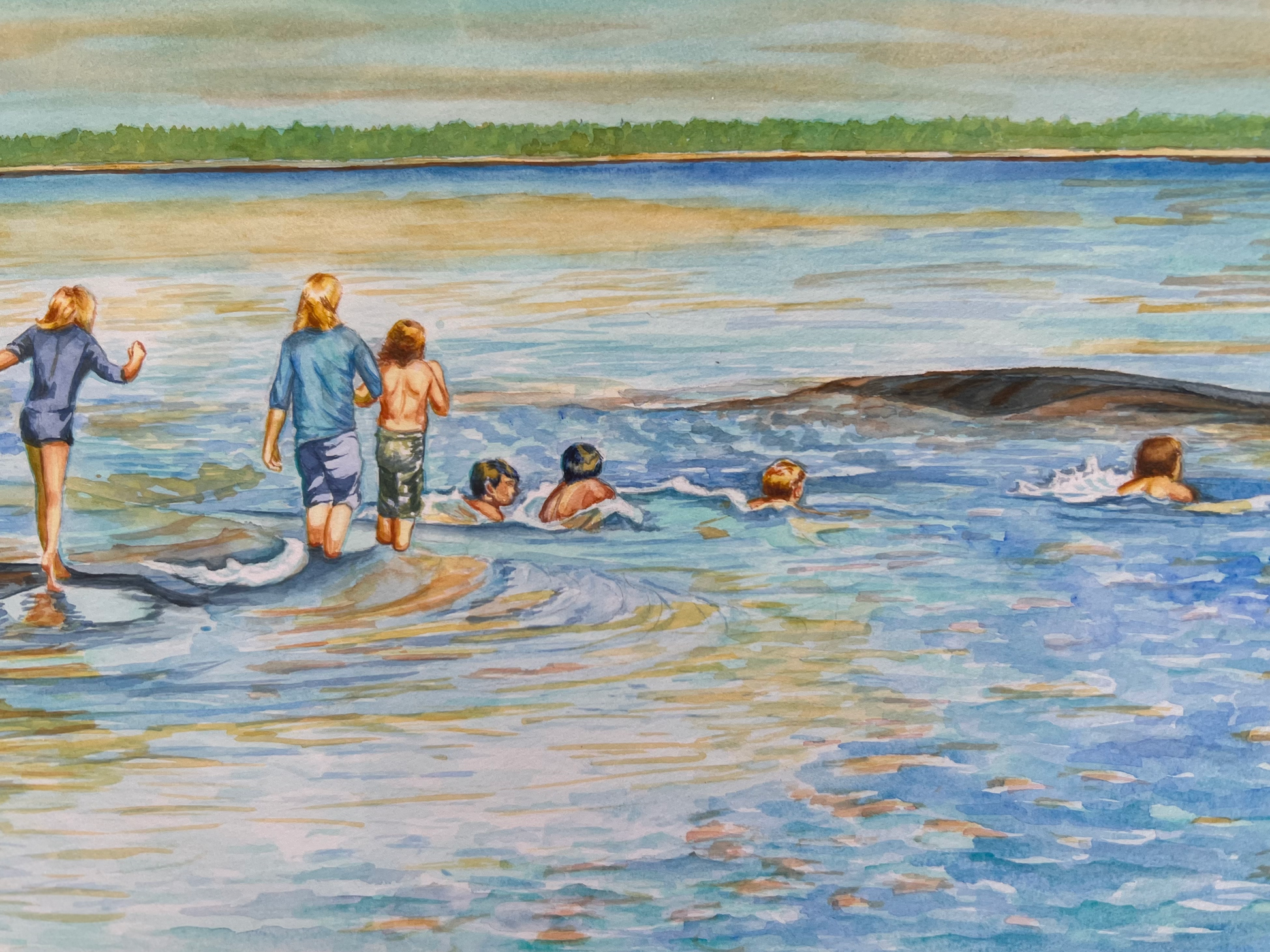 The watercolor captures friends and family leaping between the smooth pink granite shoals of Georgian Bay, swimming in crystal-clear water beneath an endless horizon and blue sky. Distant pine isles and warm sunshine complete this joyful portrait of a beloved Canadian pastime.