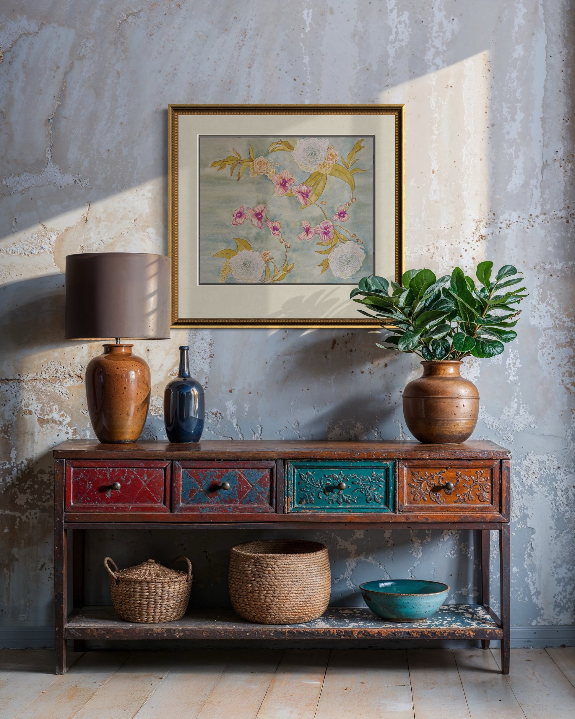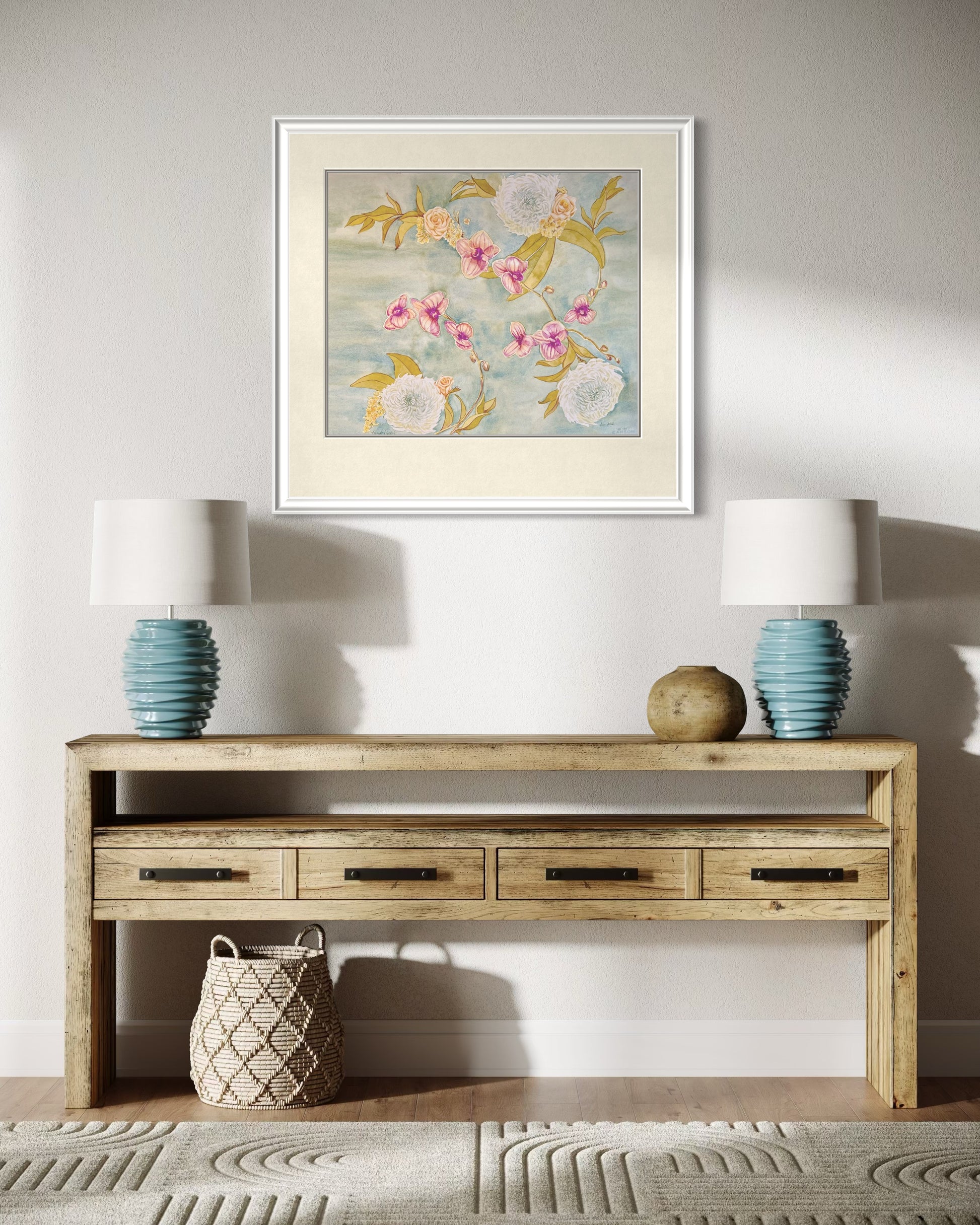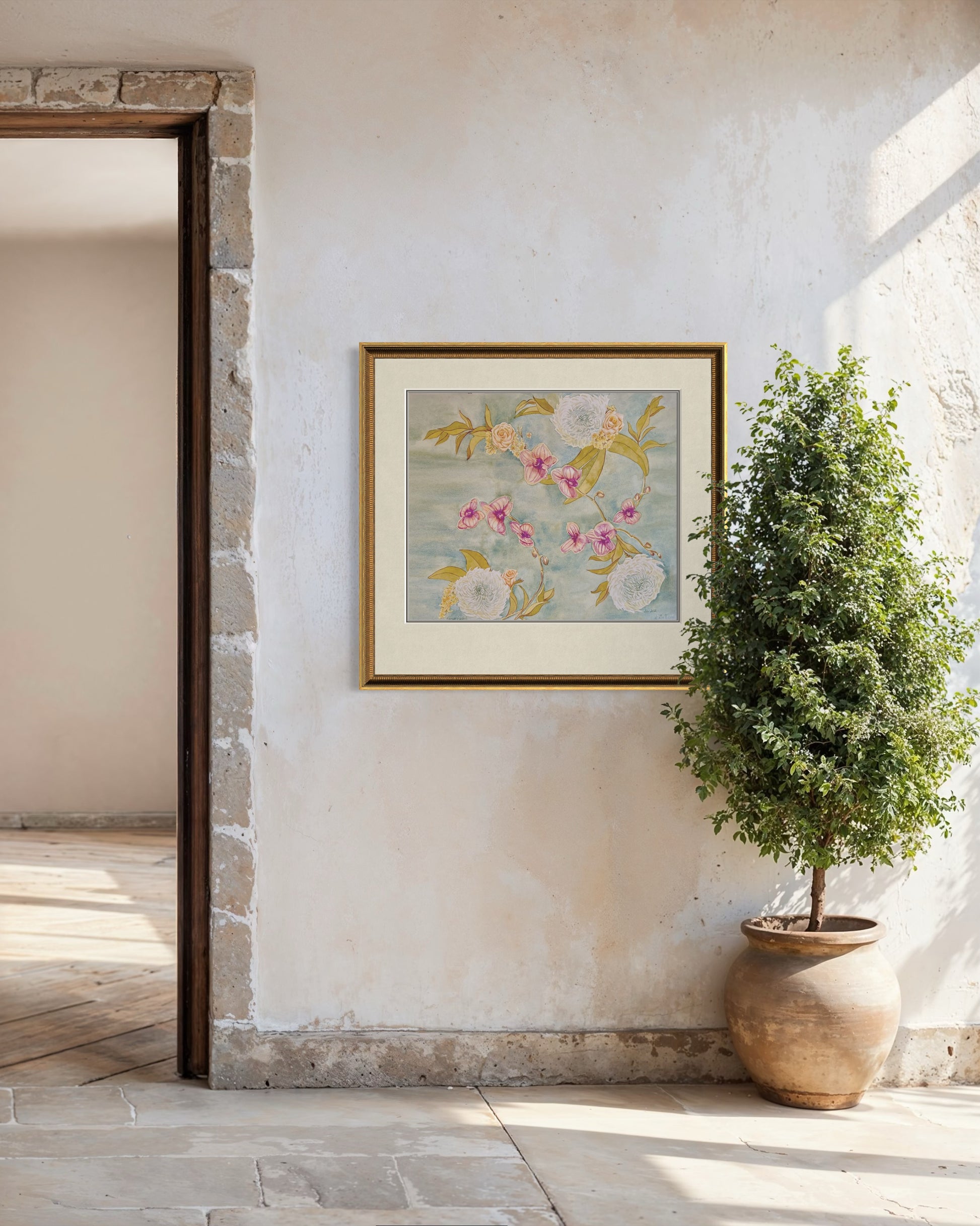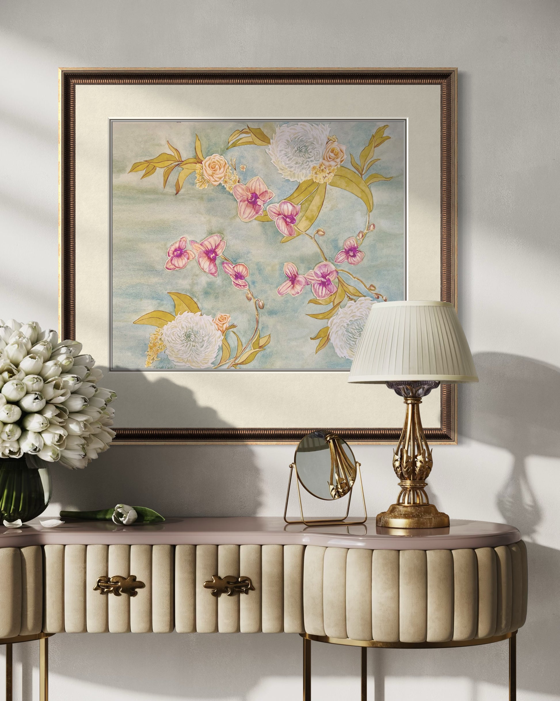 This artwork is a tribute to both the delicate beauty of flowers and the artistry of floral design, bringing warmth and sophistication into any space.
