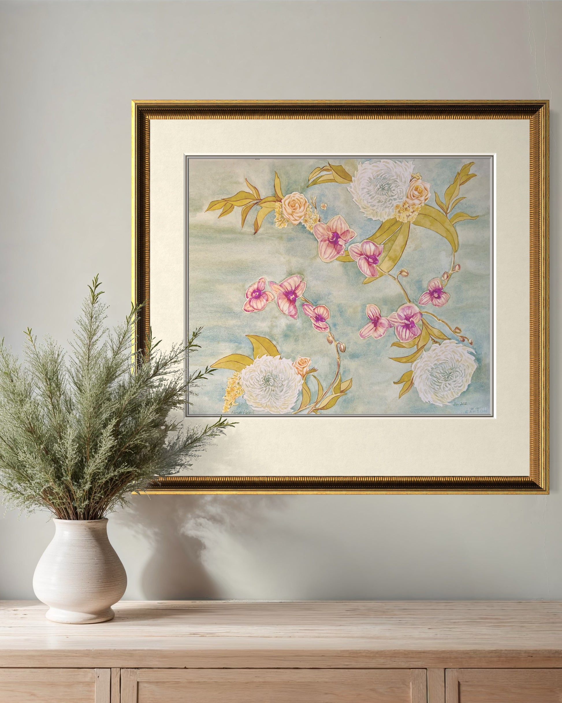 Romantic and whimsical, Swan Lake Floral captures the elegance of nature in a tapestry of blooms. Lavender orchids, peach roses, and white chrysanthemums come together in a graceful arrangement that echoes the gentle movement of swans across water. The soft palette of pastel colors creates a joyful, uplifting atmosphere—perfect for anyone who loves floral watercolor art, botanical wall décor, or nature-inspired fine art.