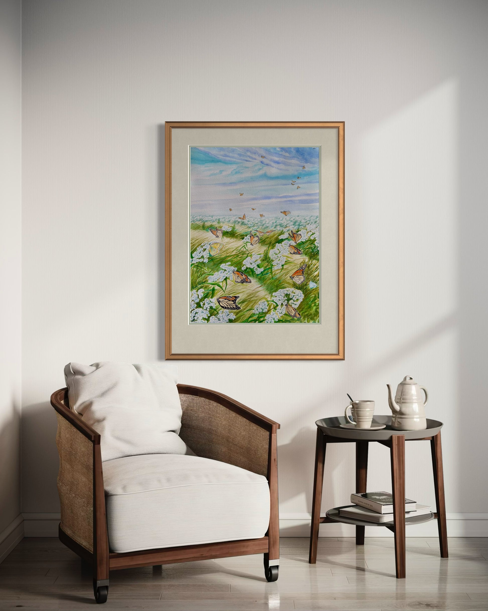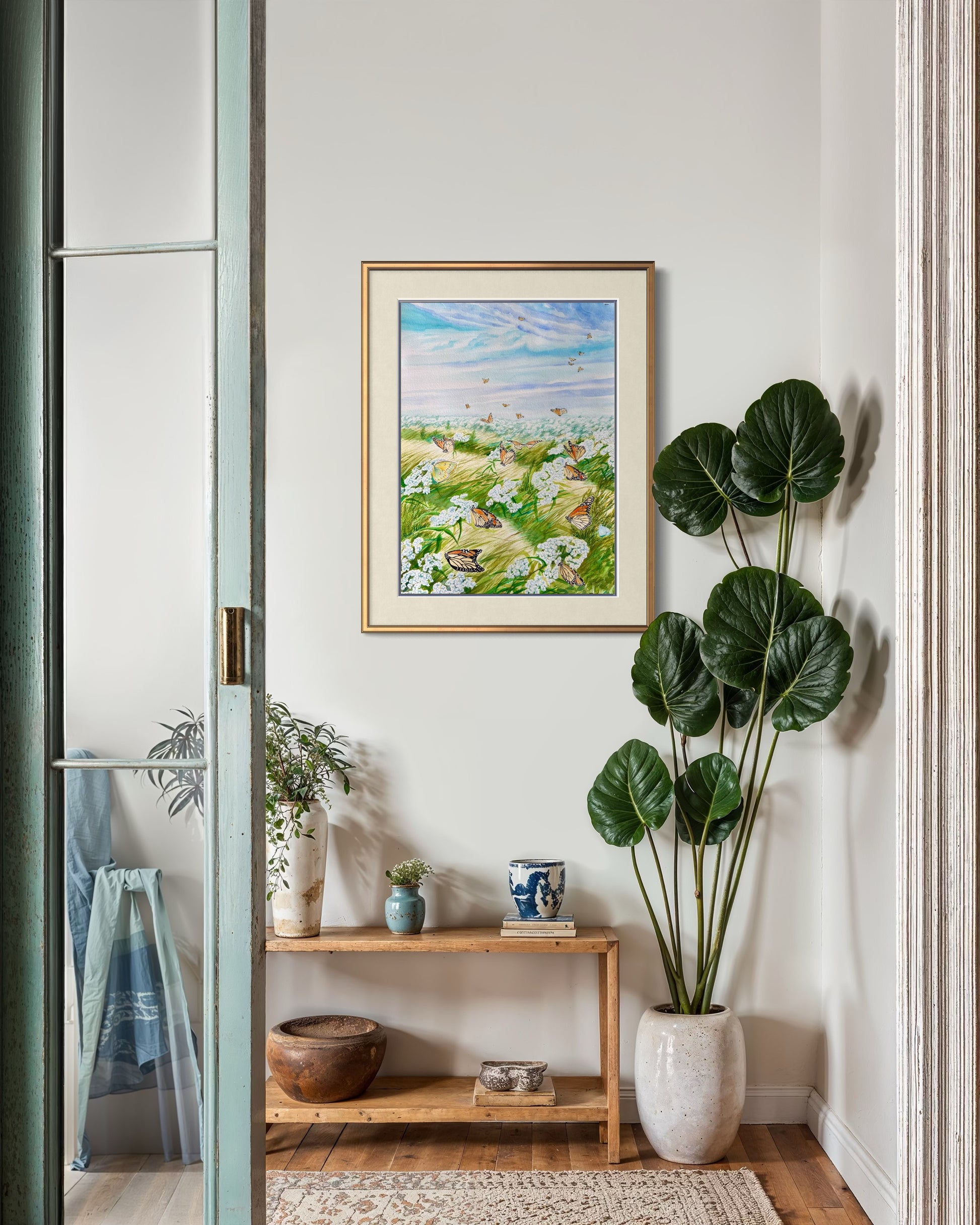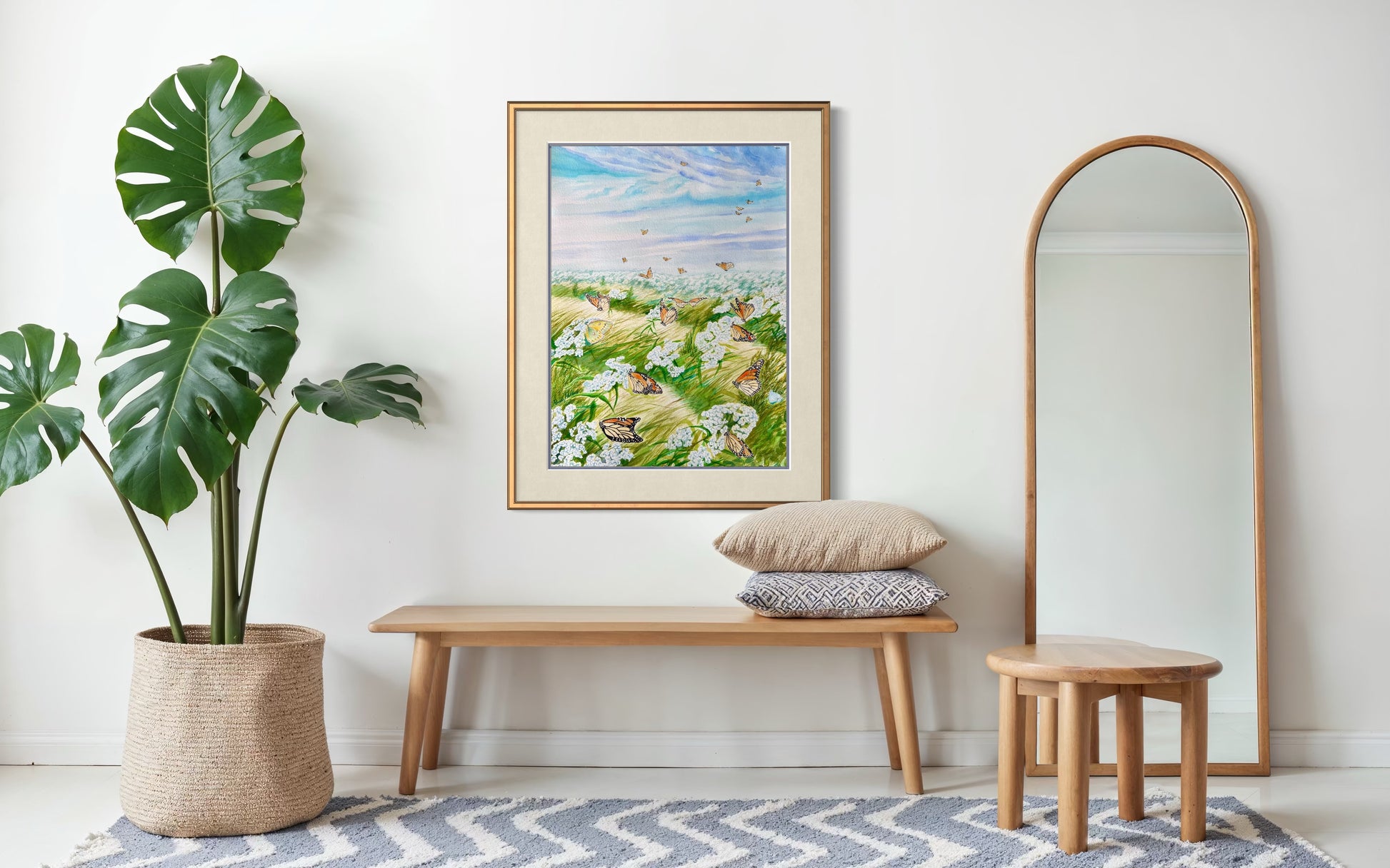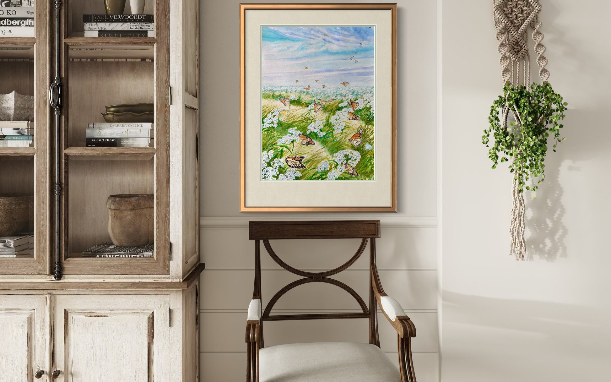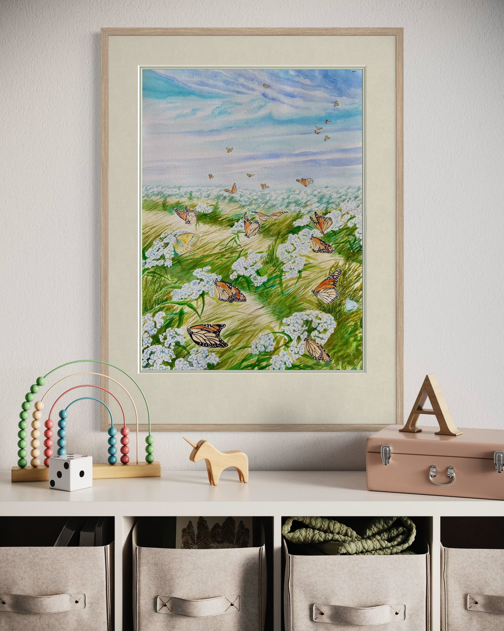 Experience the magic of The Butterfly Dance, a captivating watercolor by Pamela Hallock from the 2024 Collection. This artwork celebrates the beauty and resilience of Monarch Butterflies as they flutter gracefully across the skies of Georgian Bay. In a windswept bog, they alight on wild milkweed, laying eggs amid a confetti of wings, sunshine, and wind. The painting captures this fleeting, enchanting moment in nature’s rhythm—a celebration of transformation, migration, and life’s delicate dance. For nature and garden lovers, discover "Signs of Spring".