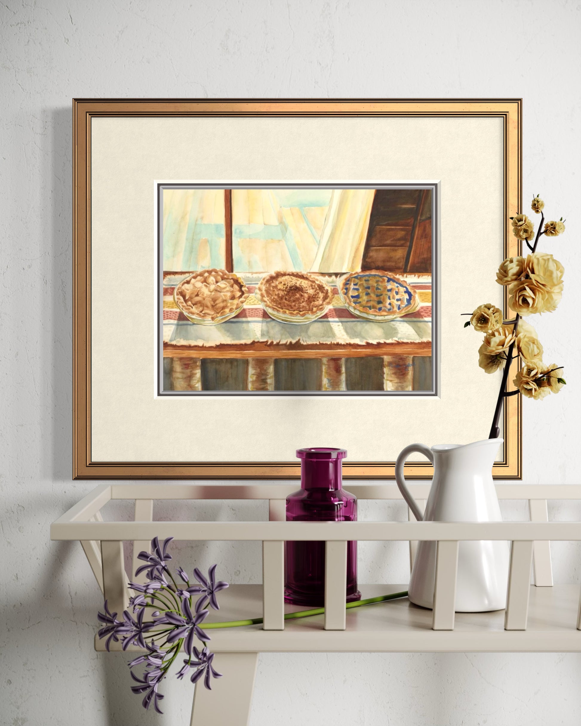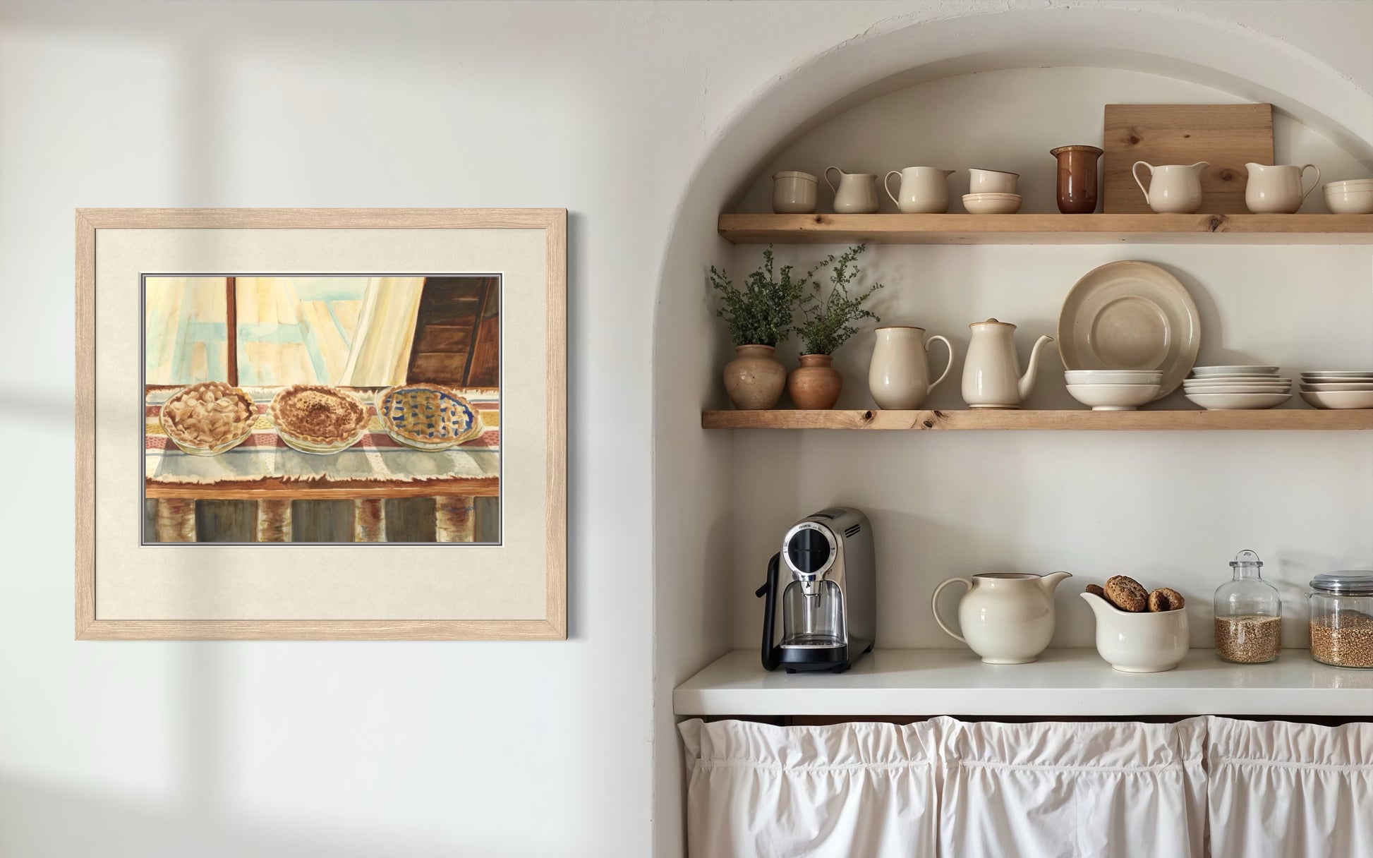 Warm and nostalgic, Three Pies on the Windowsill captures the joy of childhood wonder and the simple pleasures of home. Golden-crusted peach, apple, and blueberry pies cool on the sill, their bubbling fruit filling spilling over in delicious anticipation.