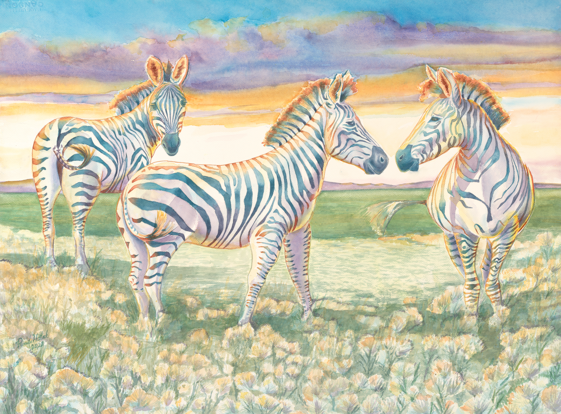 Playful and striking, Zebra Brothers celebrates the charm of Vern, Earl, and Stewart—the bachelor trio from the Cincinnati Zoo & Botanical Garden. Their bold black-and-white stripes glow under the hues of a lavender and orange sunset, while the soft fragrance of white blossoms enhances the atmosphere of peace and beauty. Standing close together, these zebras show off their unbreakable bond and joyful personalities, a lively reflection of friendship and the beauty of wildlife.